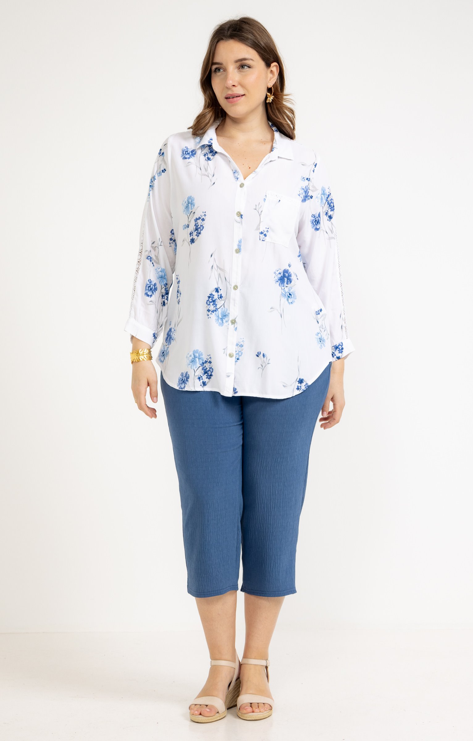 Pantacourt jean imprimé fleurs blanches