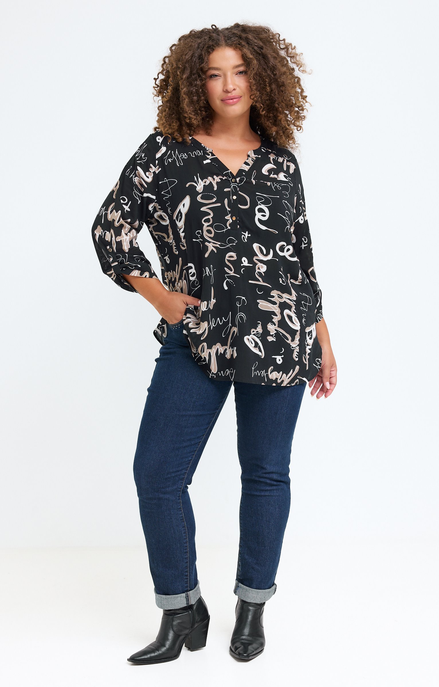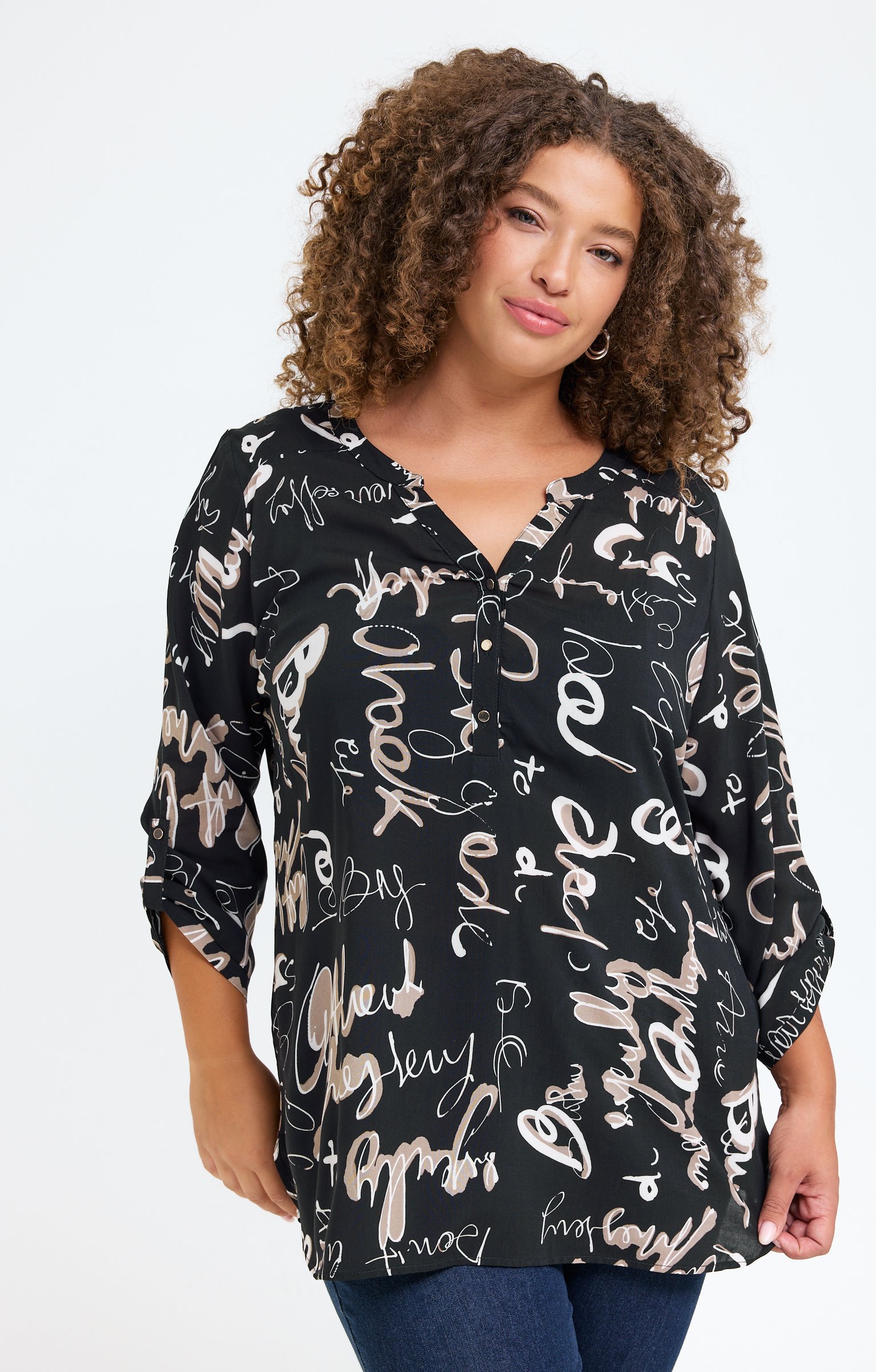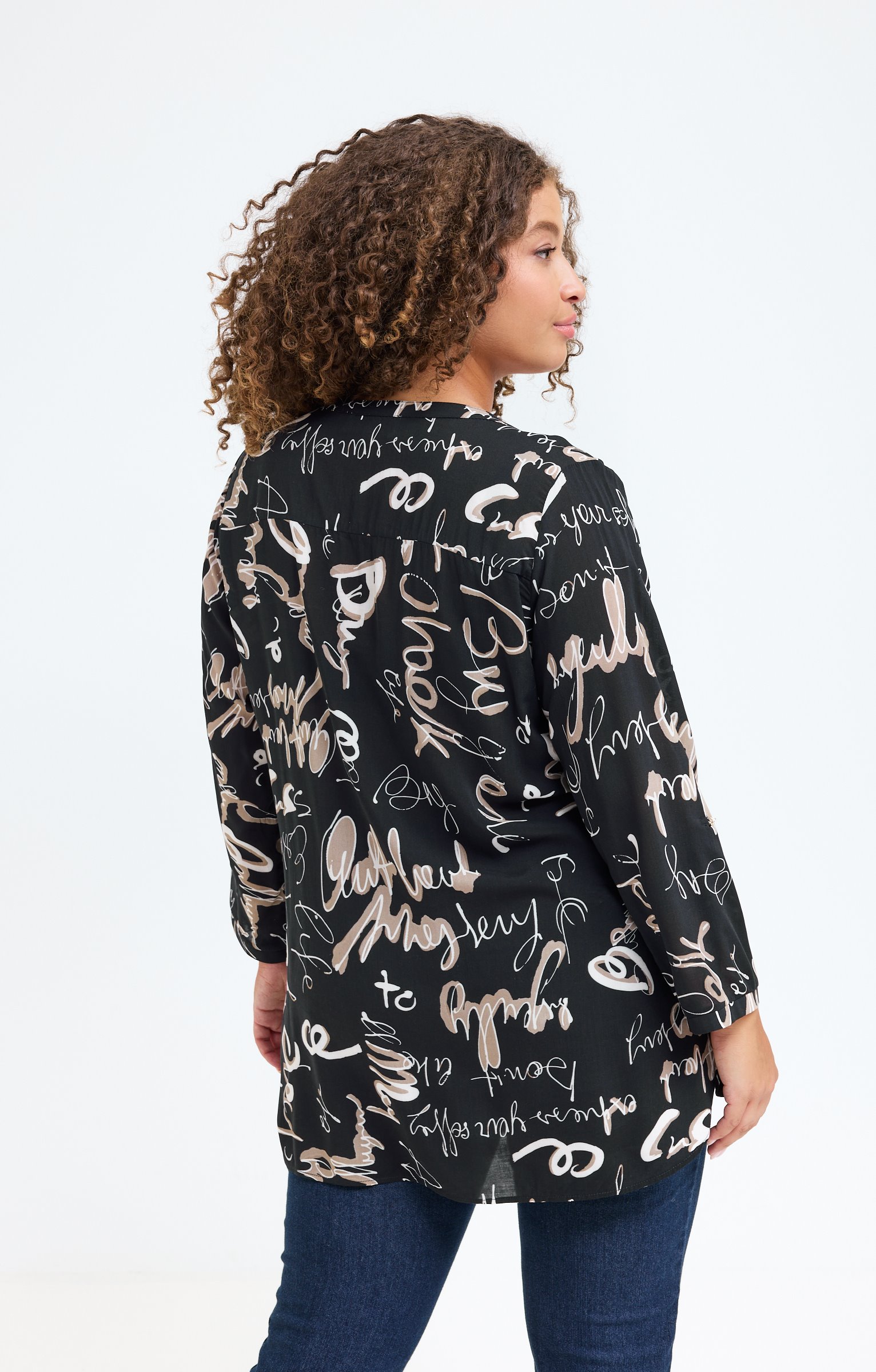 Blouse imprimée avec inscriptions. Coupe droite ample. Longueur sous les fesses. Manches 3/4 ajustables par une patte boutonnée. Col tunisien fermé par des boutons. Imprimé à motifs inscriptions sur fond uni sur l'ensemble du modèle. Découpe horizontale dans le haut du dos. Composition 100 % viscose ECOVERO™.