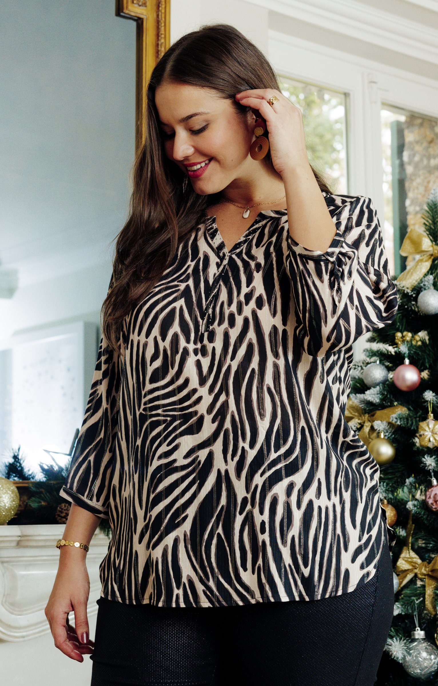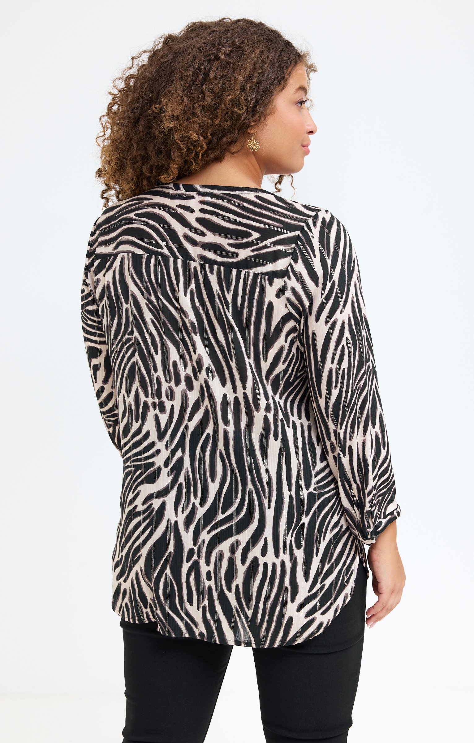 Blouse imprimée avec rayures métallisées. Coupe droite. Longueur sous les fesses. Manches 3/4 ajustables avec poignets boutonnés. Petit col V orné de strass. Imprimé à motifs zébrés sur fond à rayures verticales métallisées sur l'ensemble du modèle. Découpe horizontale dans le haut du dos.