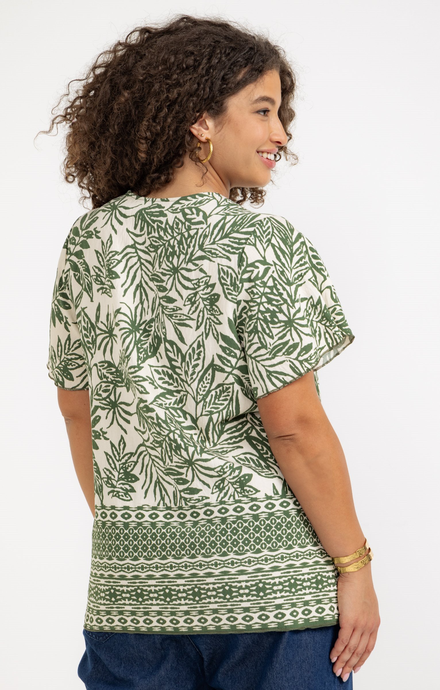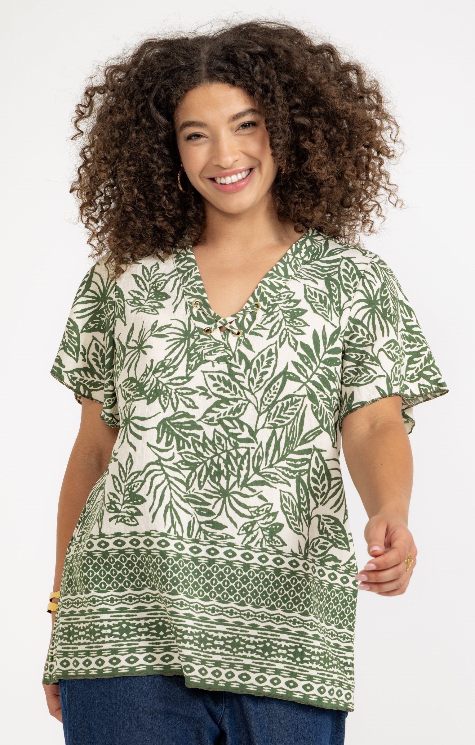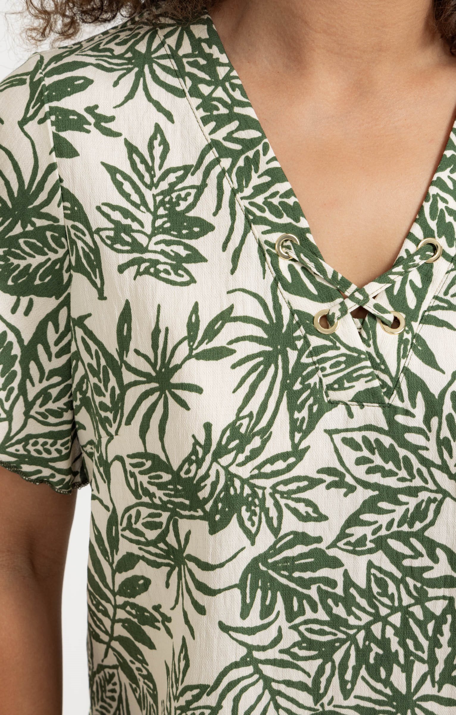 Chemisier à manches courtes avec col en V. Œillets et liens croisés au niveau du col. Coupe droite. Imprimé floral sur l'ensemble avec un motif géométrique en bas. Détails de surpiqûres sur les bords. Longueur standard.