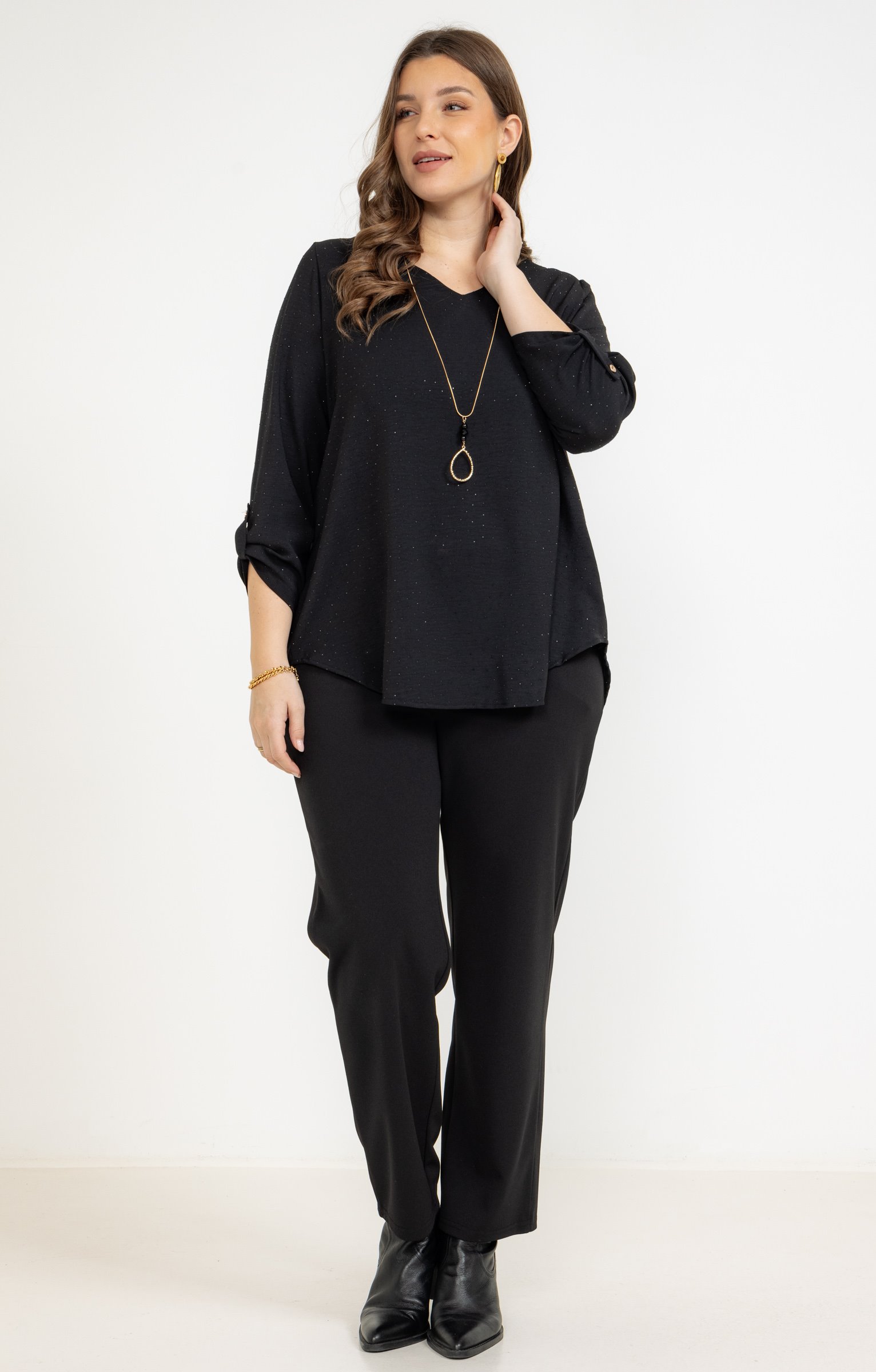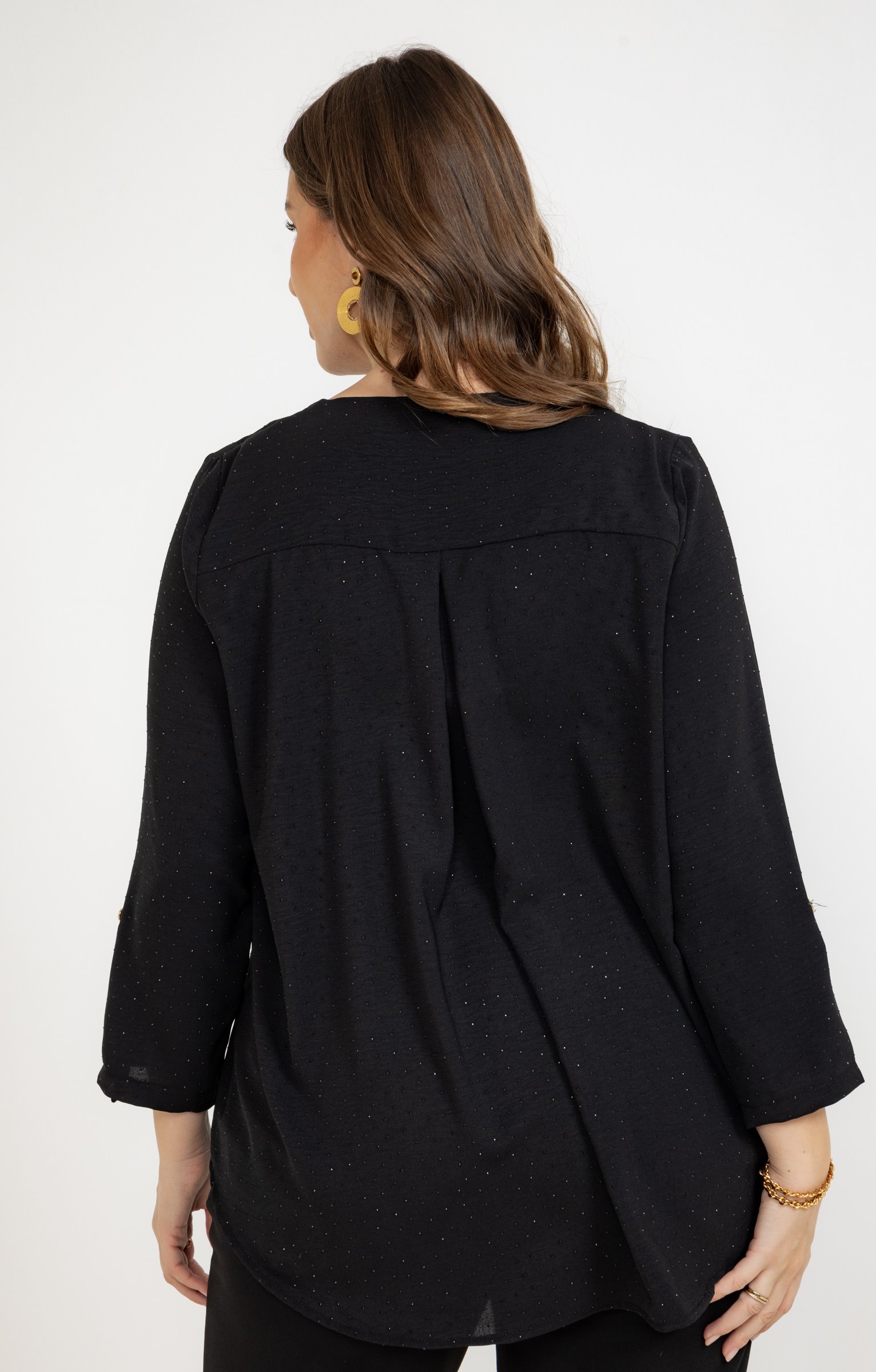 Tunique strassée à manches retroussables en teinte unie. Coupe droite fluide. Manches longues à remonter au moyen de pattes boutonnées. Emmanchures droites. Col V. Coloris uni. Application de strass en ton sur ton sur toute la surface. Pli creux sous empiècement droit en haut au dos. Base arrondie au dos.