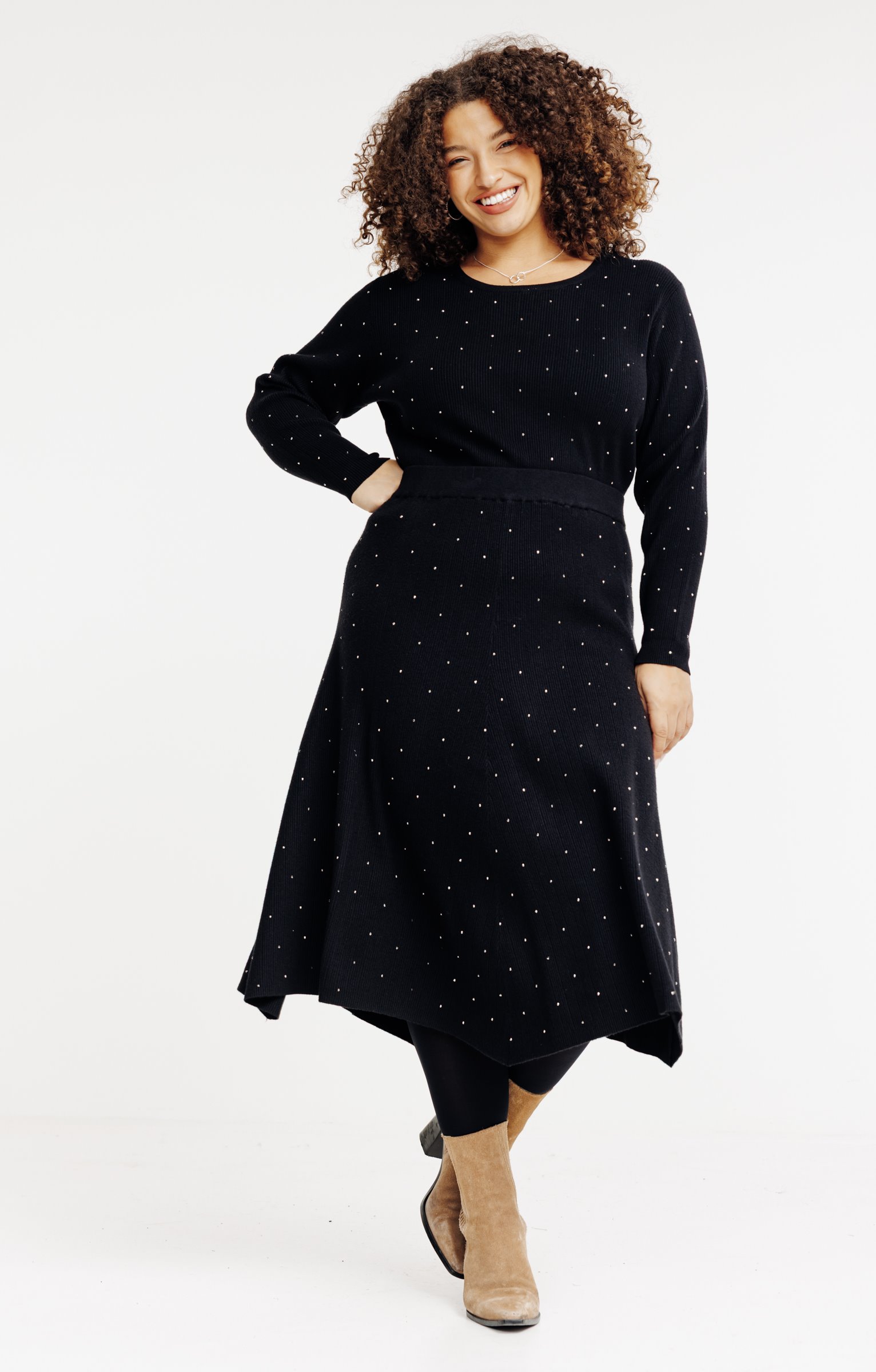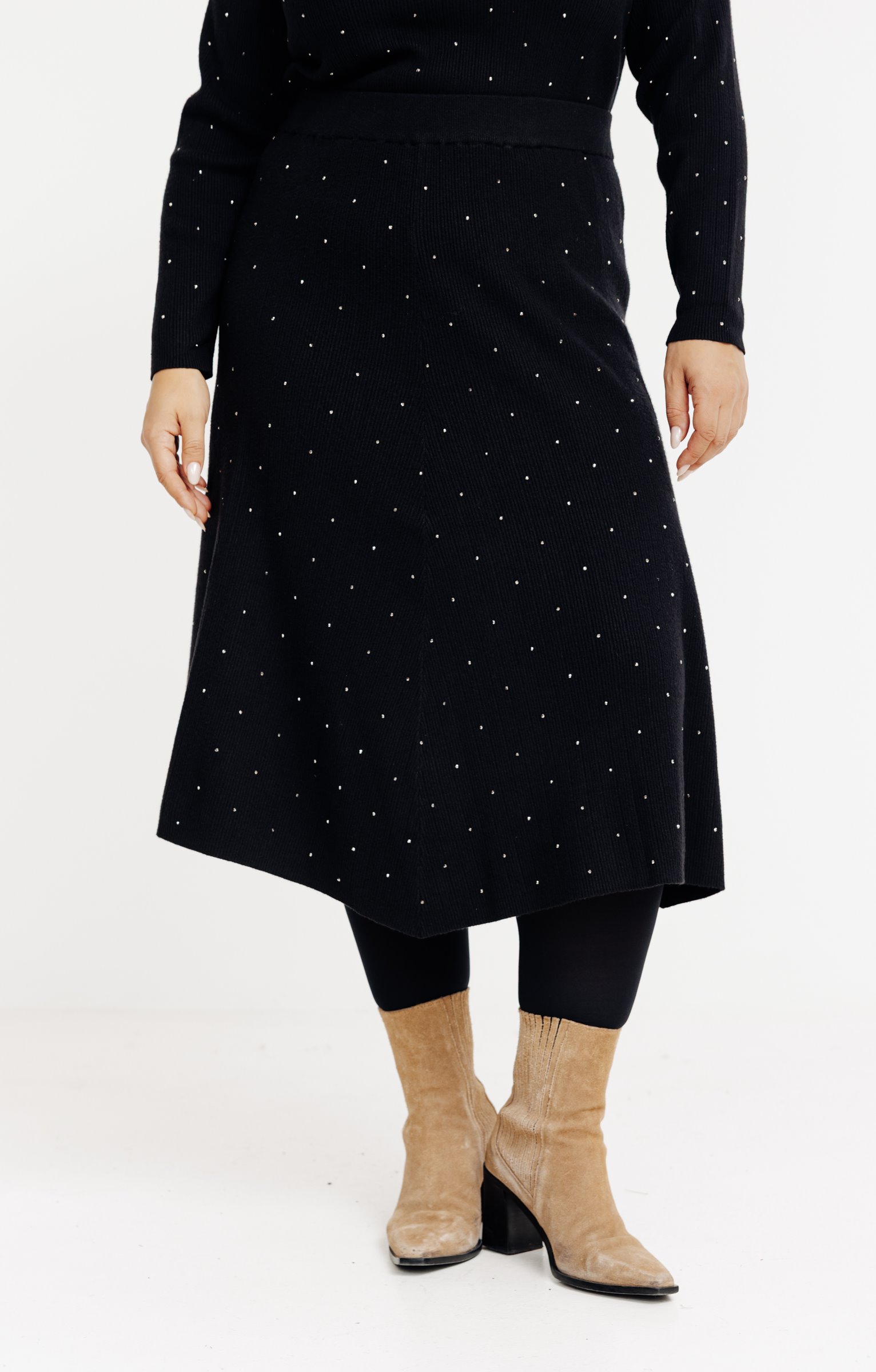 Jupe évasée avec strass. Coupe évasée. Longueur mi-mollets. Large taille plate élastiquée. Coloris uni. Strass sur l'ensemble du modèle. Coutures discrètes en finition. Portez cette jupe avec le haut assorti.