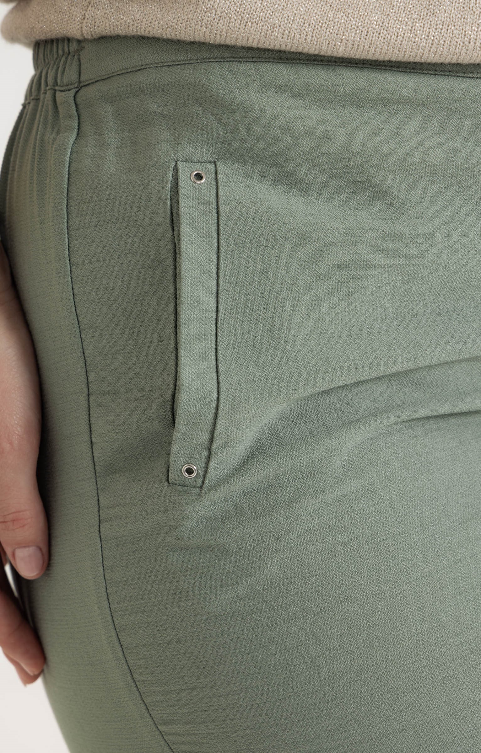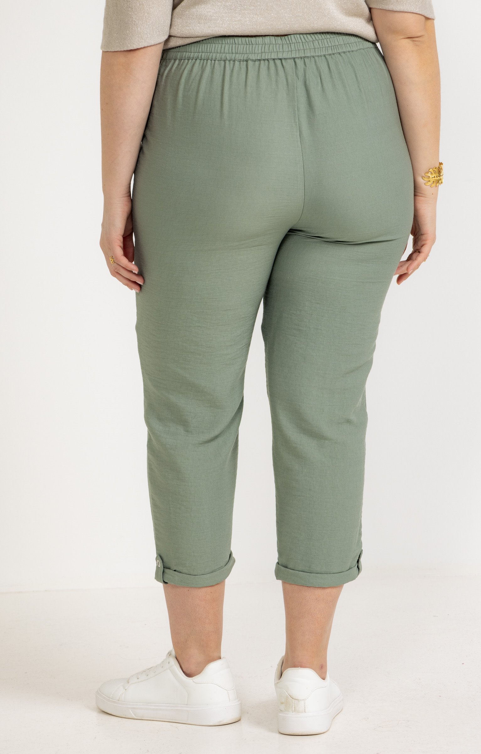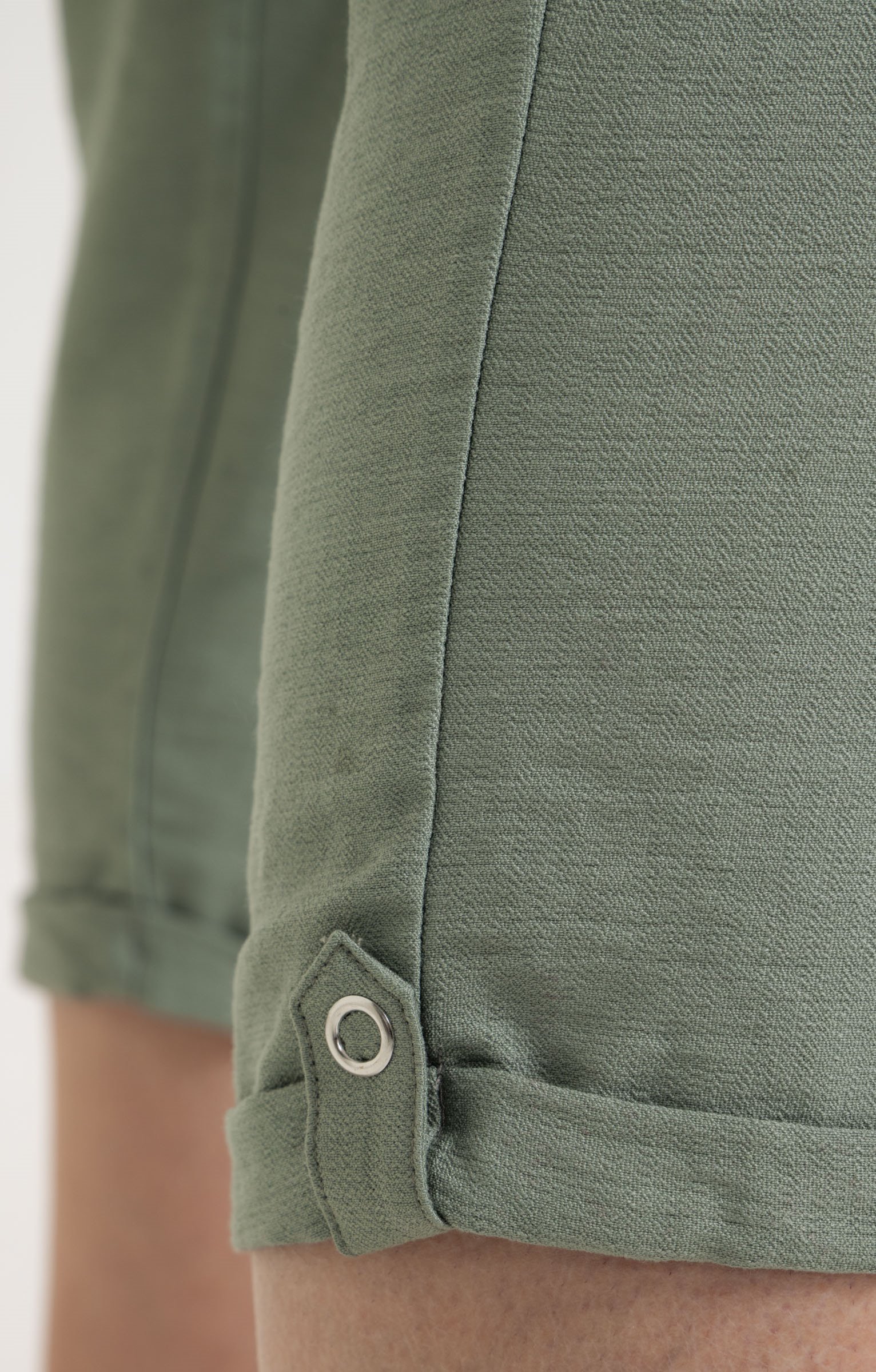 Pantalon droit 7/8 uni à revers en matière légère. Coupe droite. Longueur 7/8. 2 poches verticales passepoilées devant. Coloris uni. Matière fluide. Revers maintenus par une patte avec œillet métallique à la base. Ceinture plate devant. Taille smockée au dos. Œillets décoratifs aux extrémités des poches.