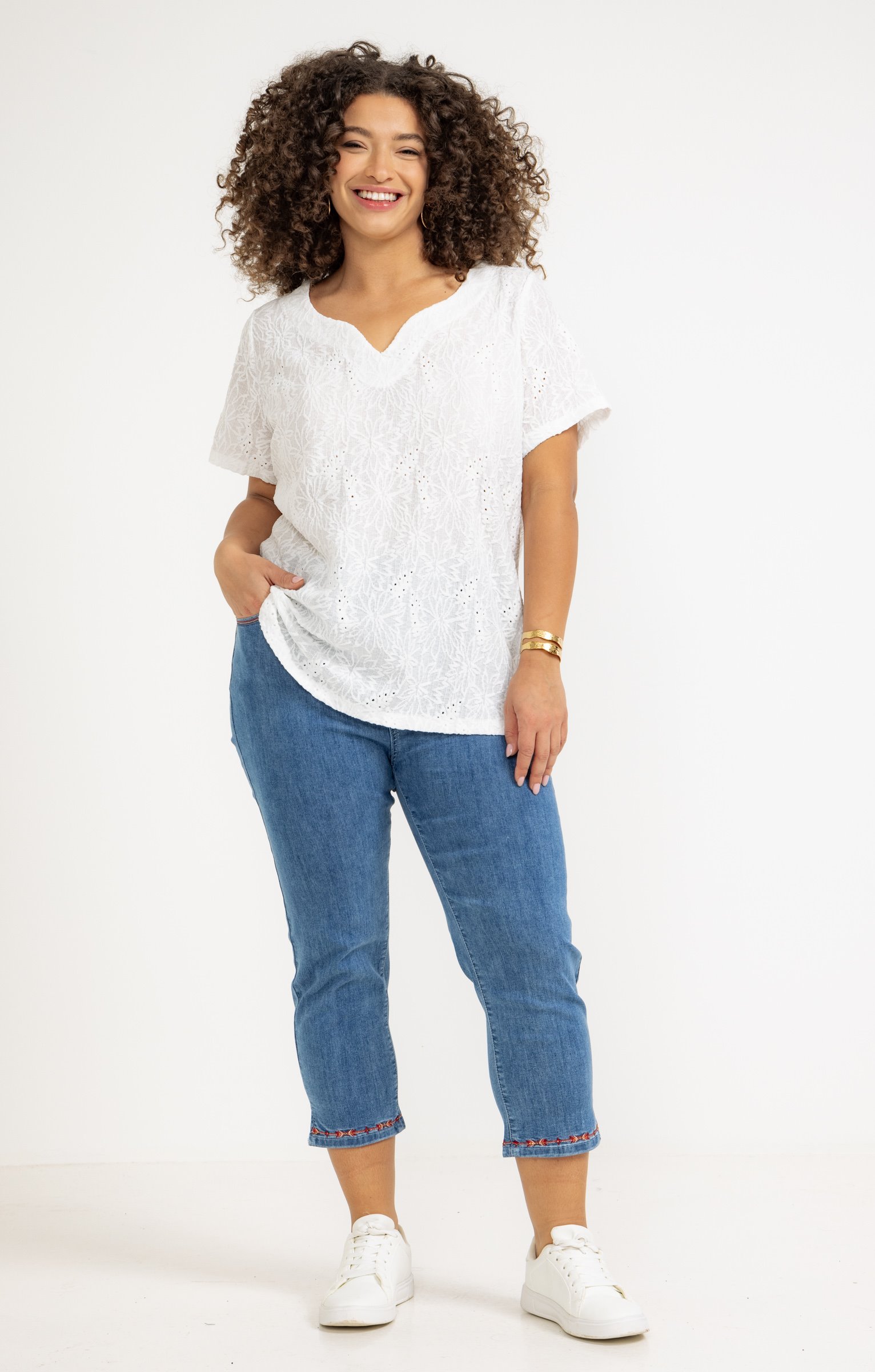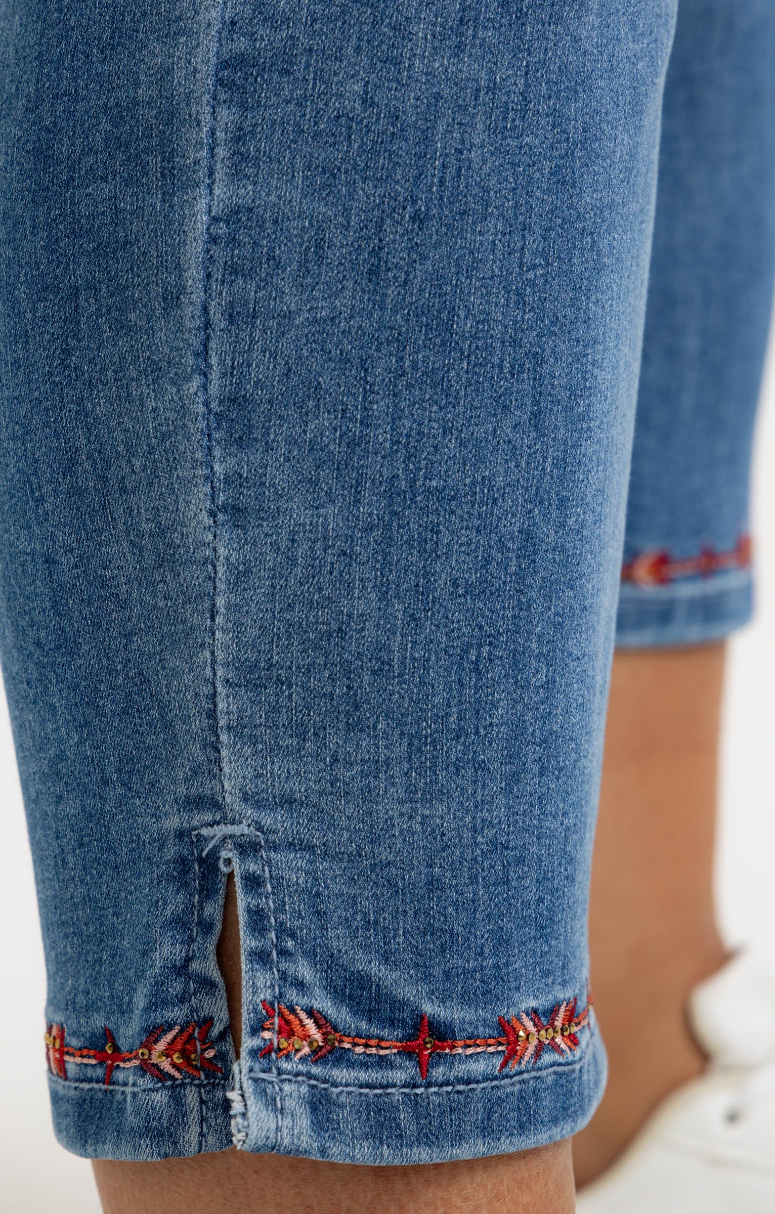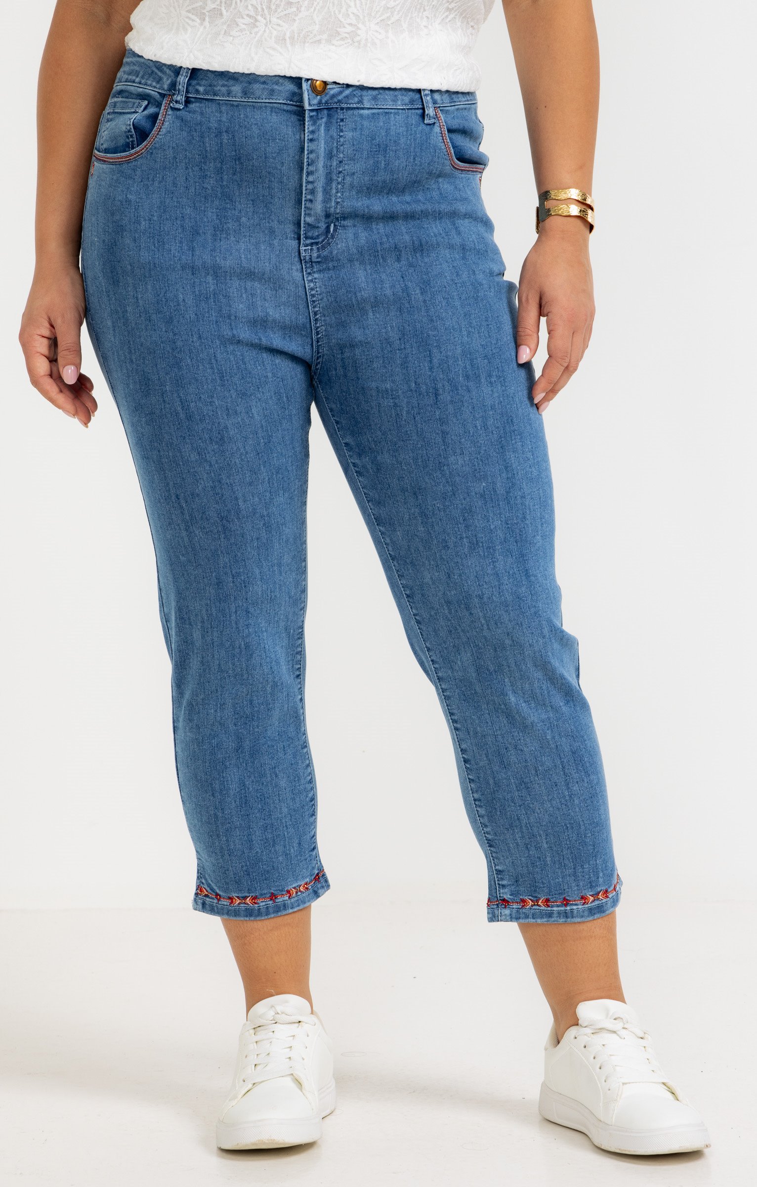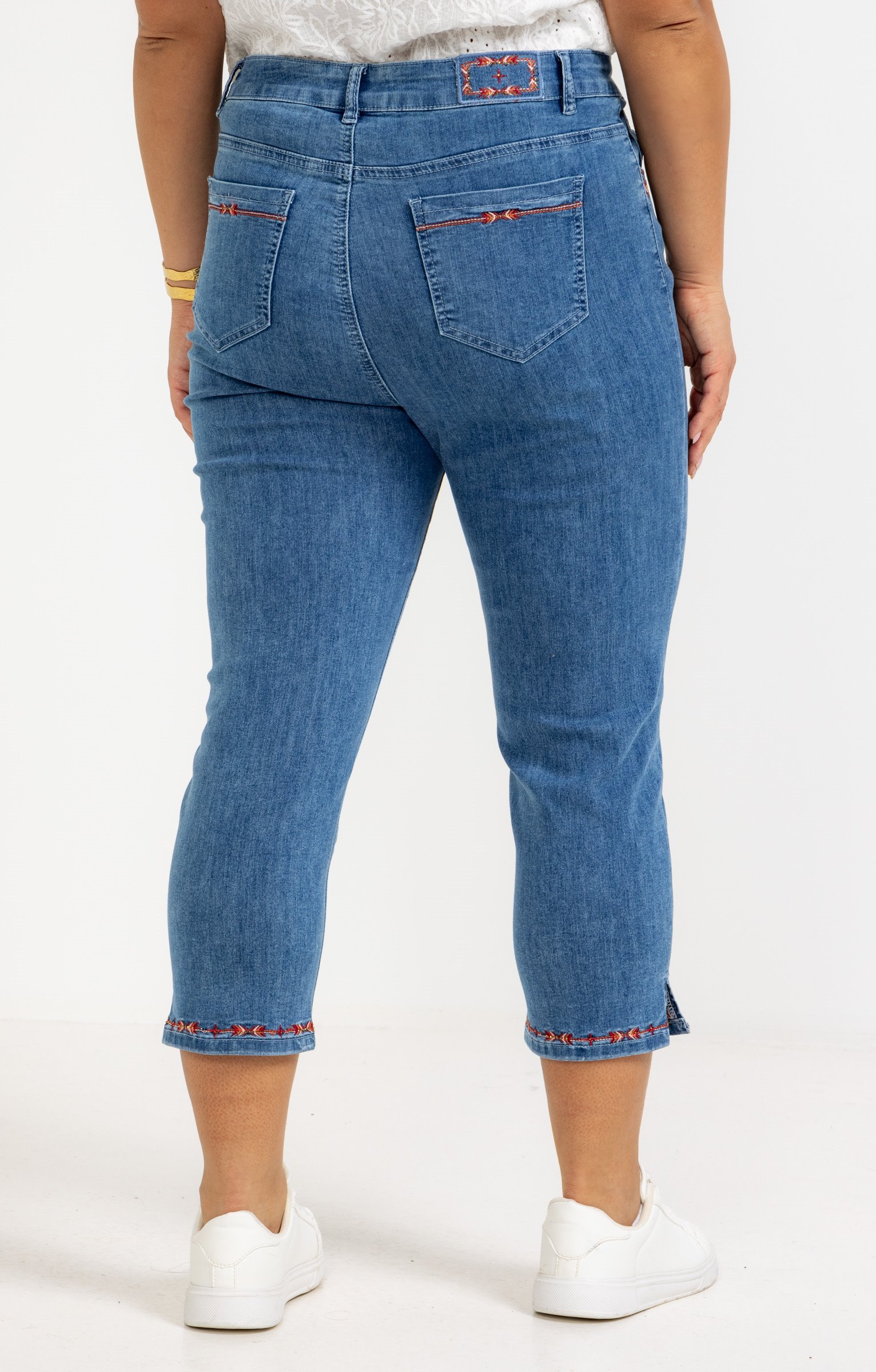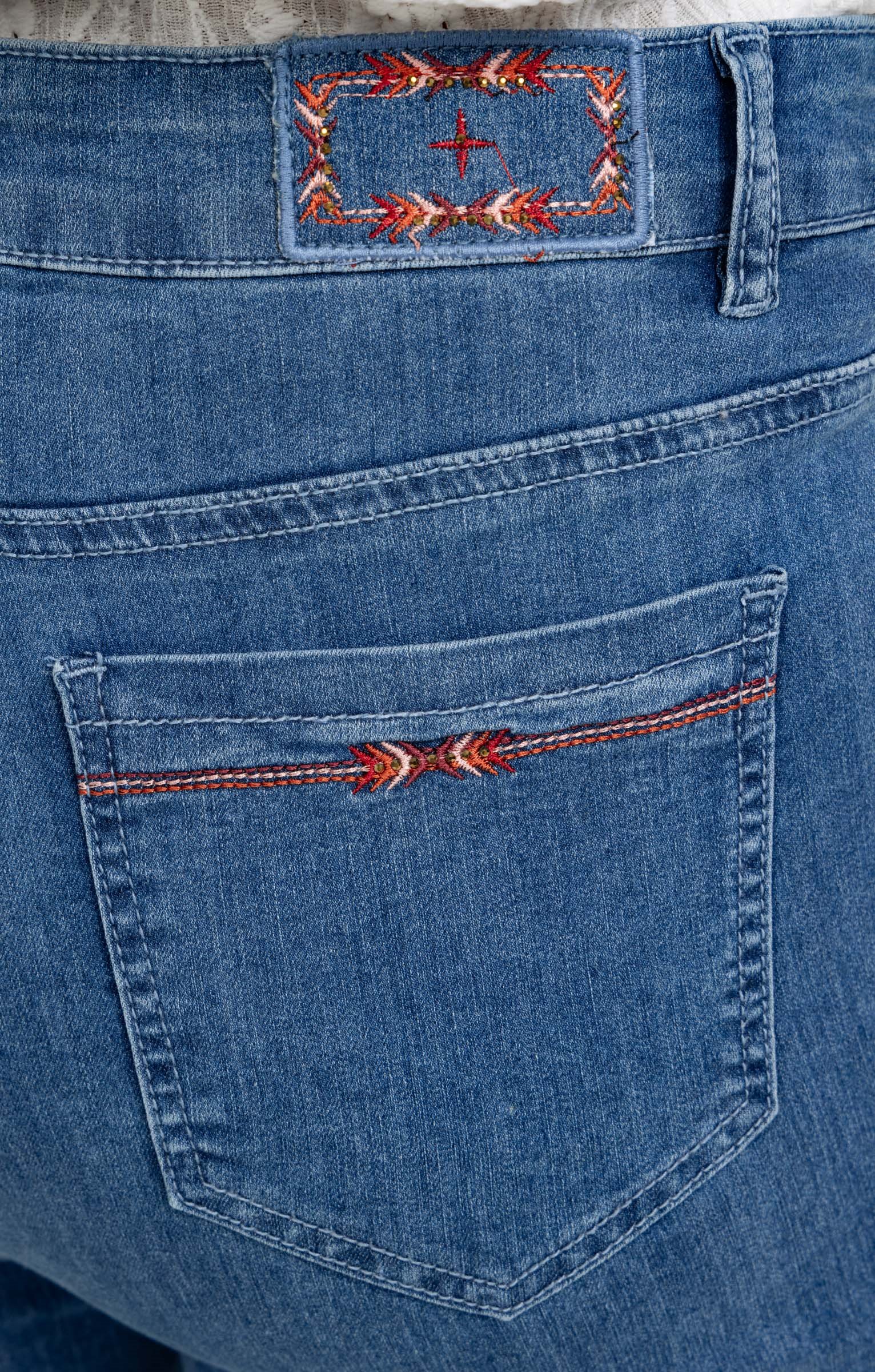 Pantalon 7/8 en denim. Coupe ajustée avec taille haute. Détails de broderie sur les poches arrière et à l'ourlet. 2 poches italiennes à l'avant et 2 poches plaquées au dos. Coloris uni.