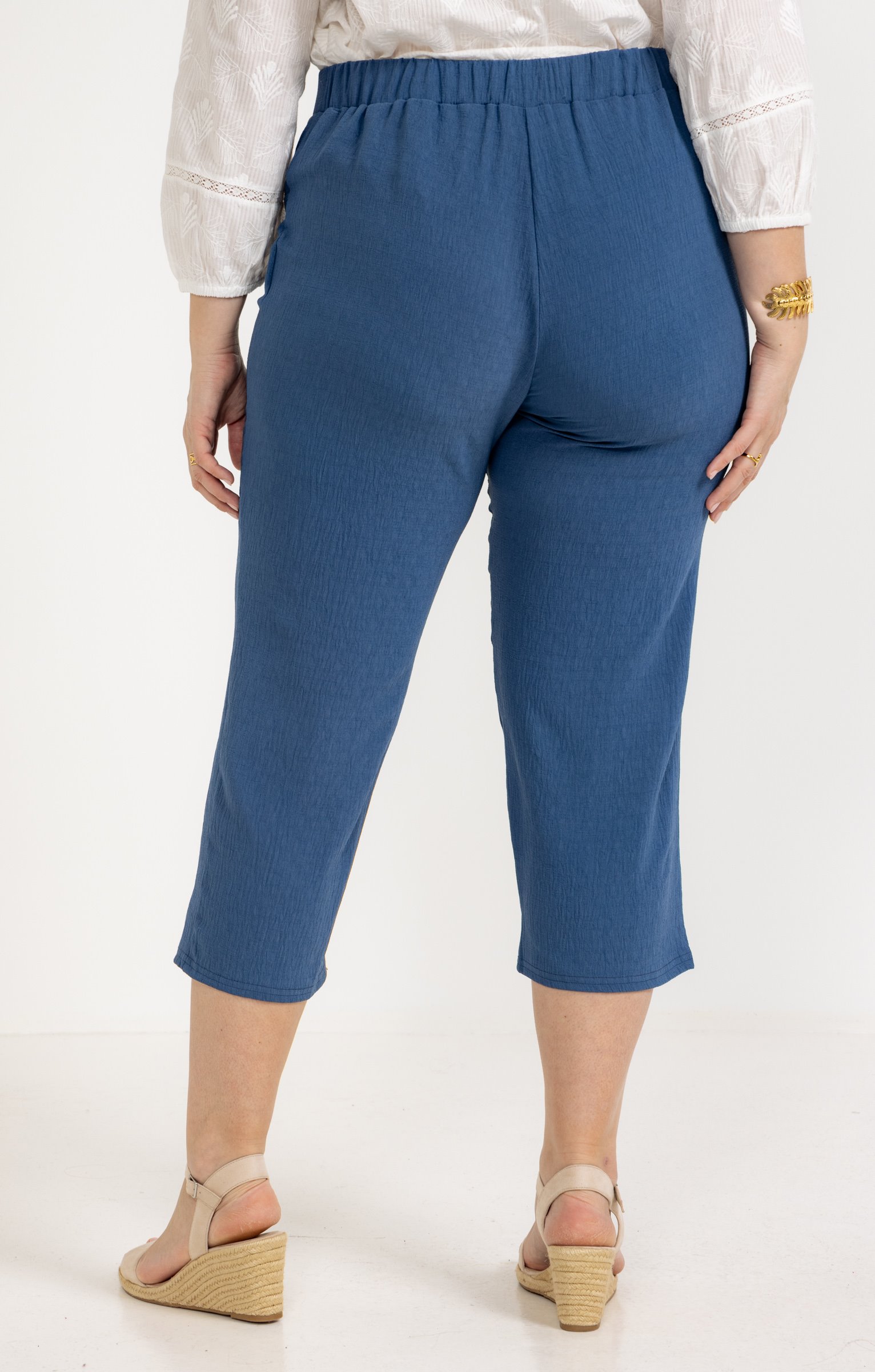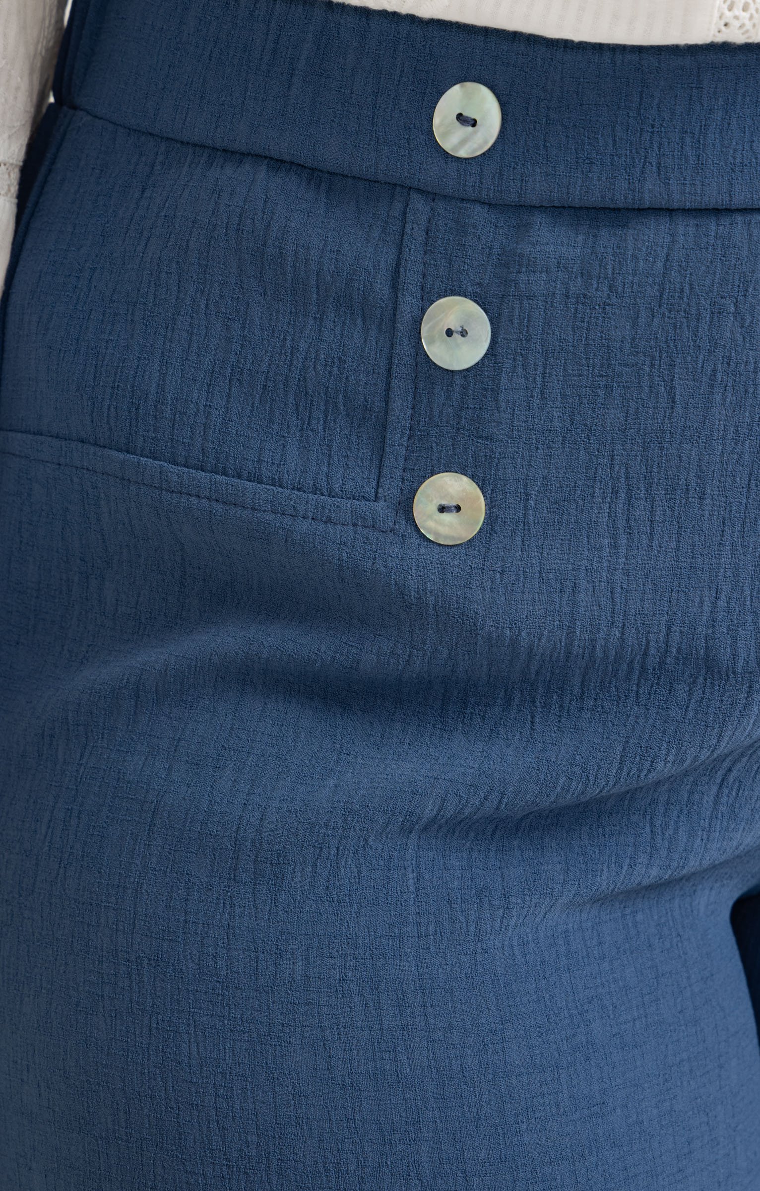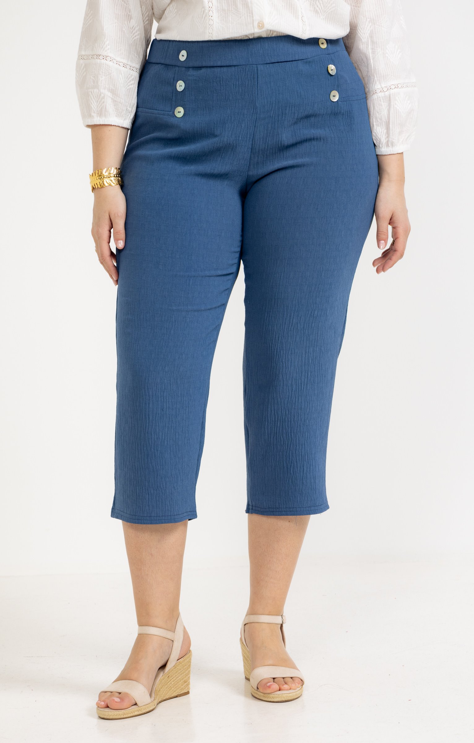 Pantalon de ville 7/8 droit. Taille haute élastique avec boutons décoratifs sur le devant. Coupe droite avec une finition lisse. Longueur 7/8, se terminant au-dessus de la cheville. Tissu texturé.