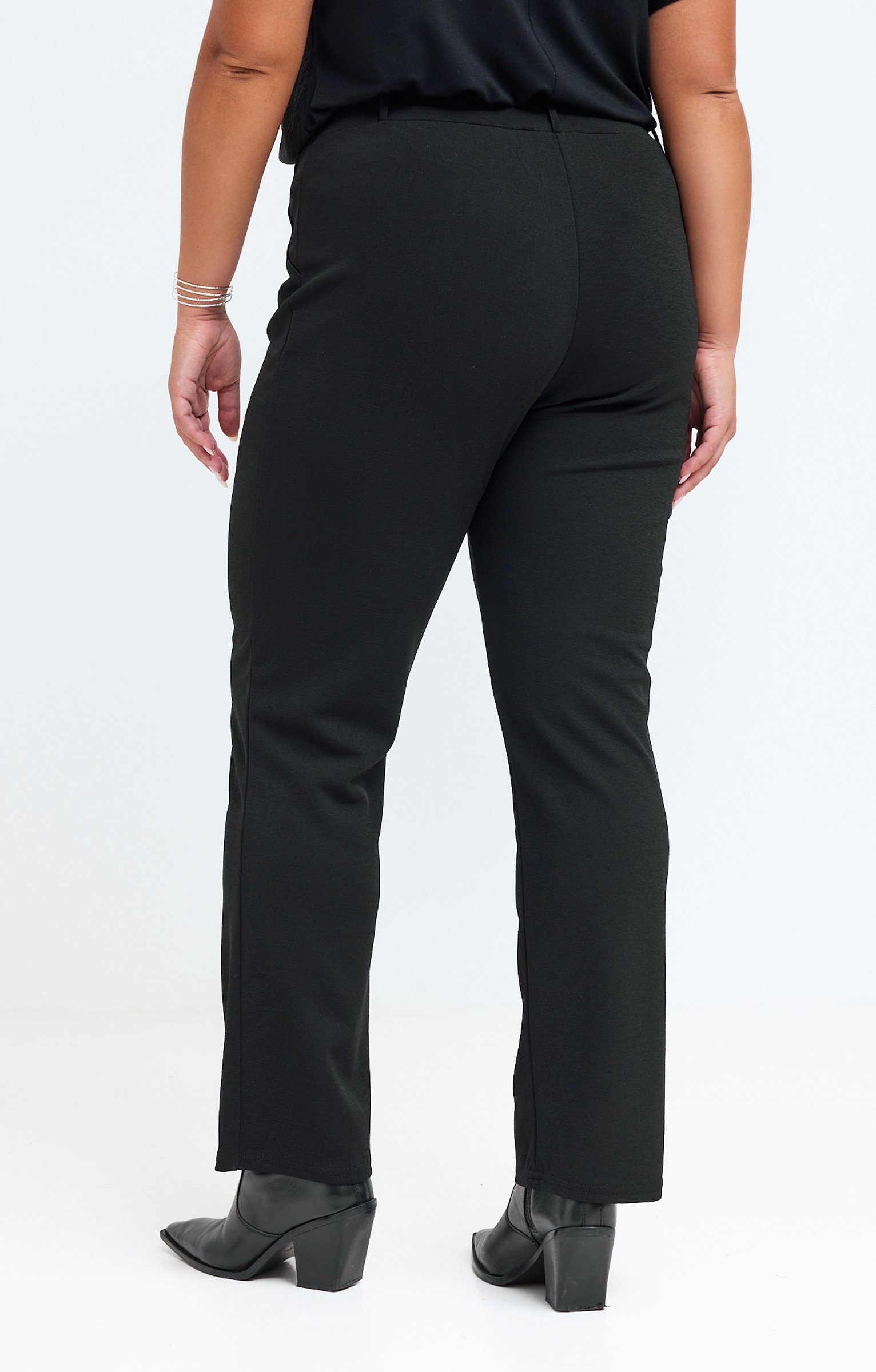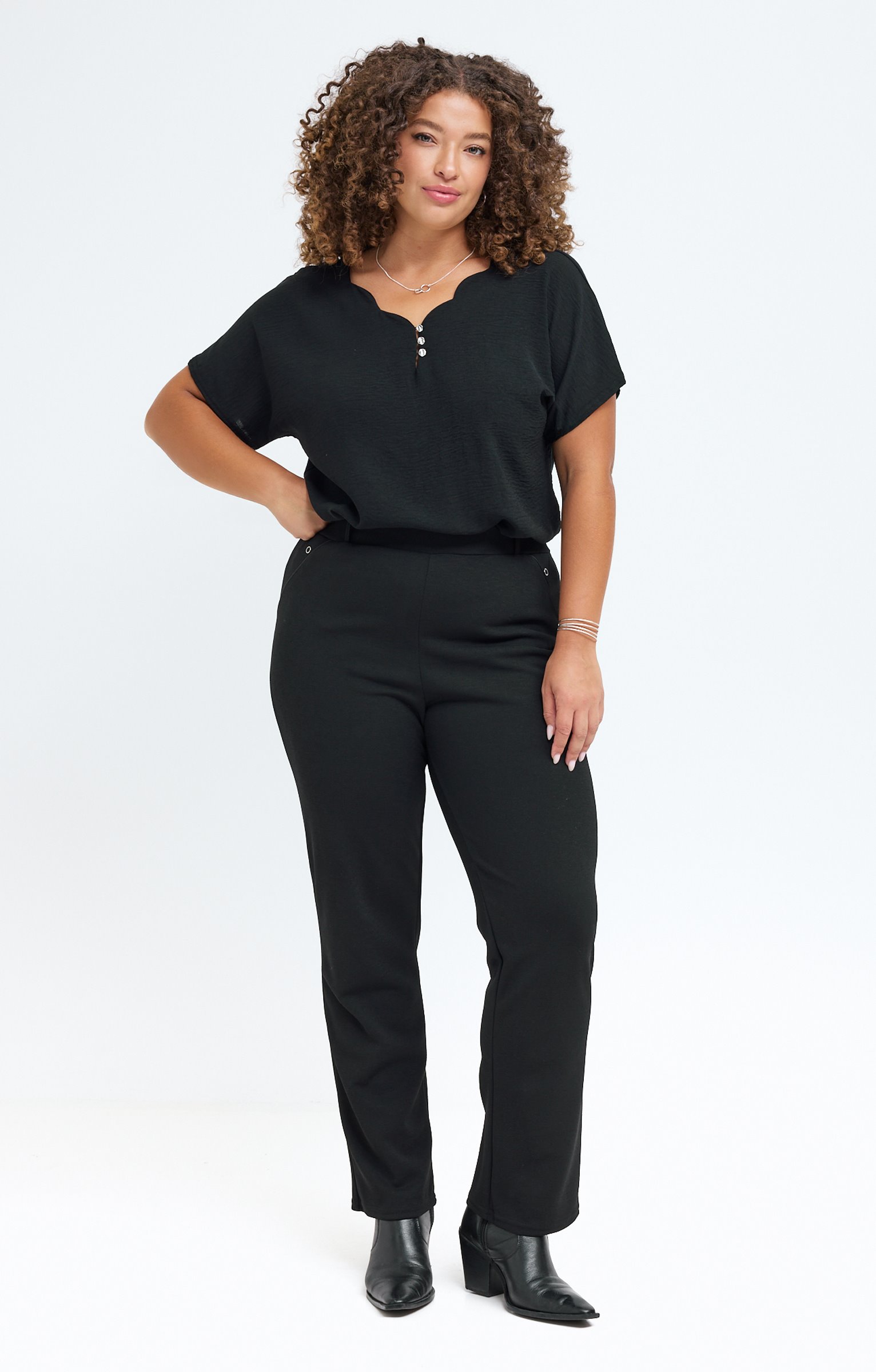 Pantalon extensible uni avec œillets décoratifs. Coupe droite. Fausses poches italiennes devant. Coloris uni. Maille extensible. Liseré ton sur ton en bordure des fausses poches. Découpe géométrique ornée d'un œillet métallique au-dessus des fausses poches. Ceinture élastiquée avec passants.
