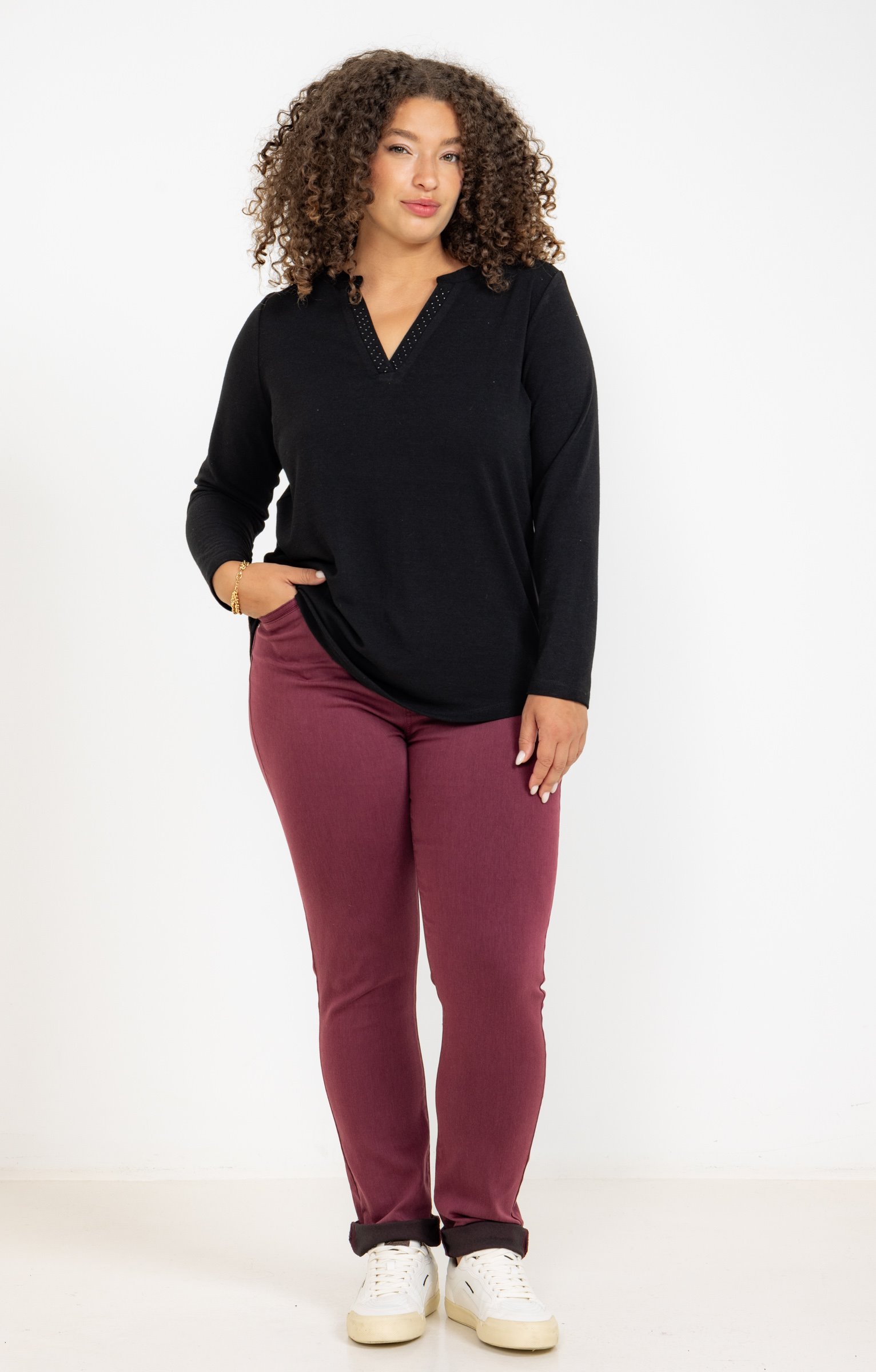 Pantalon ajusté avec strass. Coupe ajustée. Fermeture zippée et boutonnée sur le devant. 2 poches cavalières et une poche ticket sur le devant. 2 poches plaquées au dos. Coloris uni. Matière extensible. Strass et studs sur le bord des poches. Passants pour ceinture. Coutures ton sur ton.