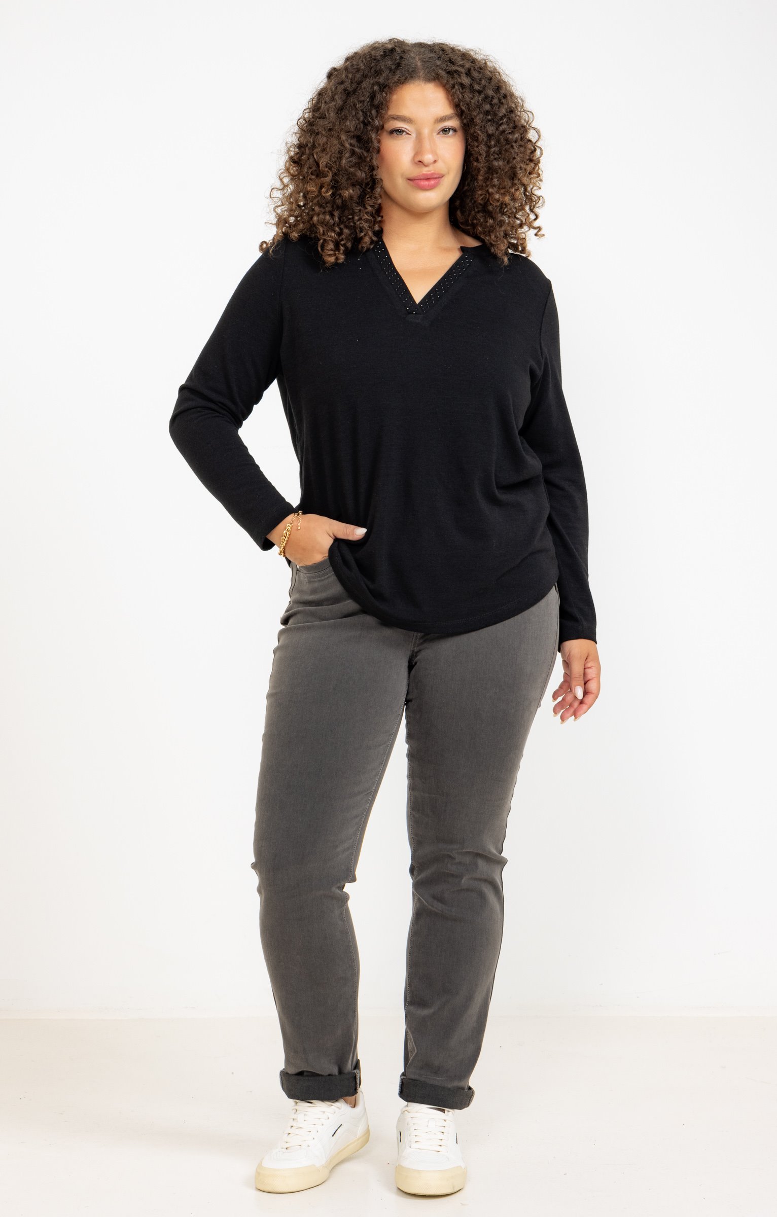Notre mannequin Delia mesure 1m71 et porte un pantalon taille 1.