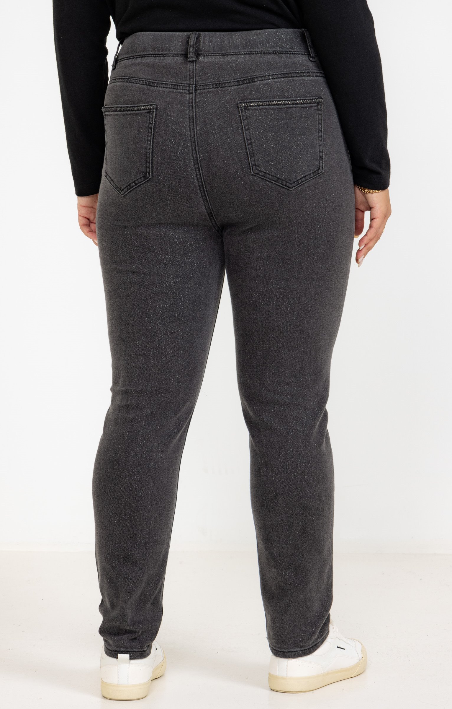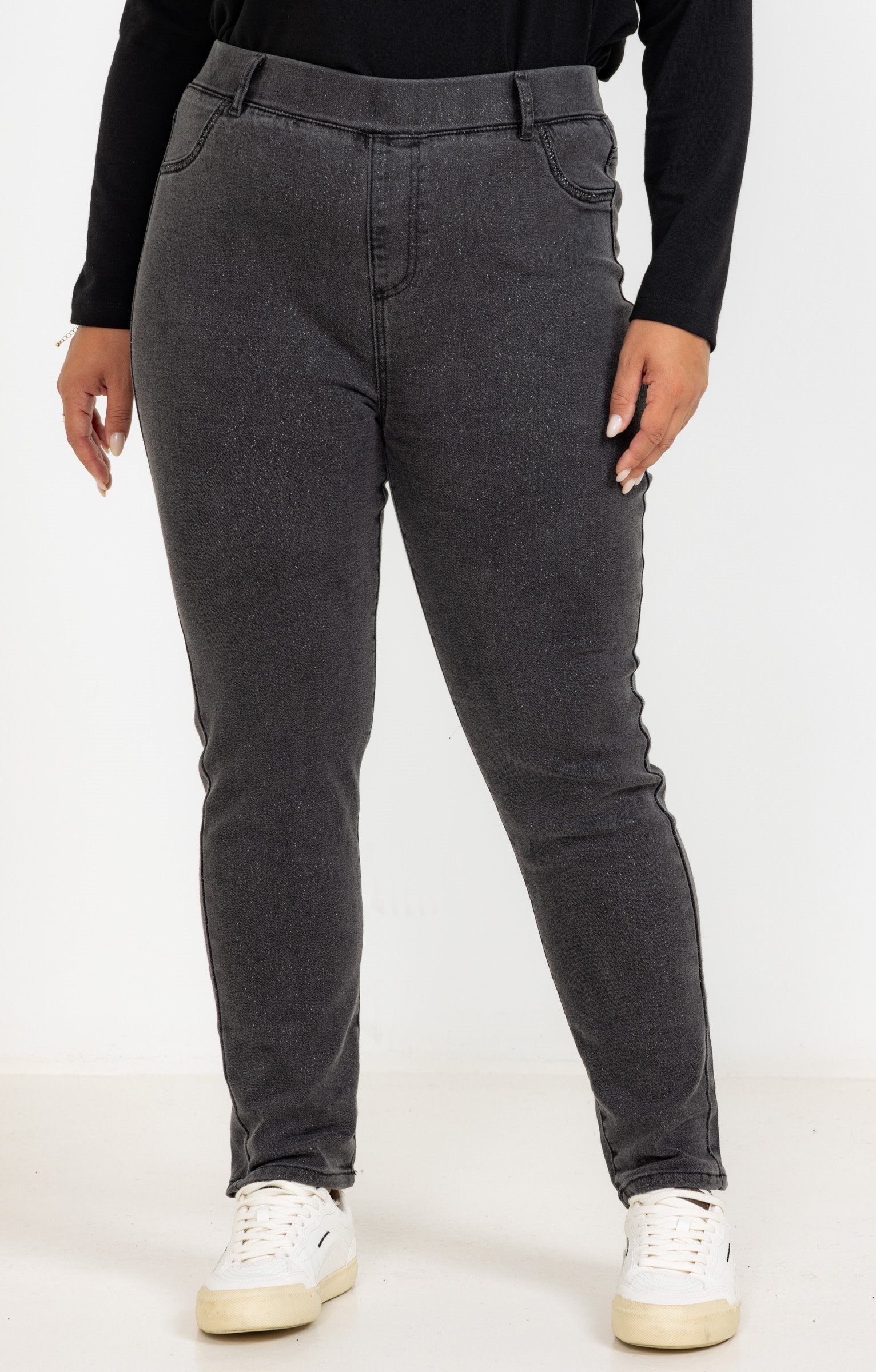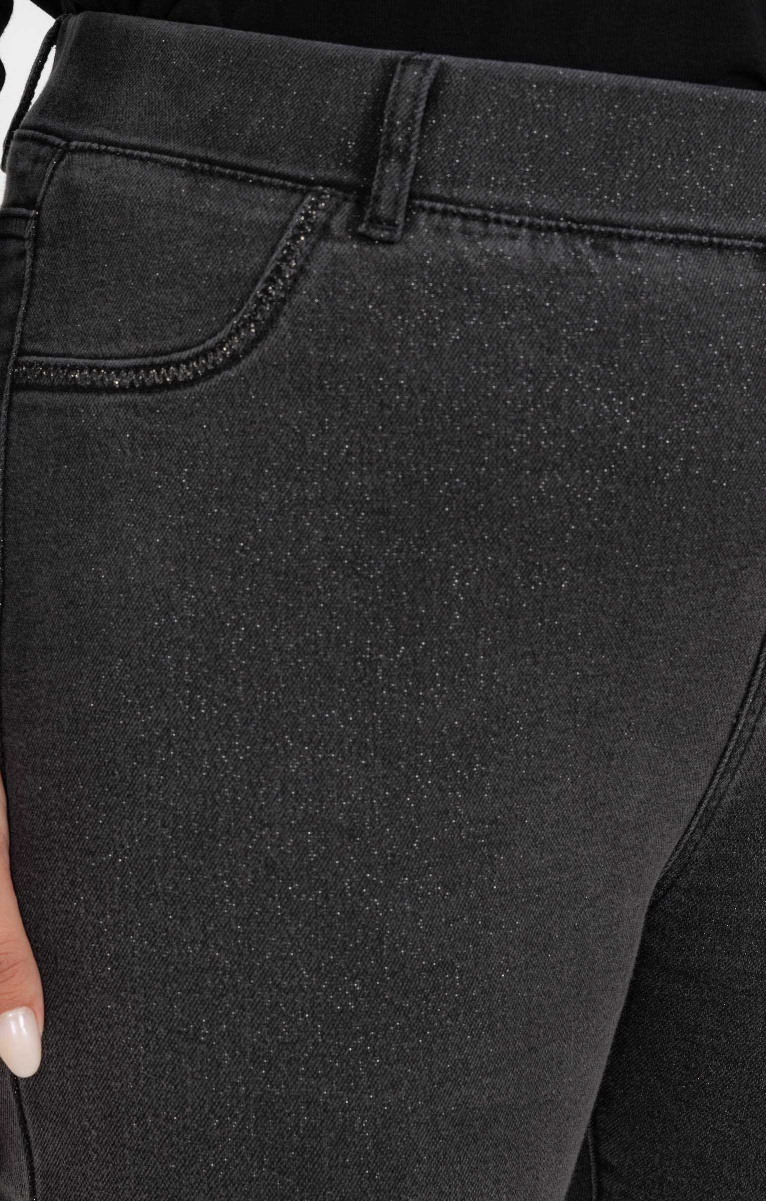 Tregging uni pailleté avec détails zigzag. Coupe ajustée. Modèle long. Fausse fermeture zippée et large ceinture élastiquée. 2 fausses poches cavalières devant. 2 poches plaquées au dos. Coloris uni. Tissu façon denim pailleté. Matière extensible. Coutures zigzag décoratives en fil pailleté en bordure des poches. Passants pour ceinture. Surpiqûres en finition du modèle.