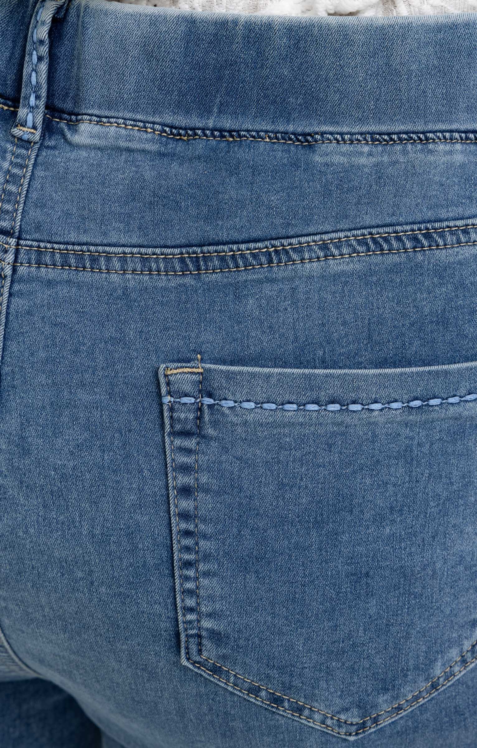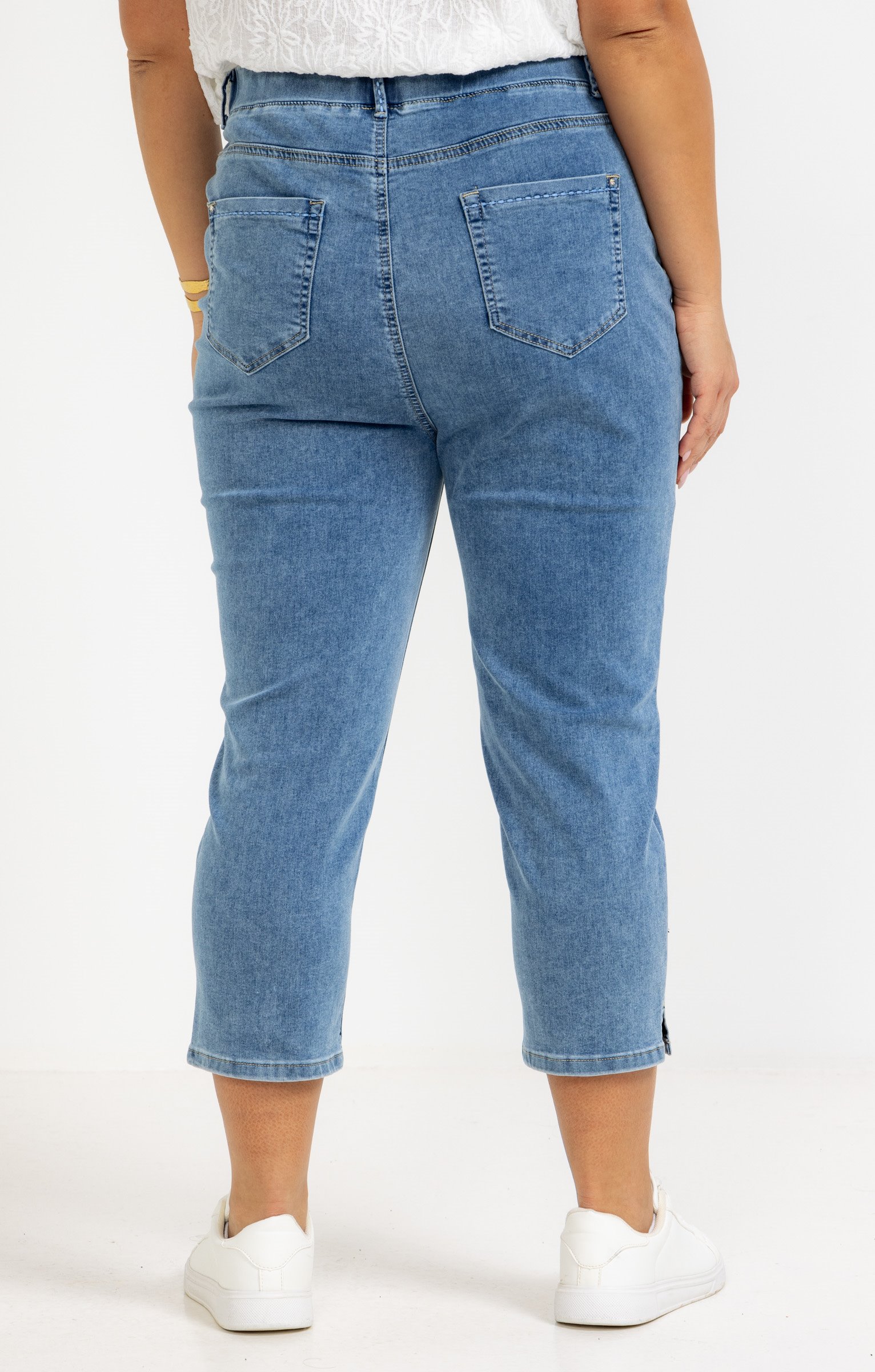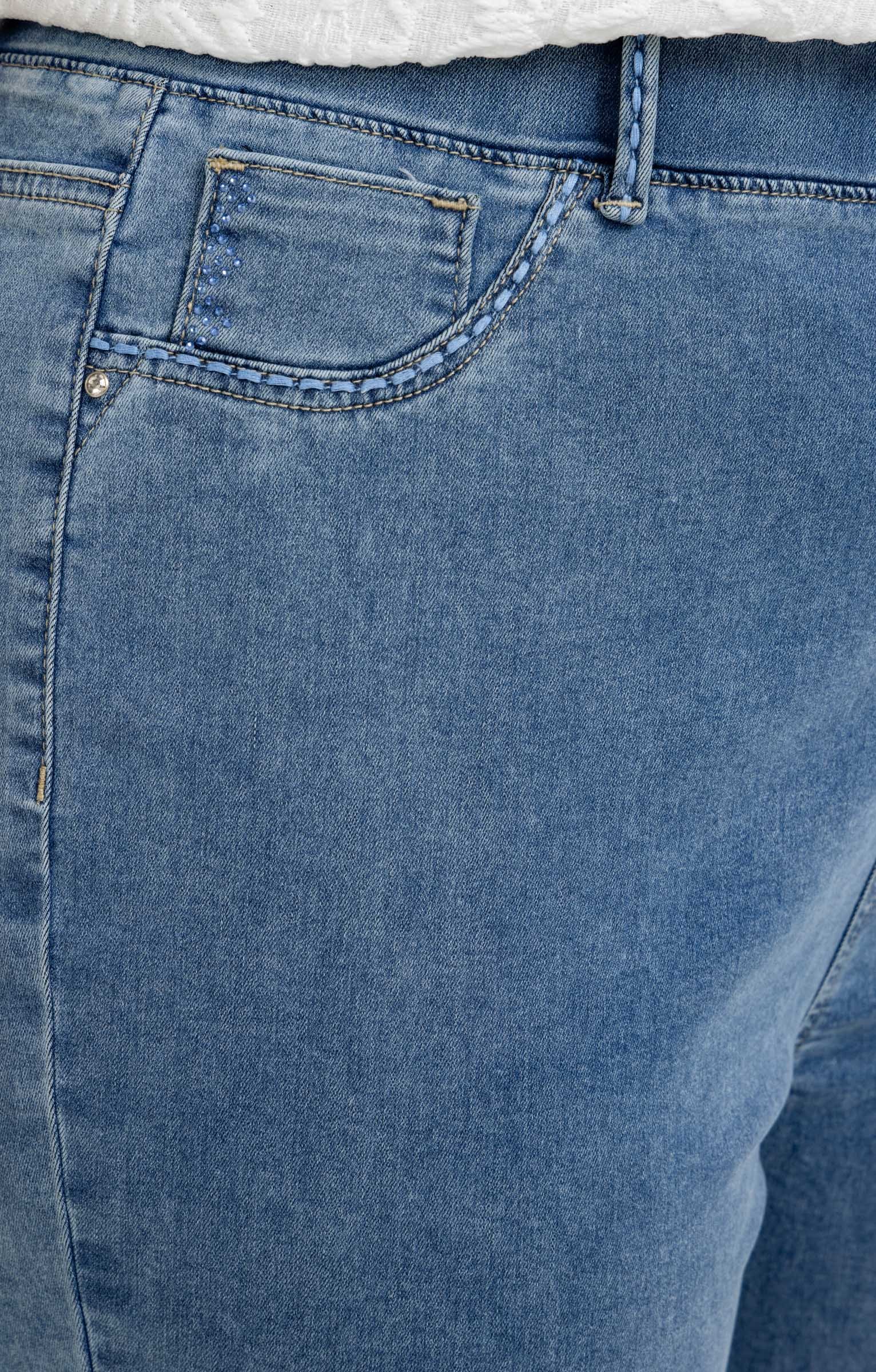 Pantalon 7/8 en denim. Coupe droite avec taille élastiquée. Deux fausses poches italiennes à l'avant et deux poches plaquées au dos. Détails de broderies sur les poches avant et arrières ainsi que de strass à l'avant. Finition avec surpiqûres ton sur ton. Coloris uni. Bas de pantalon avec fente sur les côtés.