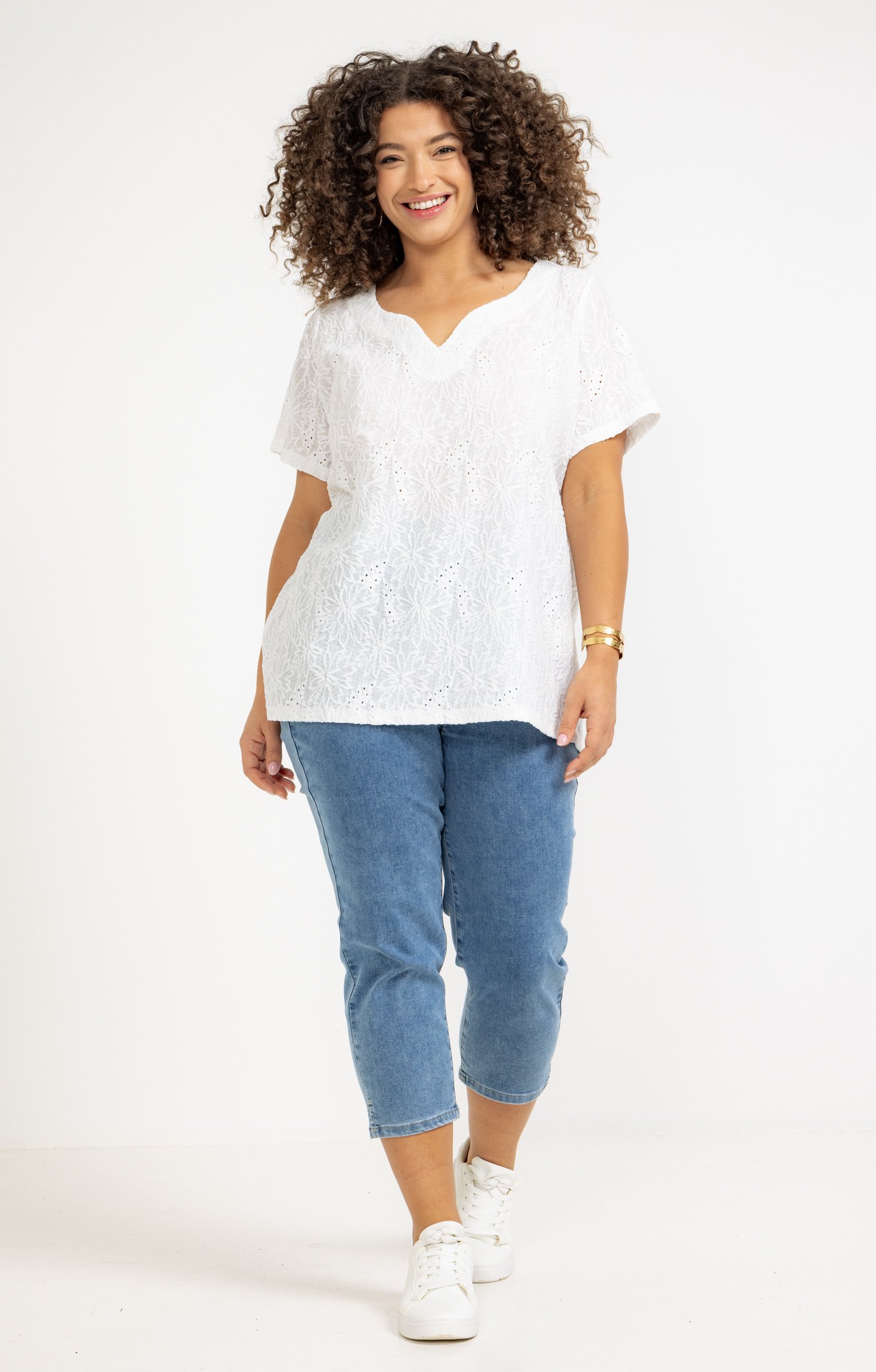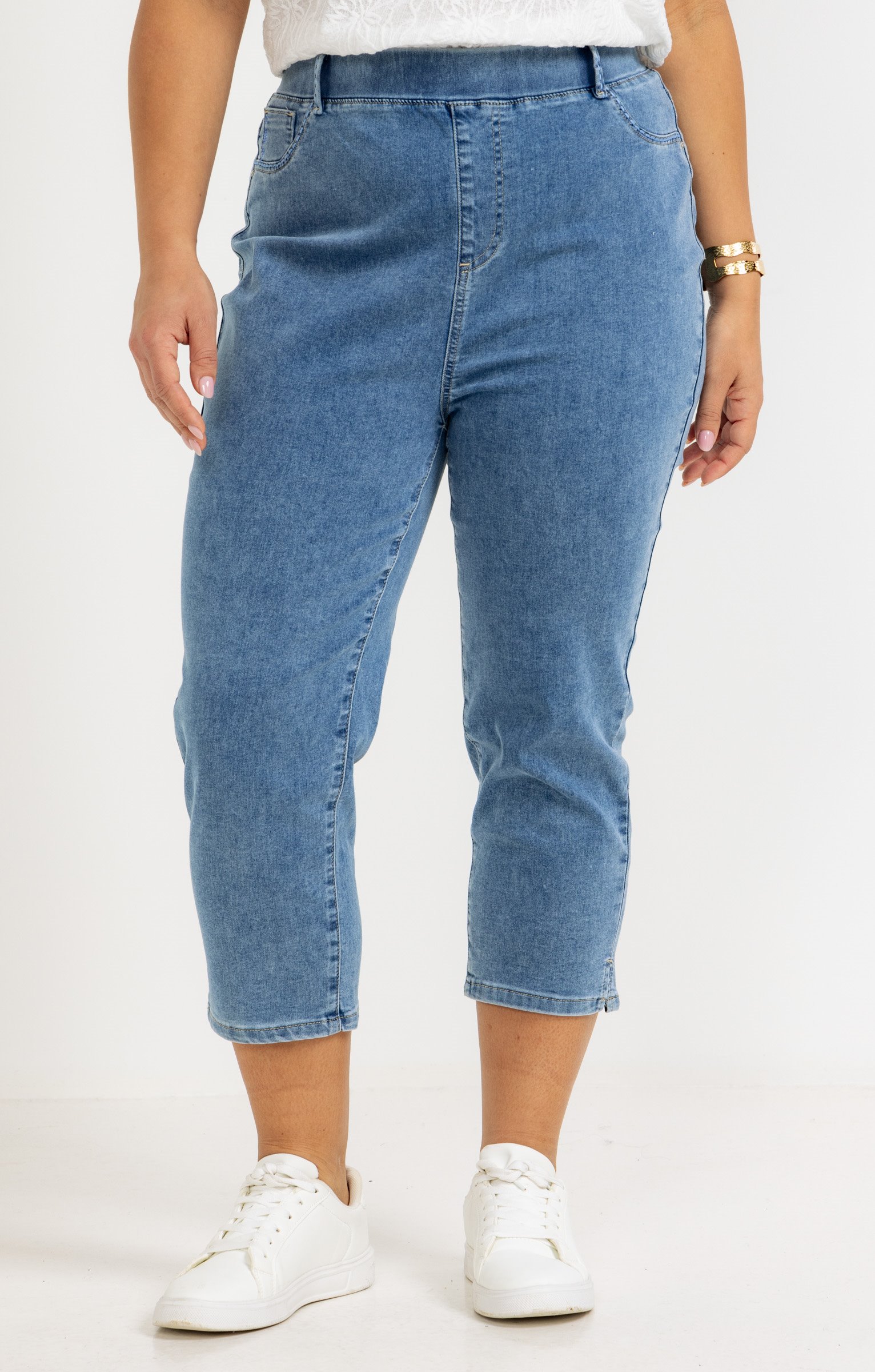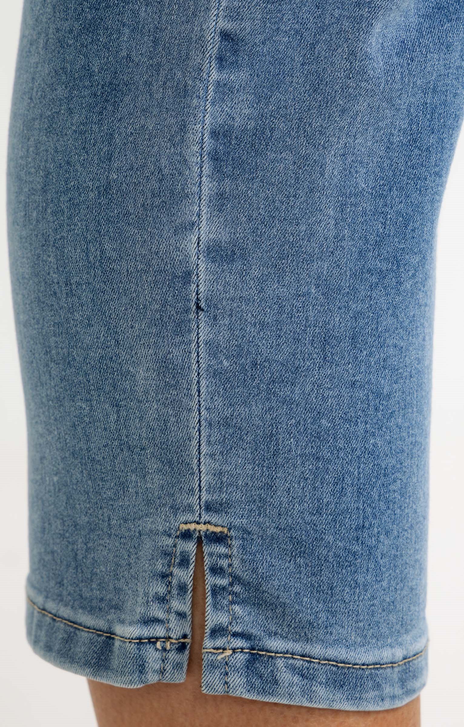Pantalon 7/8 en denim. Coupe droite avec taille élastiquée. Deux fausses poches italiennes à l'avant et deux poches plaquées au dos. Détails de broderies sur les poches avant et arrières ainsi que de strass à l'avant. Finition avec surpiqûres ton sur ton. Coloris uni. Bas de pantalon avec fente sur les côtés.