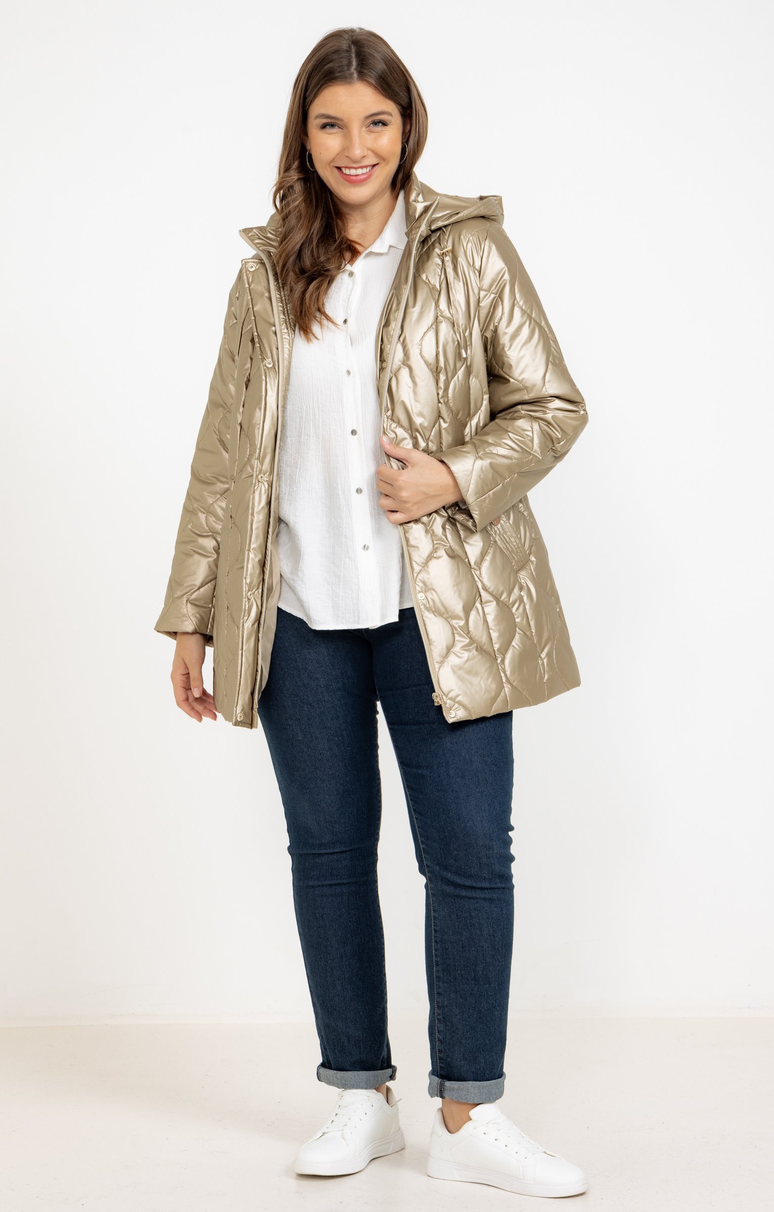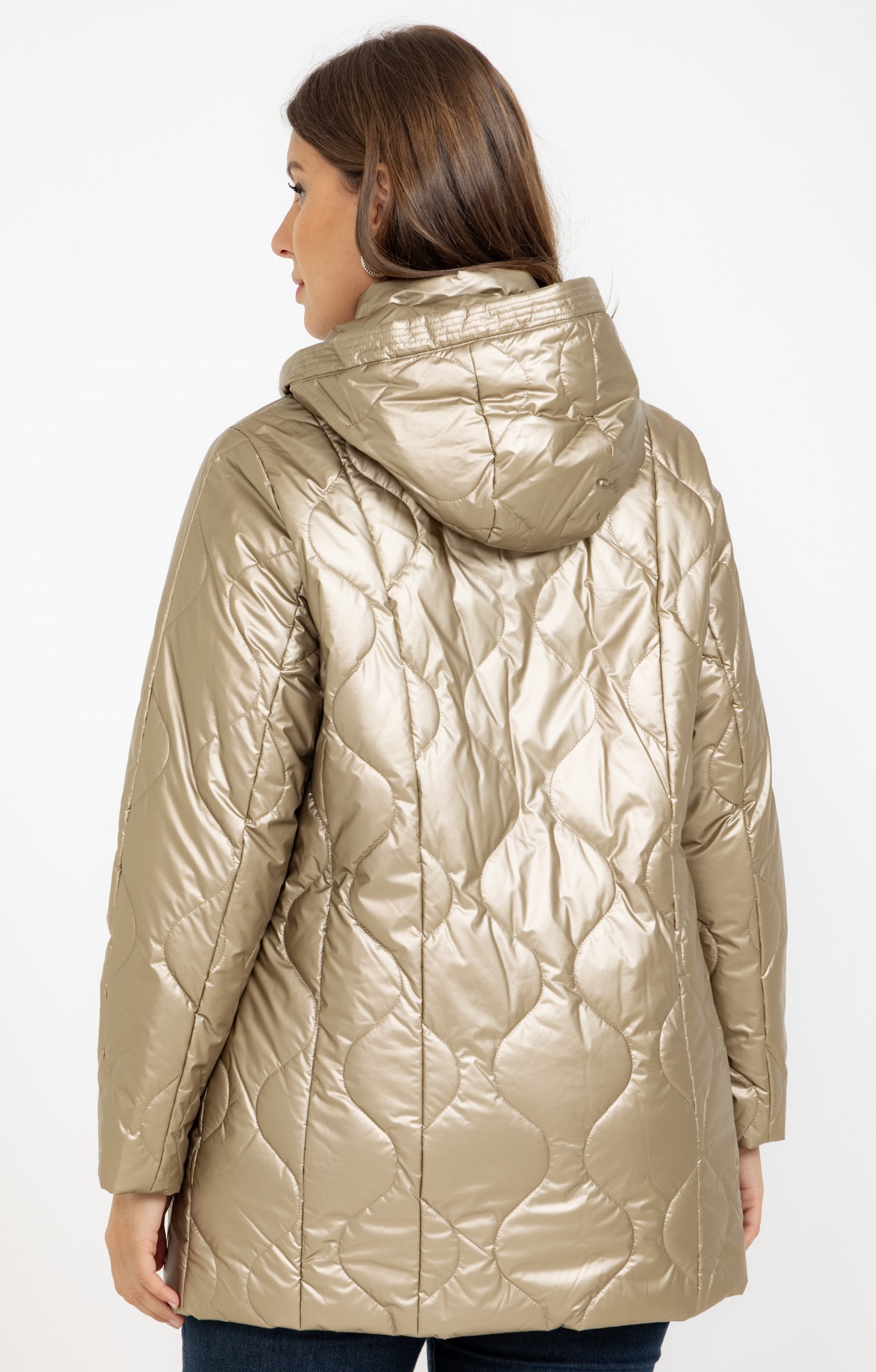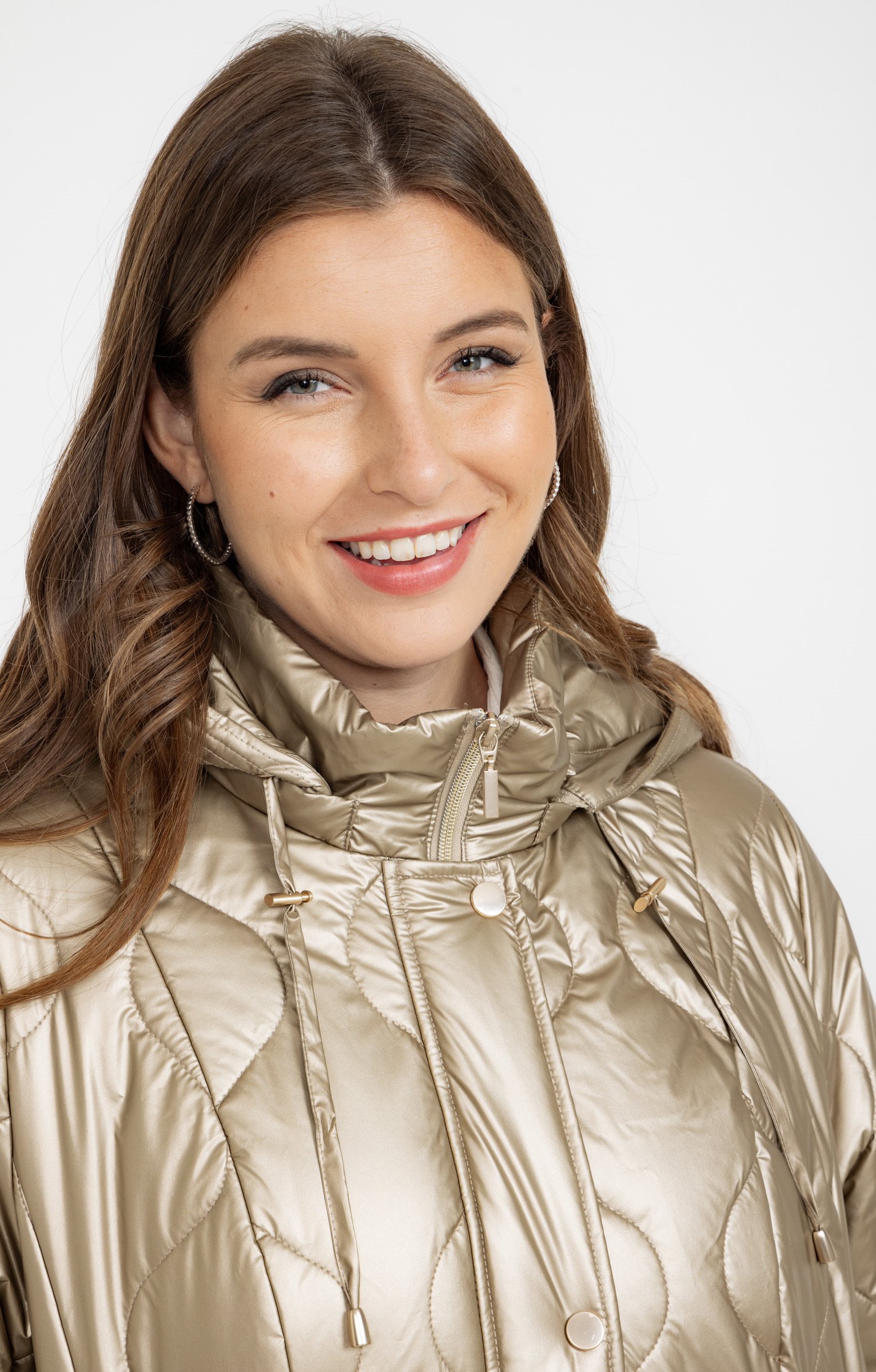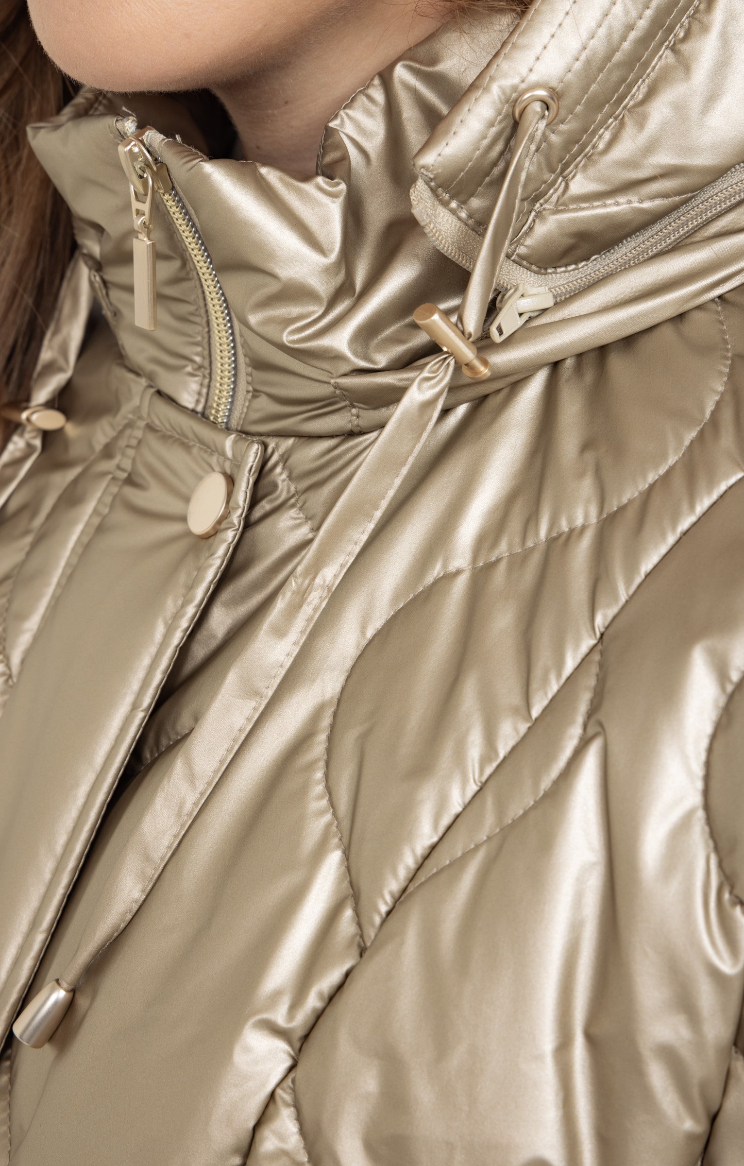 Parka matelassée à capuche. Coupe droite. Manches longues. Emmanchures droites. Col montant avec capuche. Fermeture zippée dissimulée sous une patte pressionnée. 2 poches raglan pressionnées devant. Coloris uni métallisé. Matelassage fantaisie. Doublure. Cordons de serrage à la capuche.