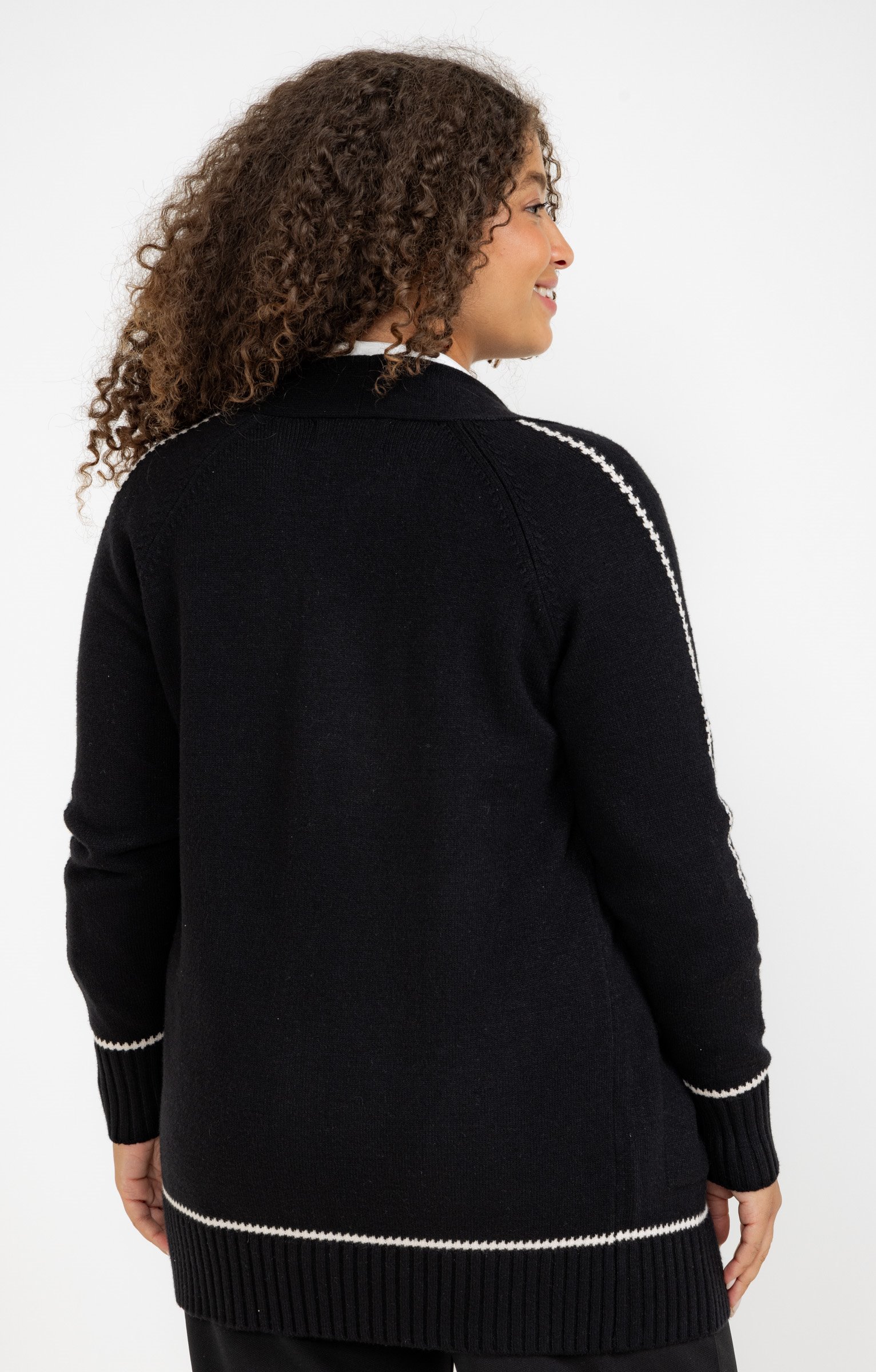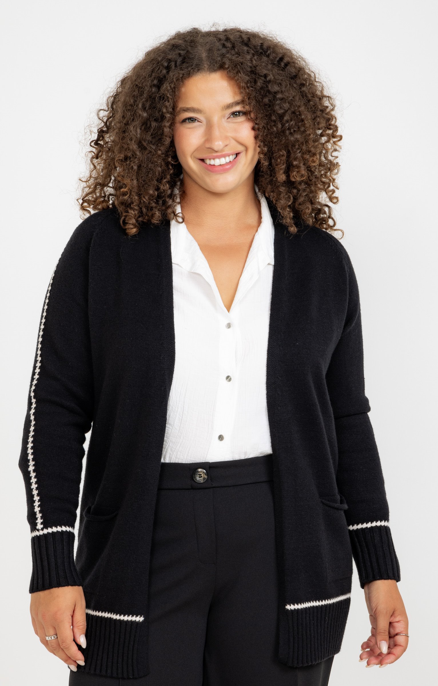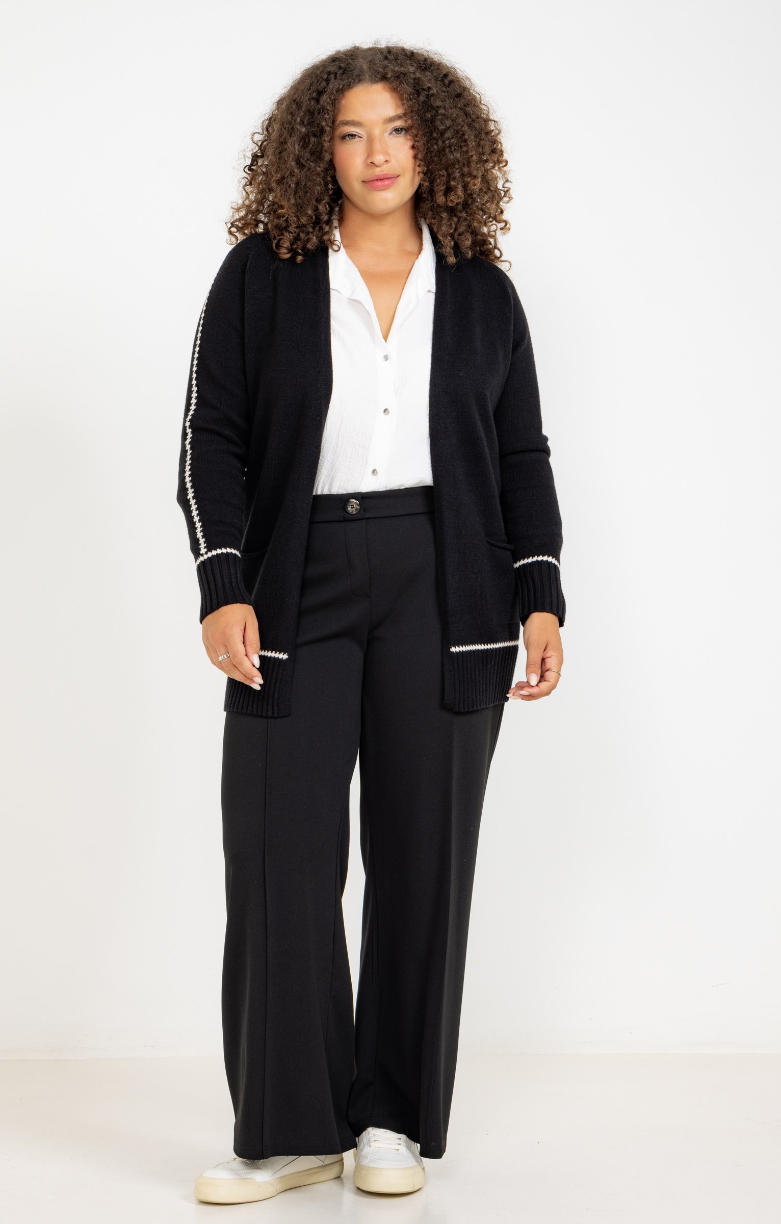 Cardigan mi-long avec bandes contrastantes. Coupe droite mi-longue. Longueur sous-fesses. Manches longues à emmanchures droites. Col châle. Sans fermeture. 2 poches plaquées sur le devant. Bandes contrastantes fantaisie au niveau des poignets, le long des manches et à la base. Finitions par de larges bords-côtes à la base et aux poignets.