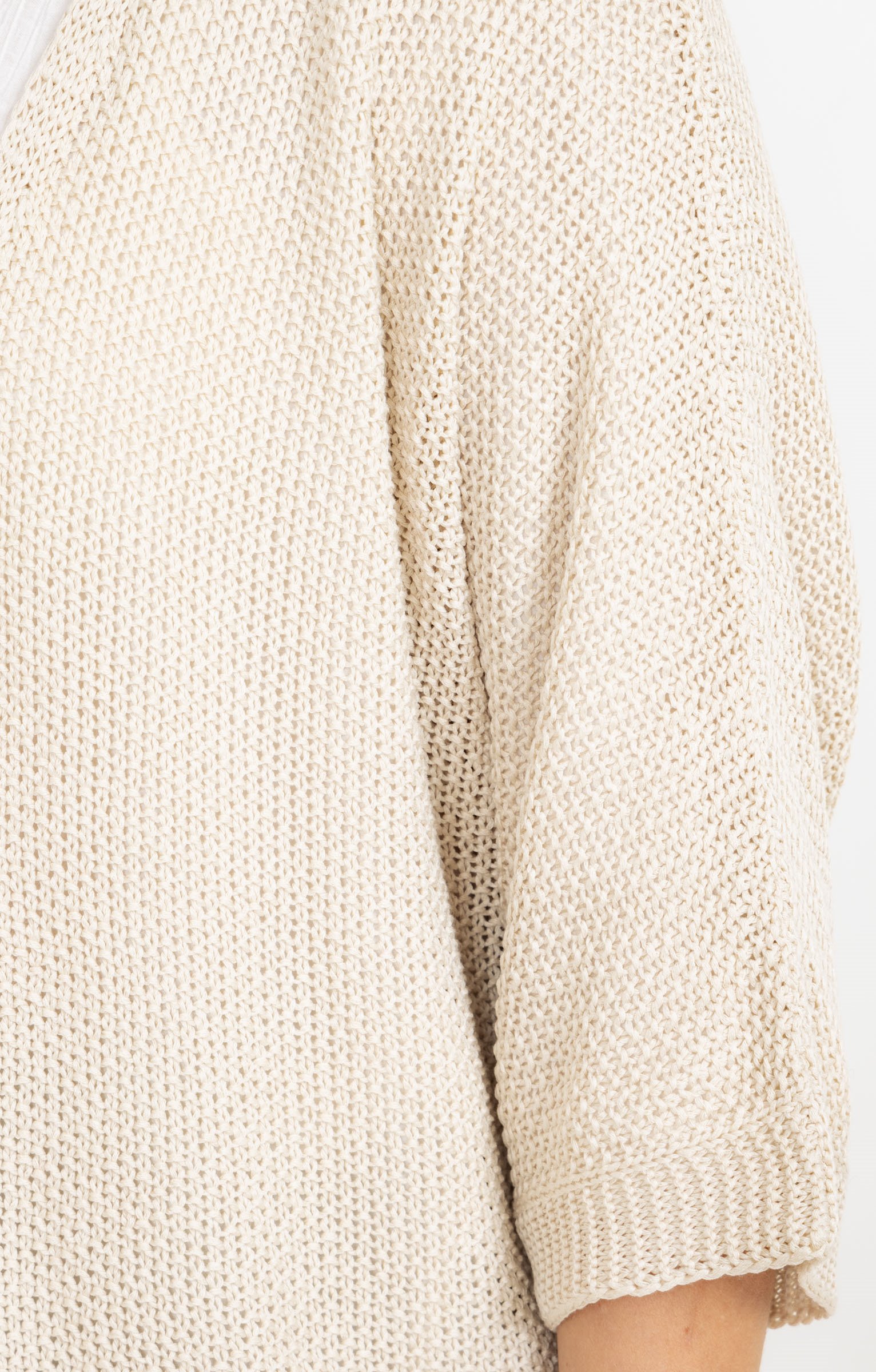 Cardigan en maille ajourée. Coupe droite ample. Manches 3/4 à emmanchures droites. Col châle. Maille ajourée unie. Finitions bords-côtes. Portez ce cardigan avec une chemise et un pantalon unis, tout simplement.