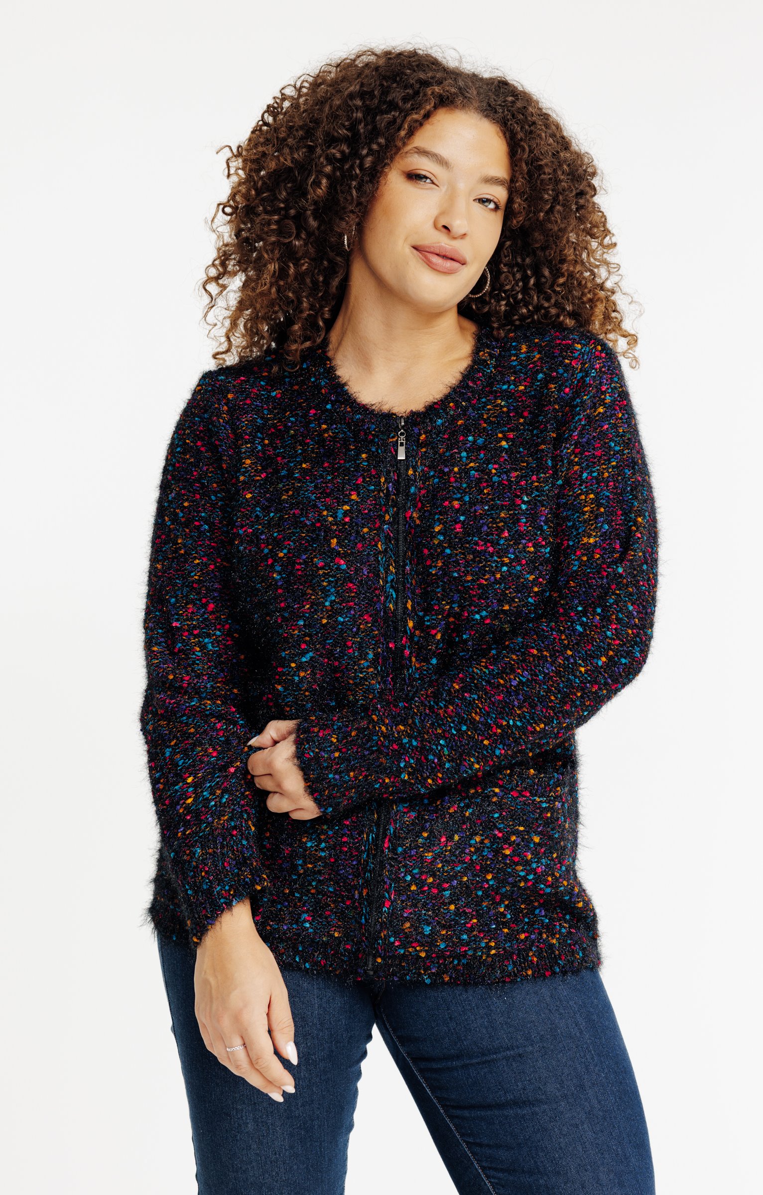 Ajoutez une touche d'éclat à vos tenues du quotidien avec ce cardigan zippé. Cardigan zippé en maille popcorn multicolore. Coupe droite. Manches longues à emmanchures droites. Col rond. Fermeture zippée sur le devant. Maille popcorn avec points multicolores.