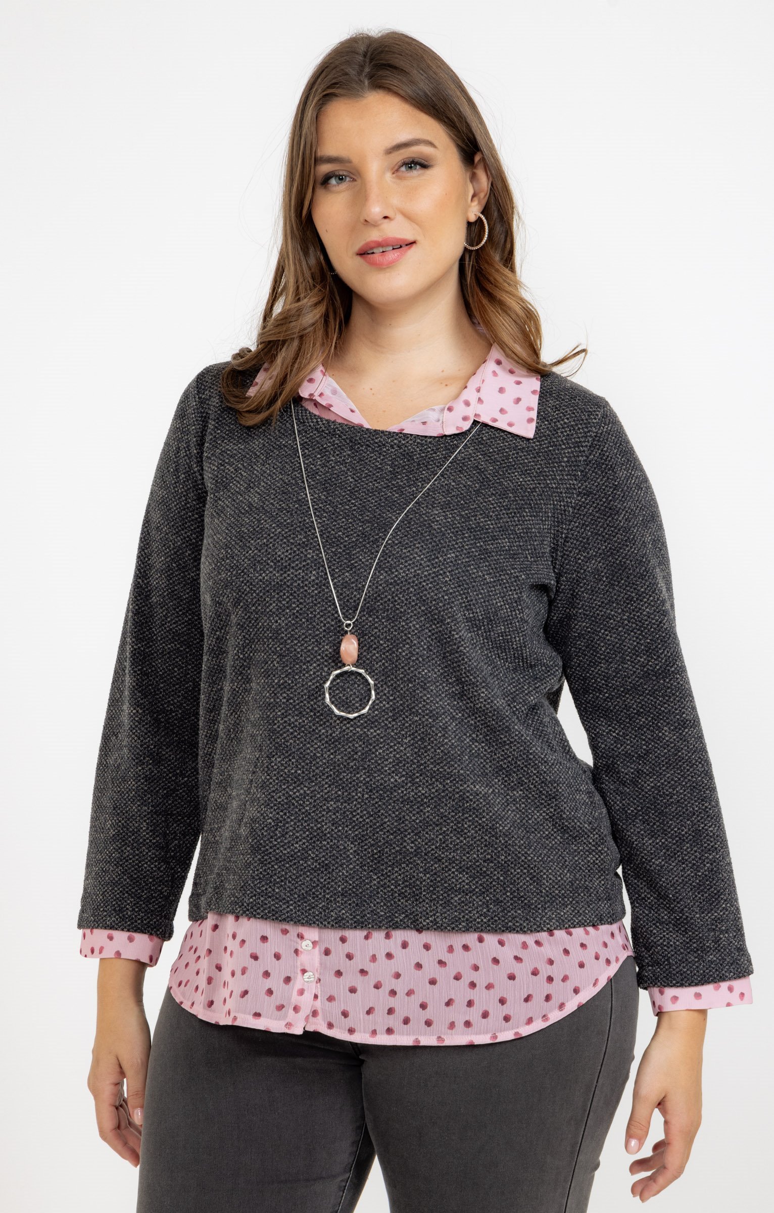 Pull 2 en 1 à manches longues et collier. Coupe droite. Manches longues. Emmanchures droites. Col classique et col rond. Pull chiné. Effet chemisier à motifs tachetés en camaïeu de tons. Tricot en maille façonnée. Touches chemisier en voile. 2 petits boutons décoratifs à la base devant. Collier sautoir avec chaîne en maille serpent ronde, perle marbrée et anneau géométrique.
