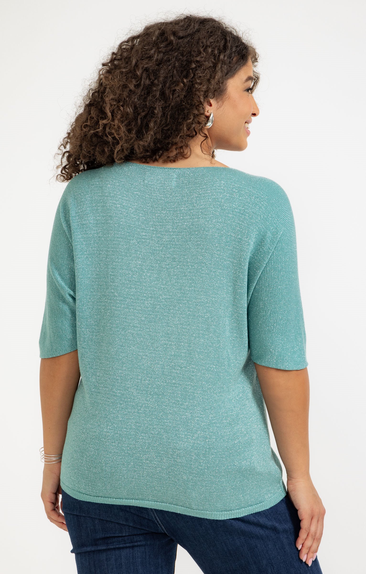 Pull grande taille fin en maille métallisée. Coupe droite. Manches aux coudes sans emmanchures. Col V. Fine maille métallisée. Petits bords-côtes à la base. Composition en modal mélangé. Portez ce pull léger avec votre jean préféré, tout simplement.