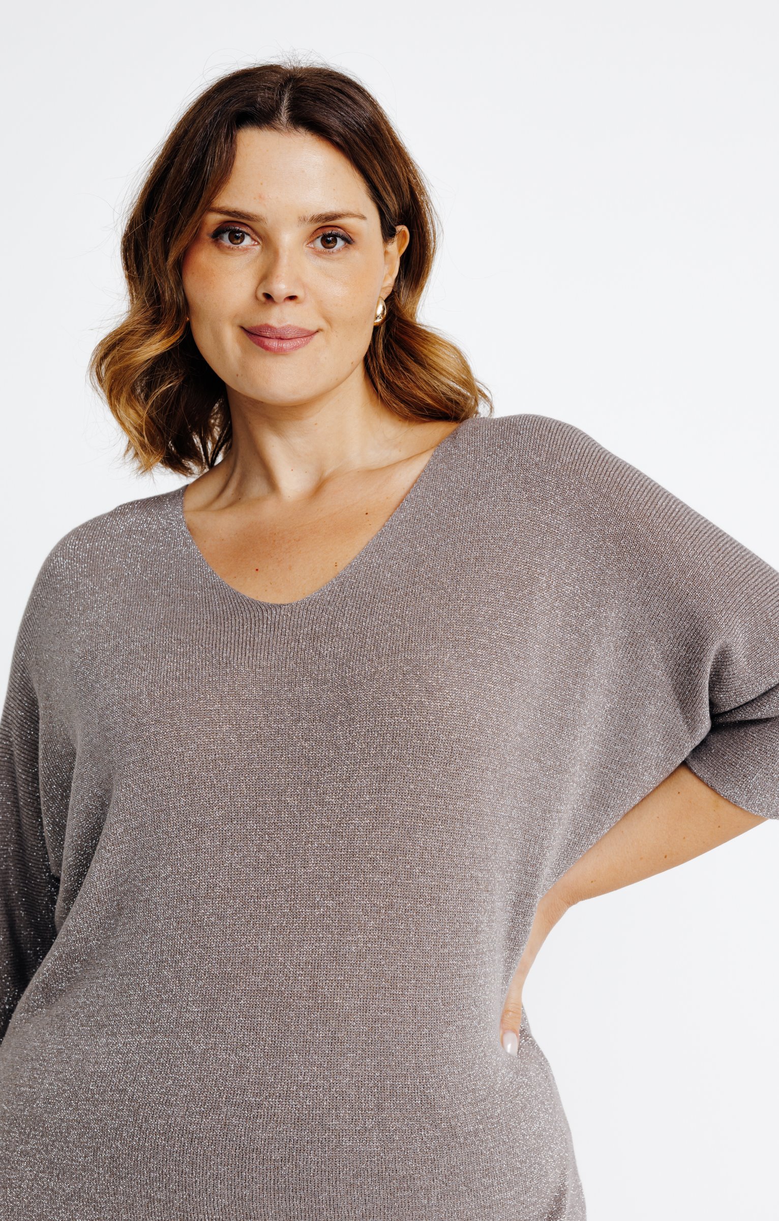 Pull grande taille fin en maille métallisée. Coupe droite. Manches aux coudes sans emmanchures. Col V. Fine maille métallisée. Petits bords-côtes à la base. Composition en modal mélangé. Portez ce pull léger avec votre jean préféré, tout simplement.