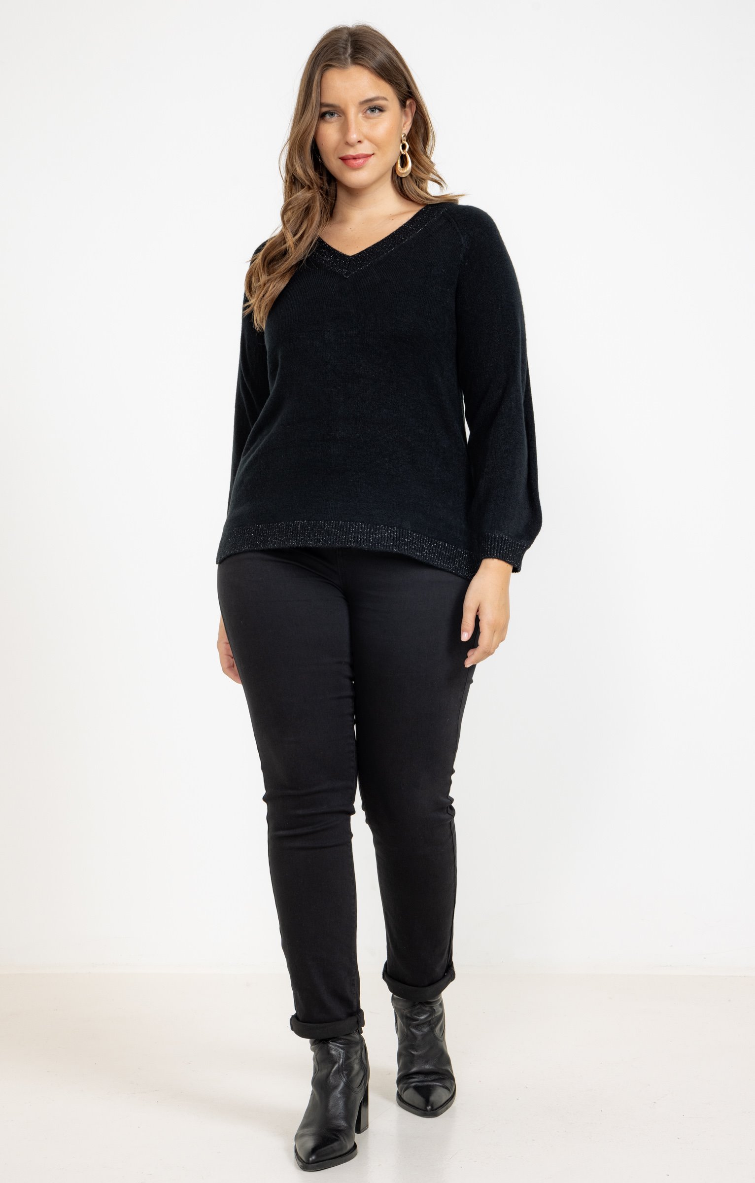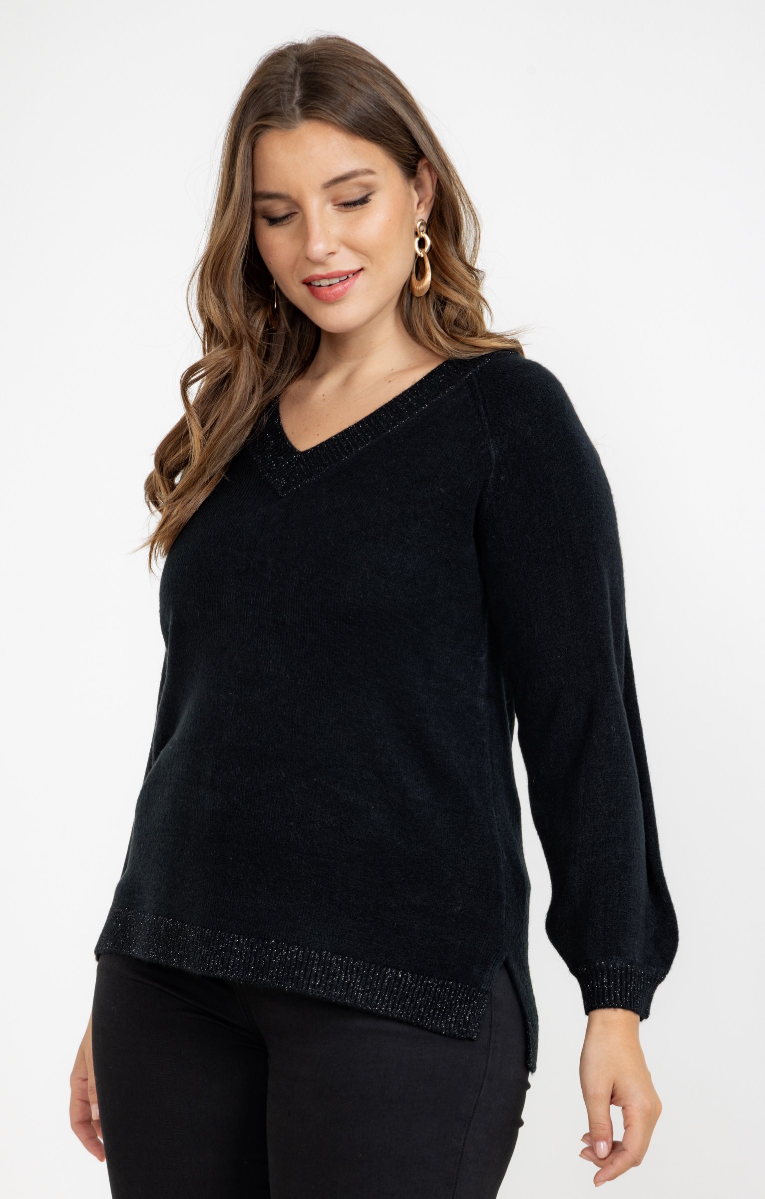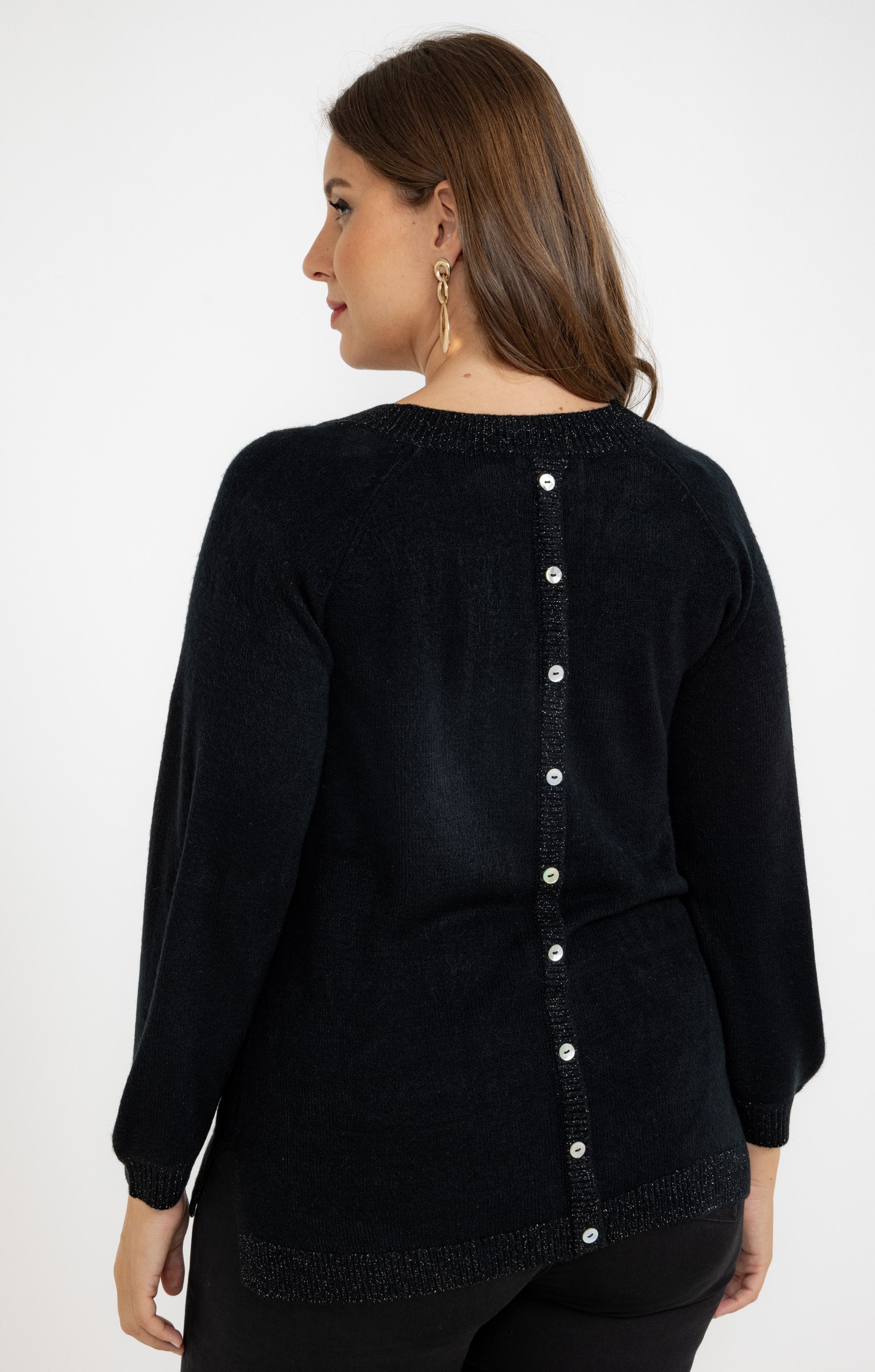 Pull à manches longues aux touches métallisées et boutons décoratifs. Coupe droite. Manches longues. Emmanchures raglan. Col V. Teinte unie. Col, poignets, base et bandes centrées au dos tissés de fils métallisés. Maille jersey. Finitions en côtes. Effet fermeture au dos par boutons ornementaux en ton sur ton. Fentes latérales à la base.