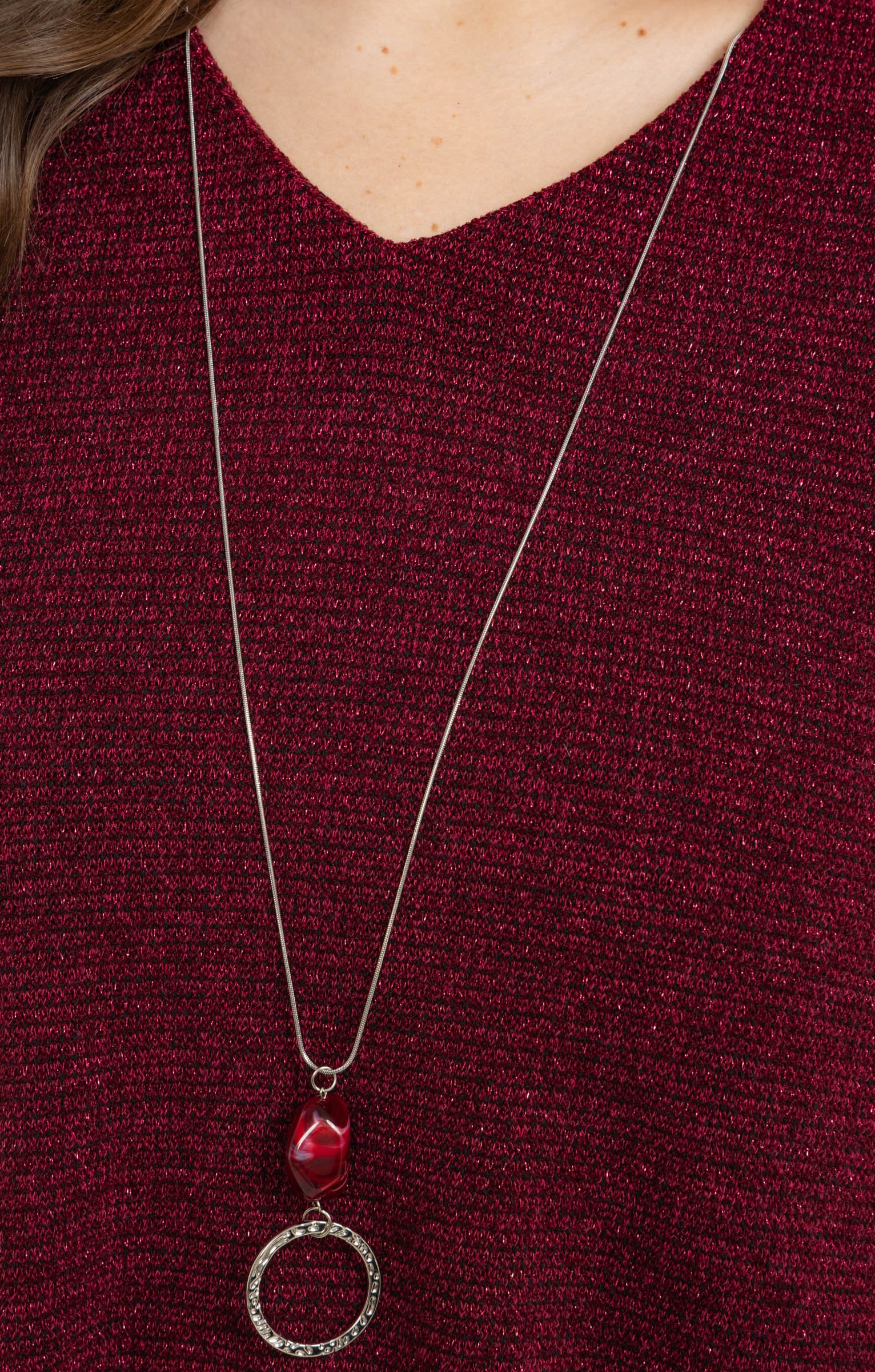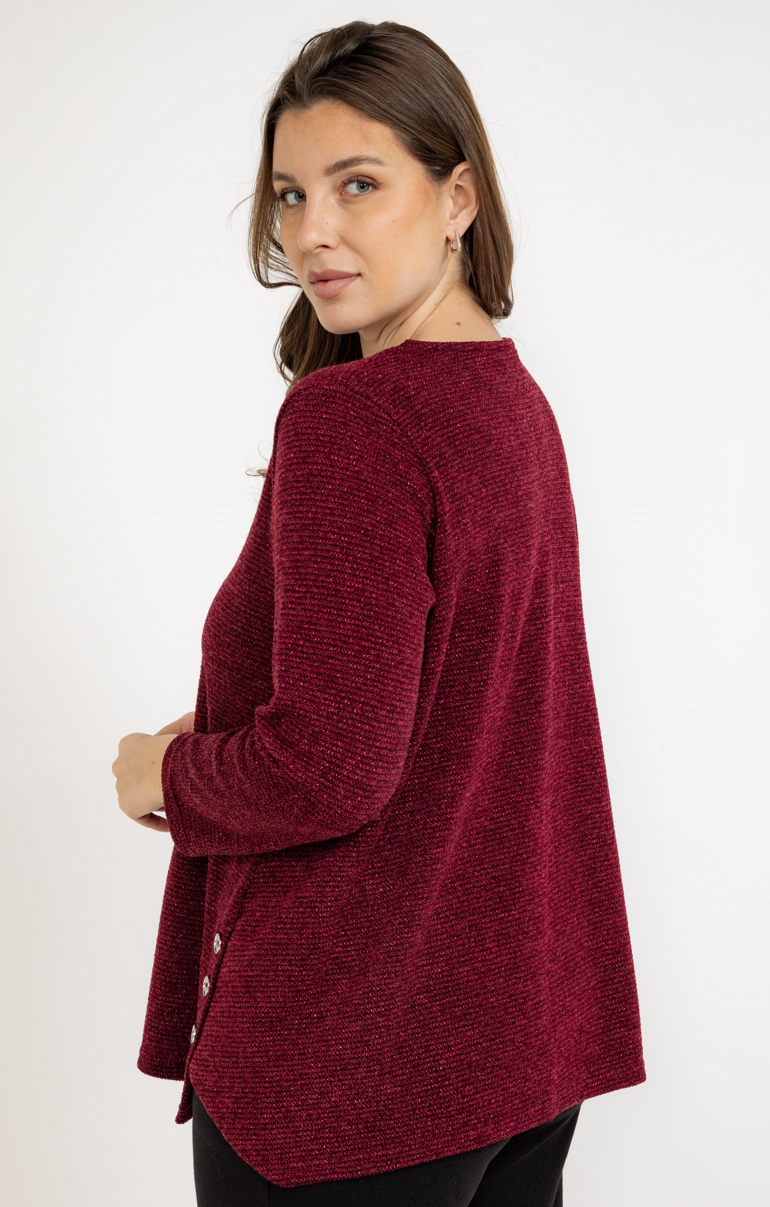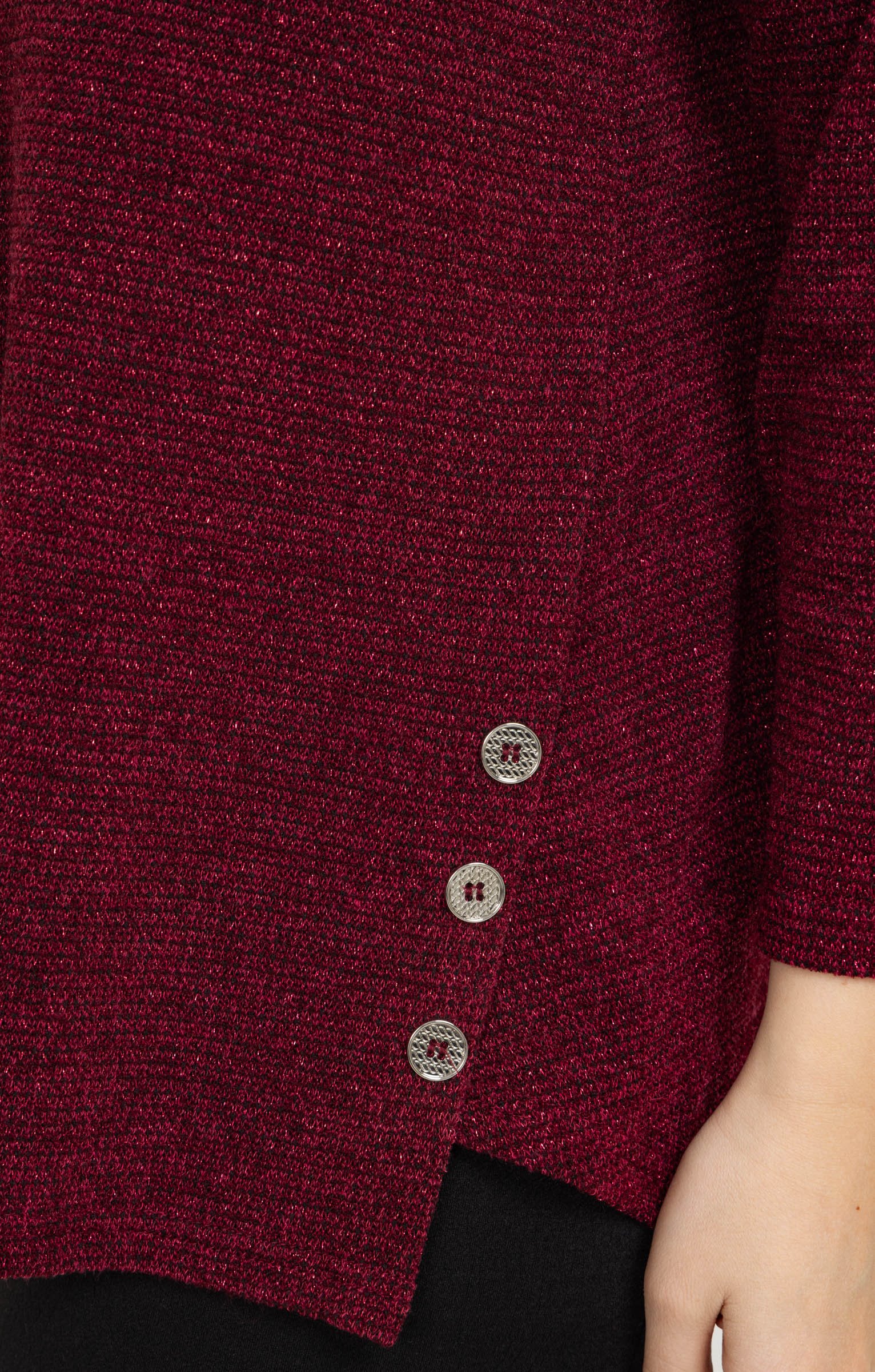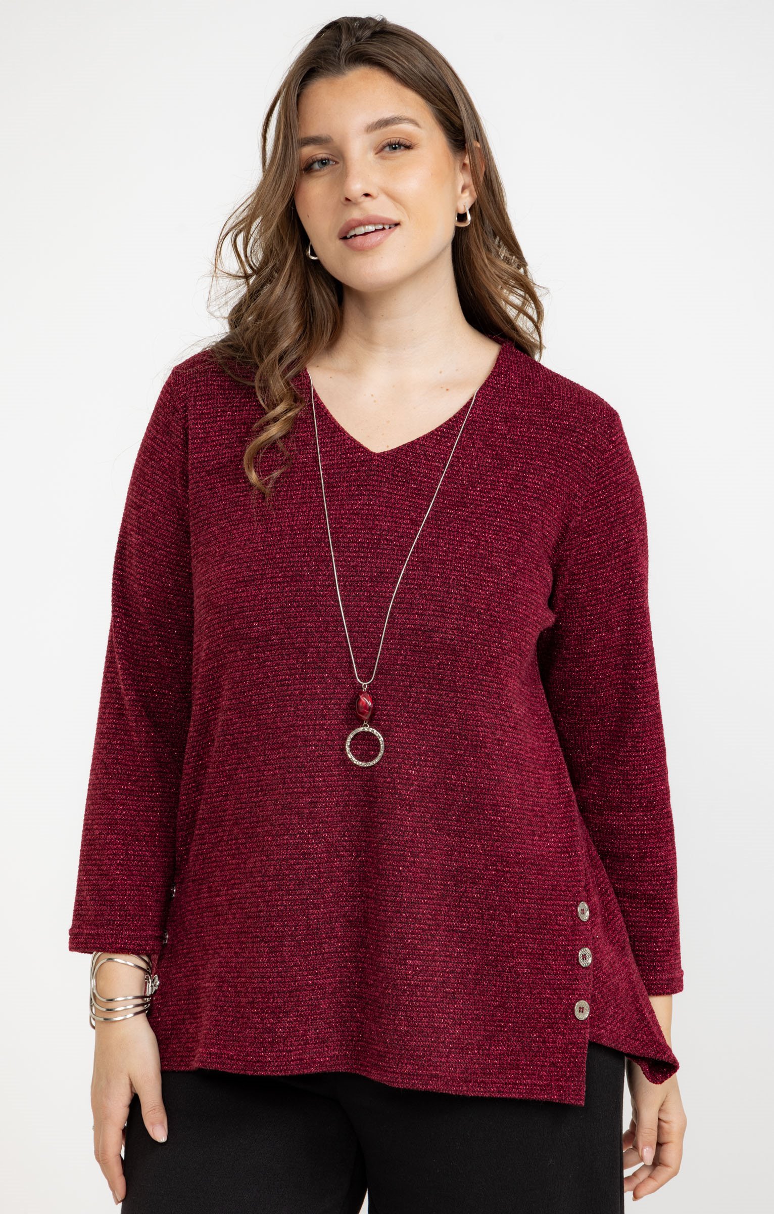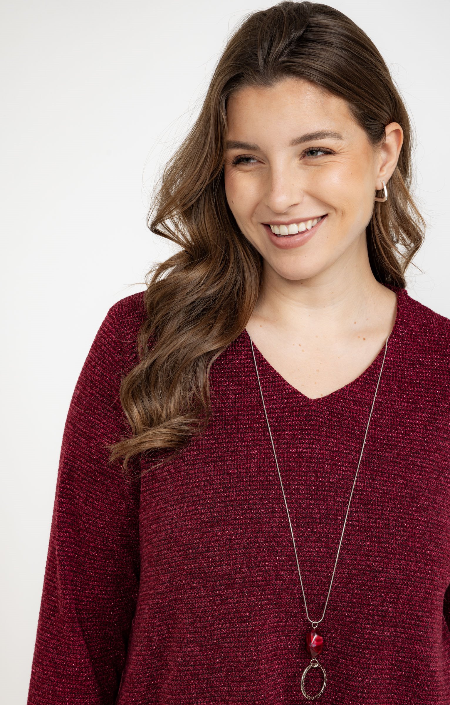 Pull à manches longues avec collier. Coupe fluide. Manches longues. Emmanchures droites. Col V. Coloris chiné. Maille texturée tissée de fils métallisés. Découpes géométriques à la base devant. Boutons en métal à motifs effet quadrillage sur découpes. Collier en maille serpent rond avec pendentif mobile anneau marbré, perle et pastille en métal.
