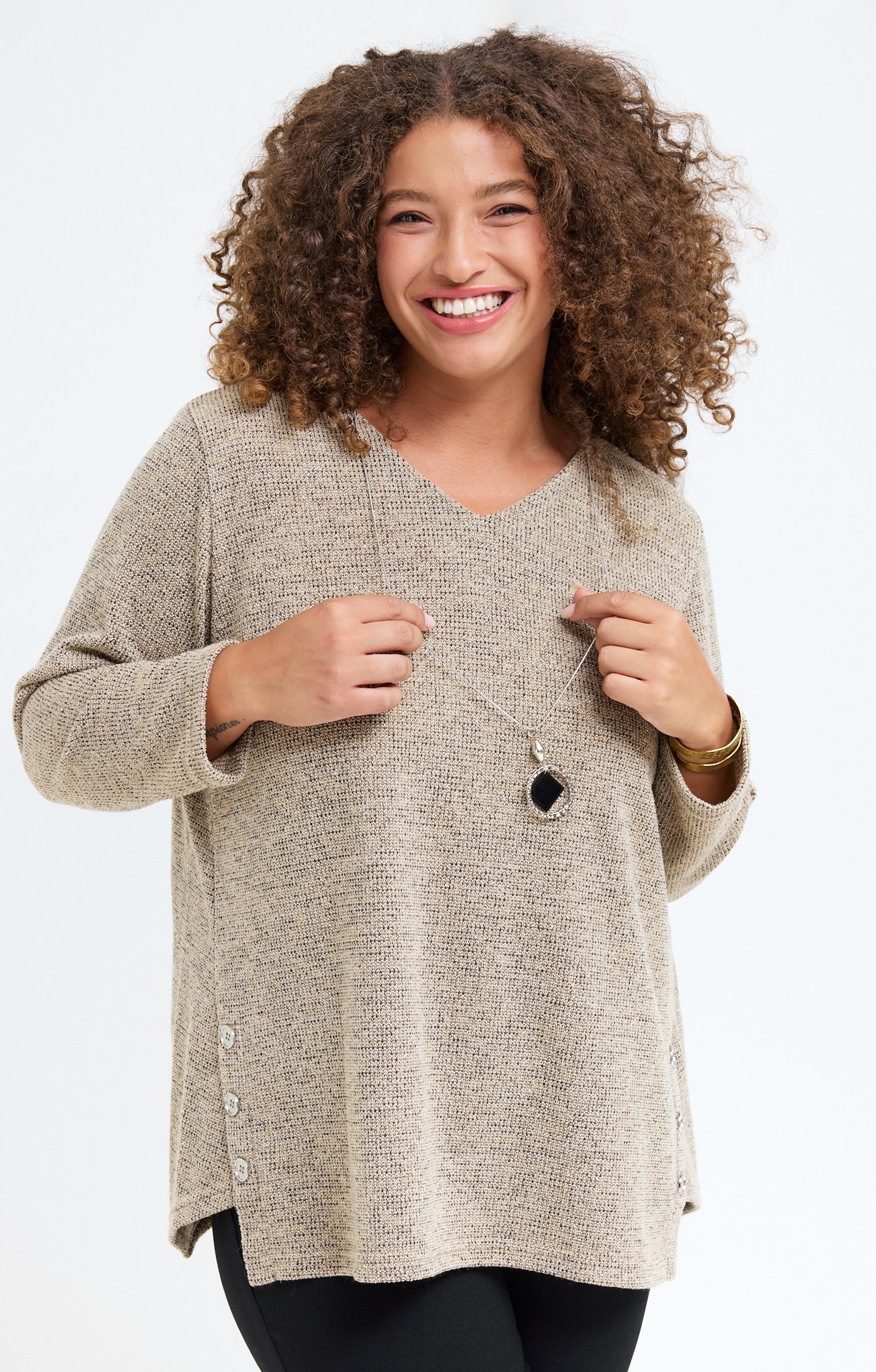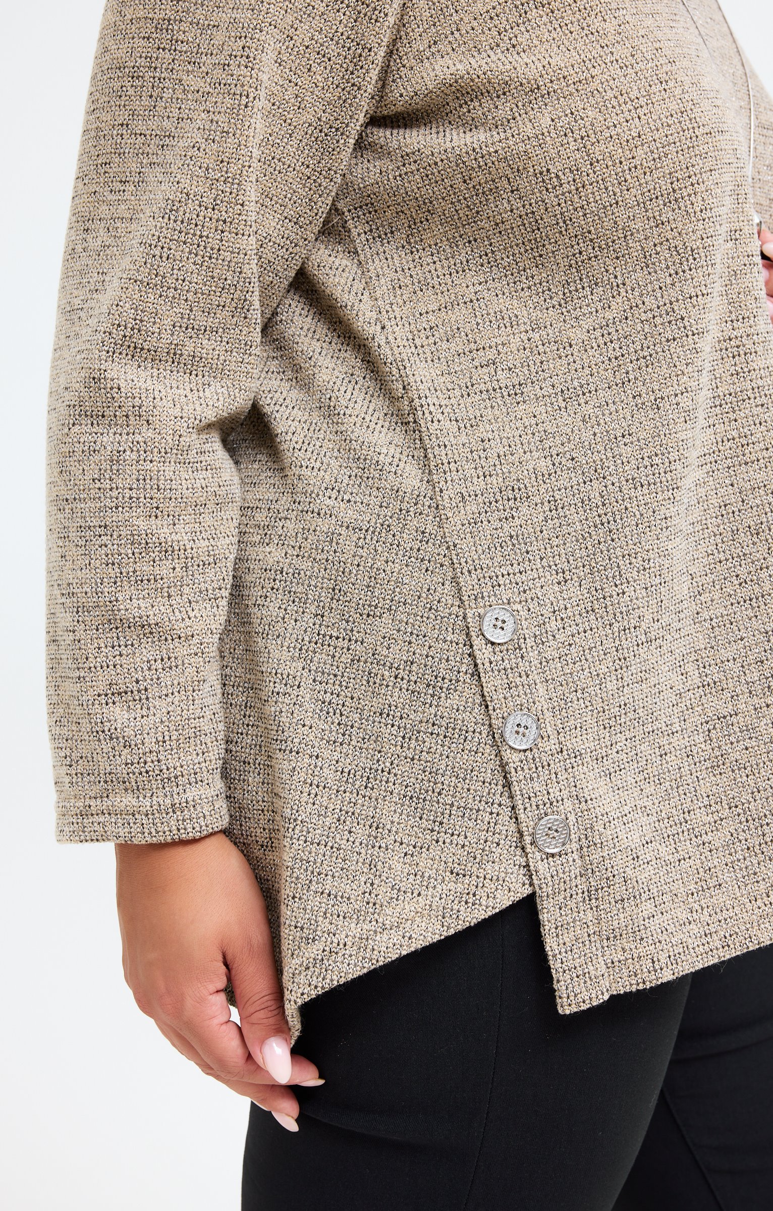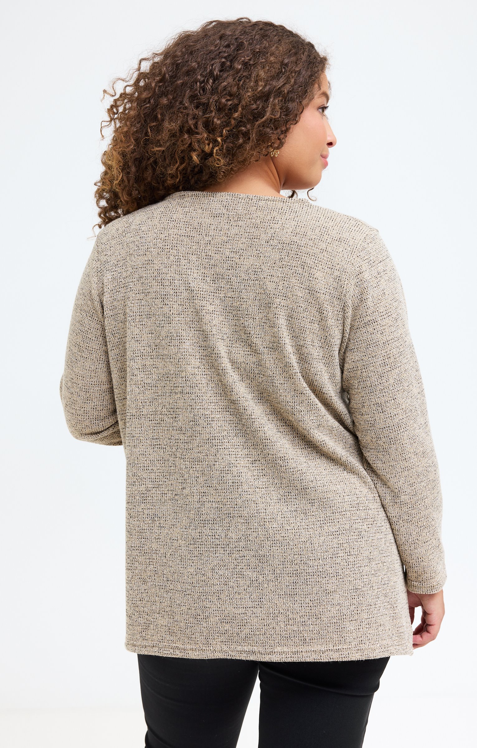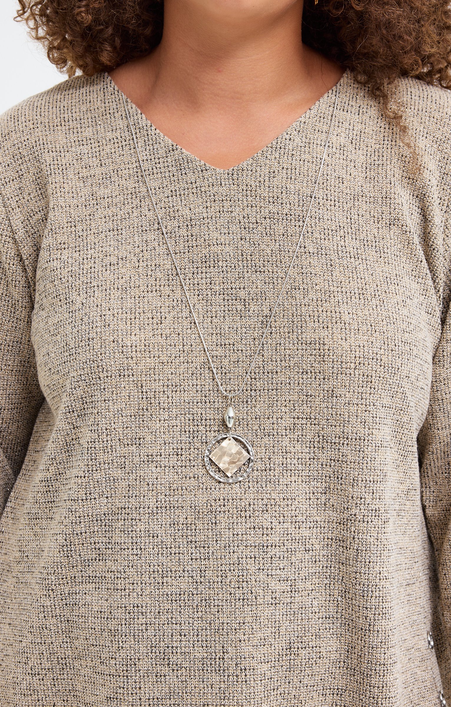 Pull à manches longues avec collier. Coupe fluide. Manches longues. Emmanchures droites. Col V. Coloris chiné. Maille texturée tissée de fils métallisés. Découpes géométriques à la base devant. Boutons en métal à motifs effet quadrillage sur découpes. Collier en maille serpent rond avec pendentif mobile anneau marbré, perle et pastille en métal.