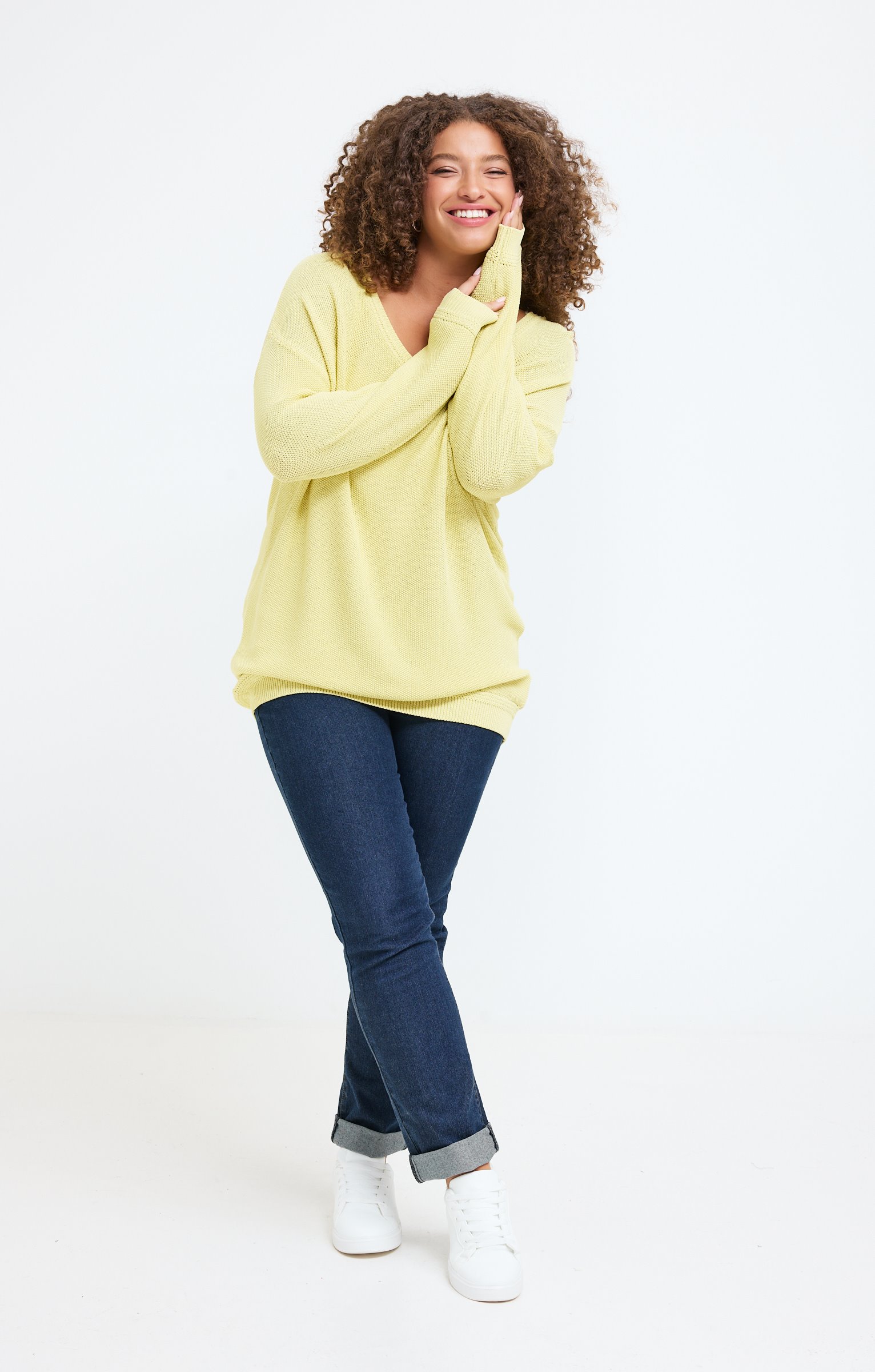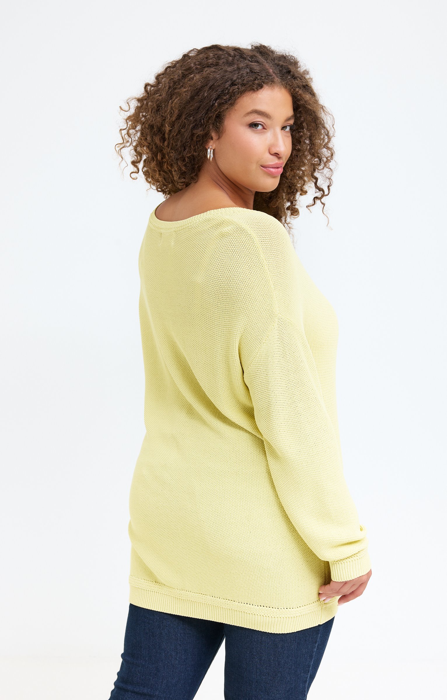 Décontracté et confortable, ce pull apporte une touche colorée aux tenues quotidiennes. Pull mi-long à manches longues en tricot uni fantaisie. Coupe droite mi-longue. Manches longues. Emmanchures tombantes. Décolleté V. Teinte unie. Tricot en maille fantaisie fine. Col, poignets et base en côtes et point façonné délicatement ajouré.