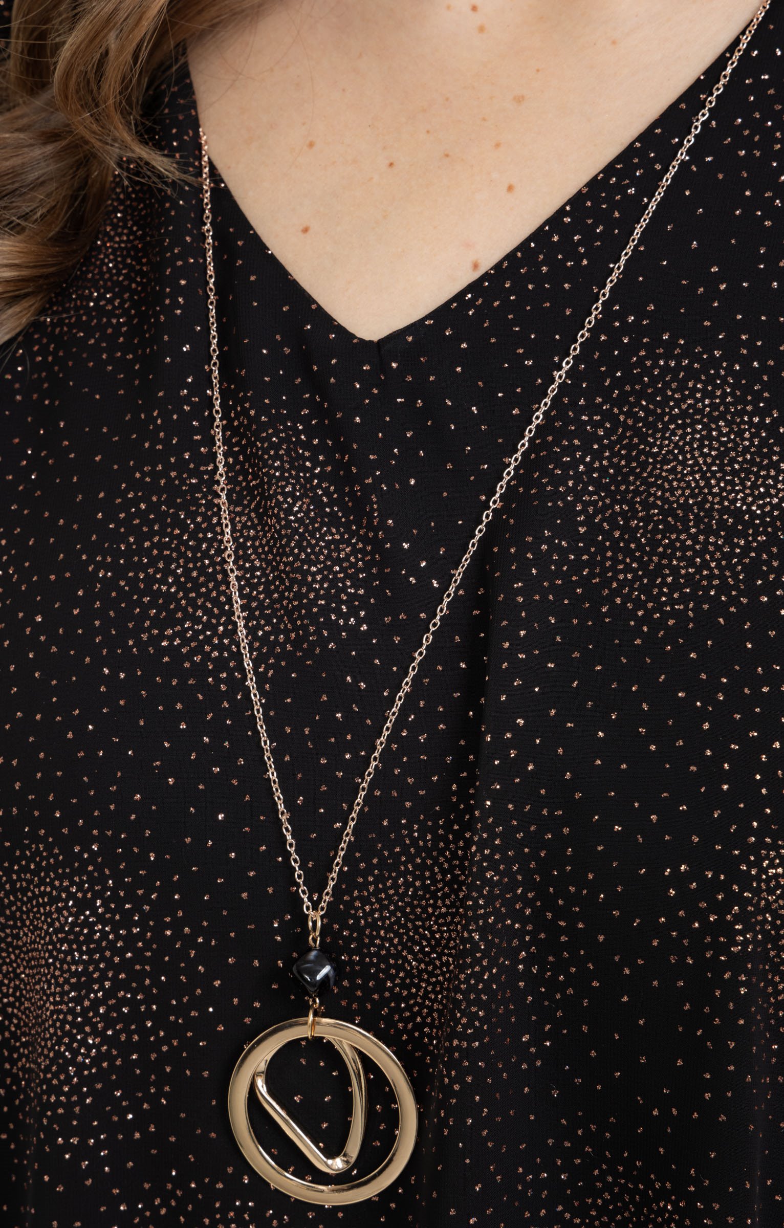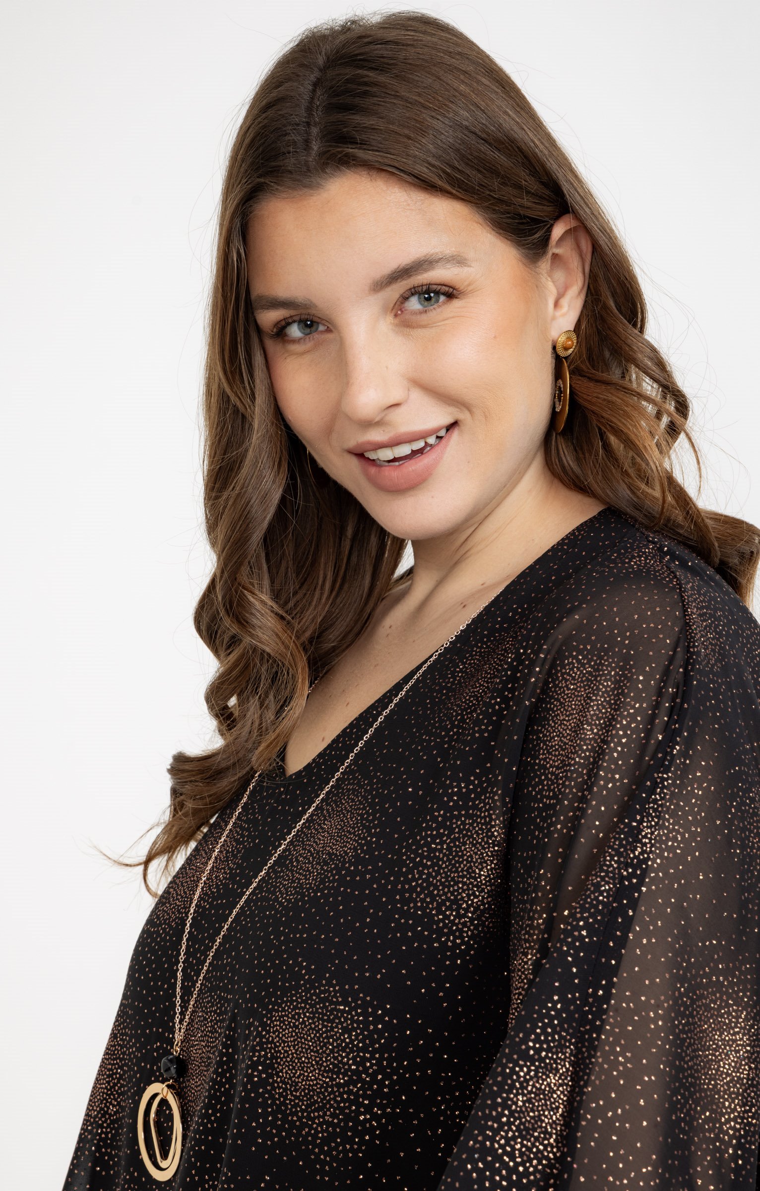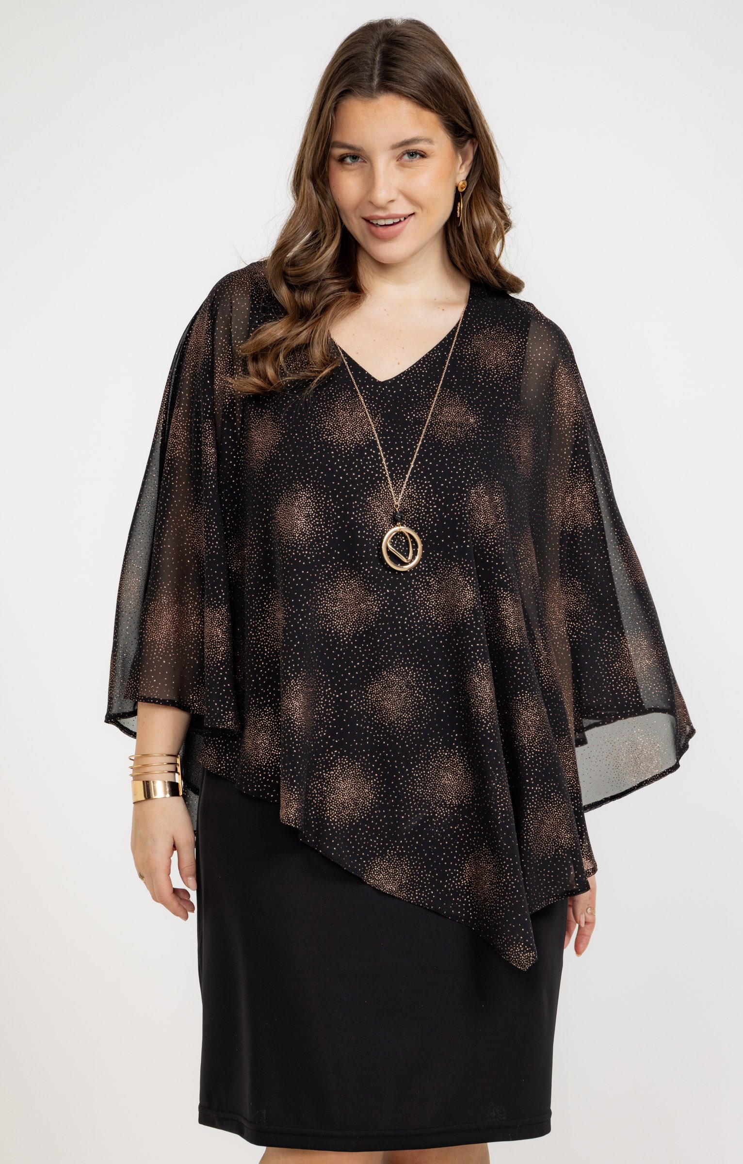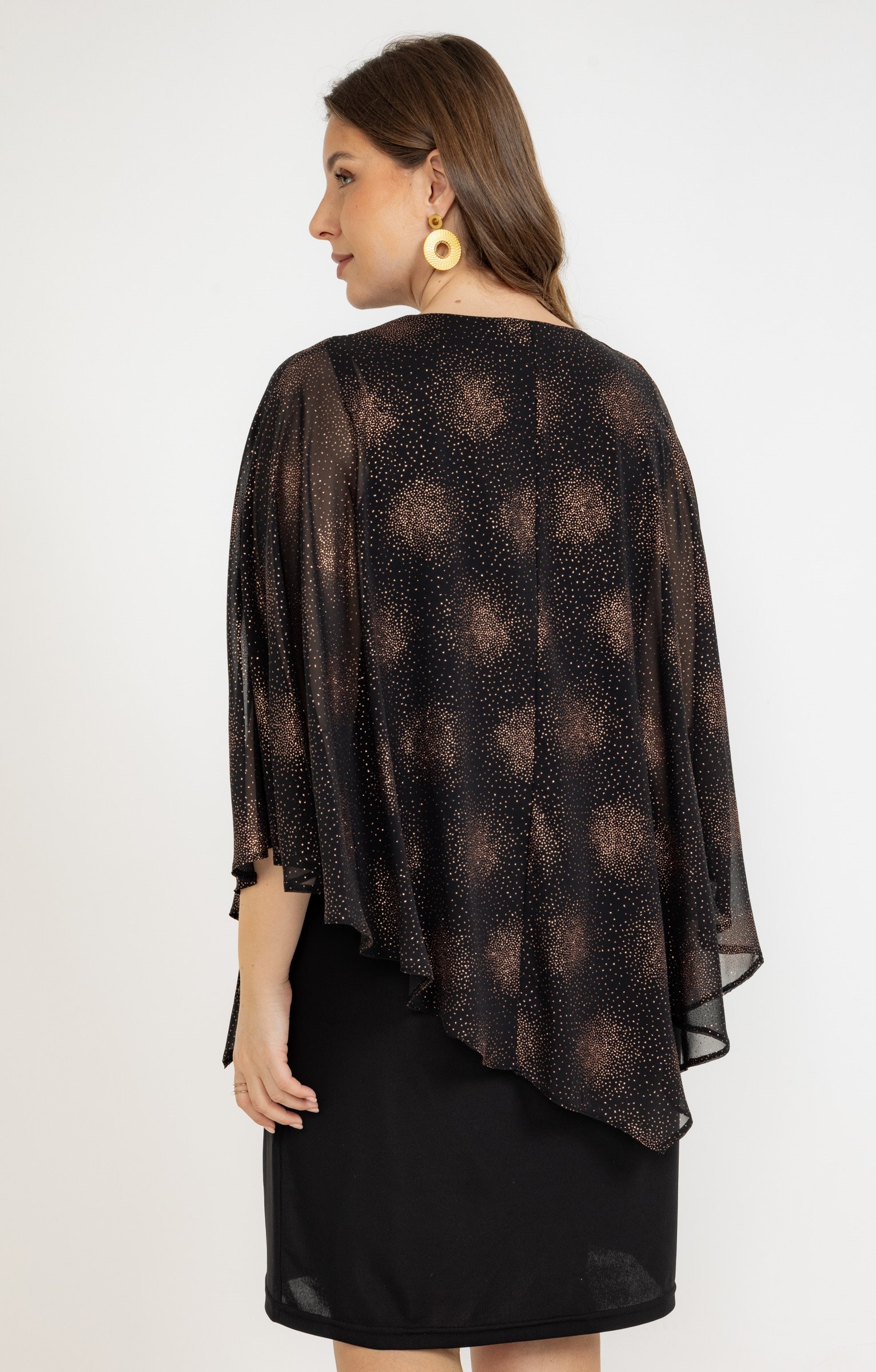 Robe de fêtes 2 en 1 effet poncho pailleté et collier. Coupe ajustée longueur genoux. Manches aux coudes. Col V. Robe teinte unie. Effet poncho à motifs ronds à paillettes contrastées. Robe à bretelles en maille extensible. Poncho en voile non doublé. Collier sautoir en maille serpent ronde et pendentif à 2 anneaux irréguliers suspendus à une perle.