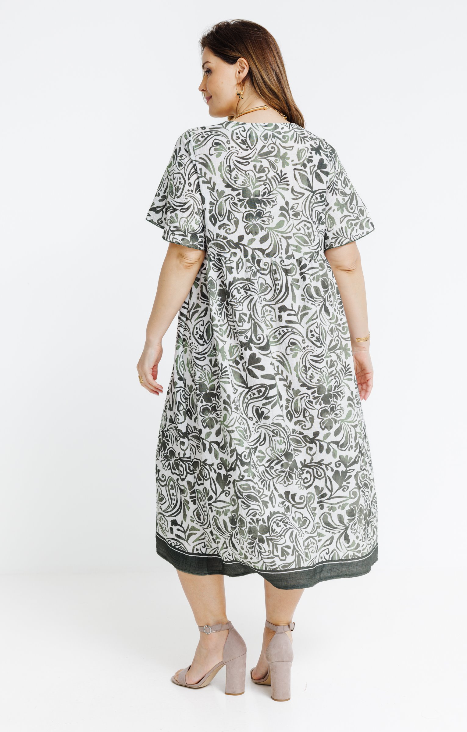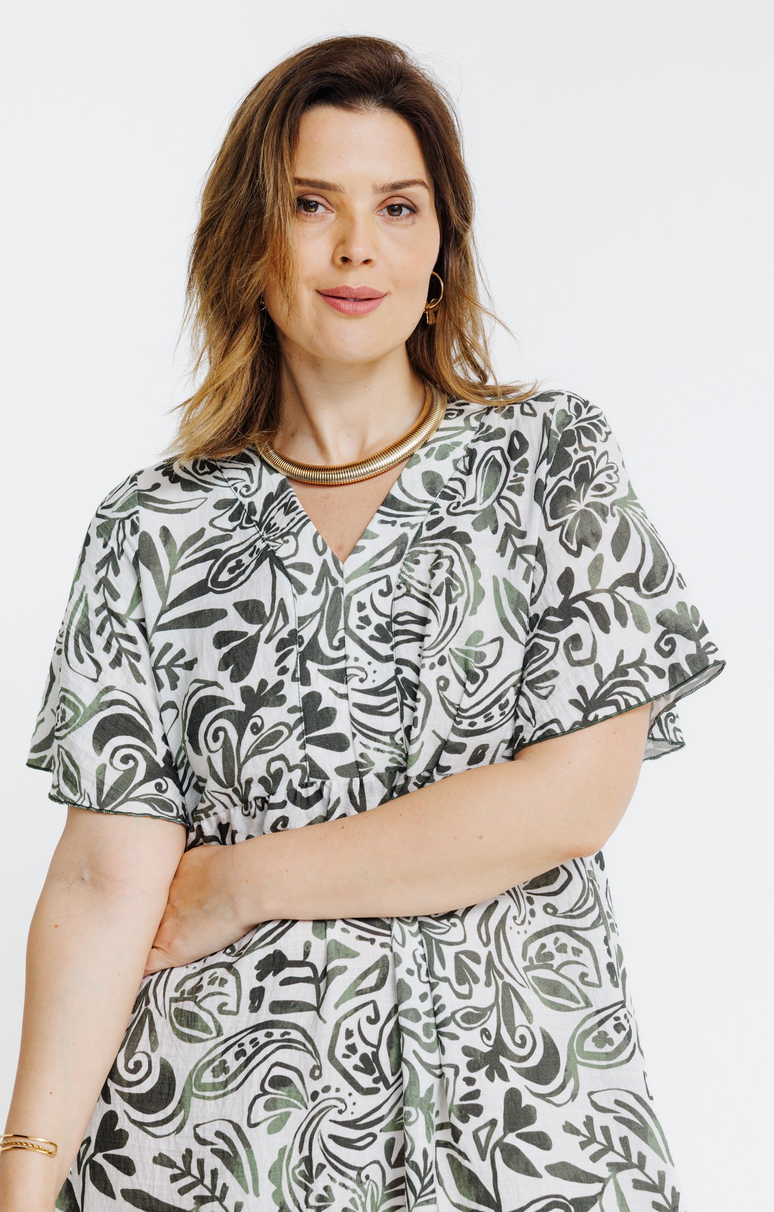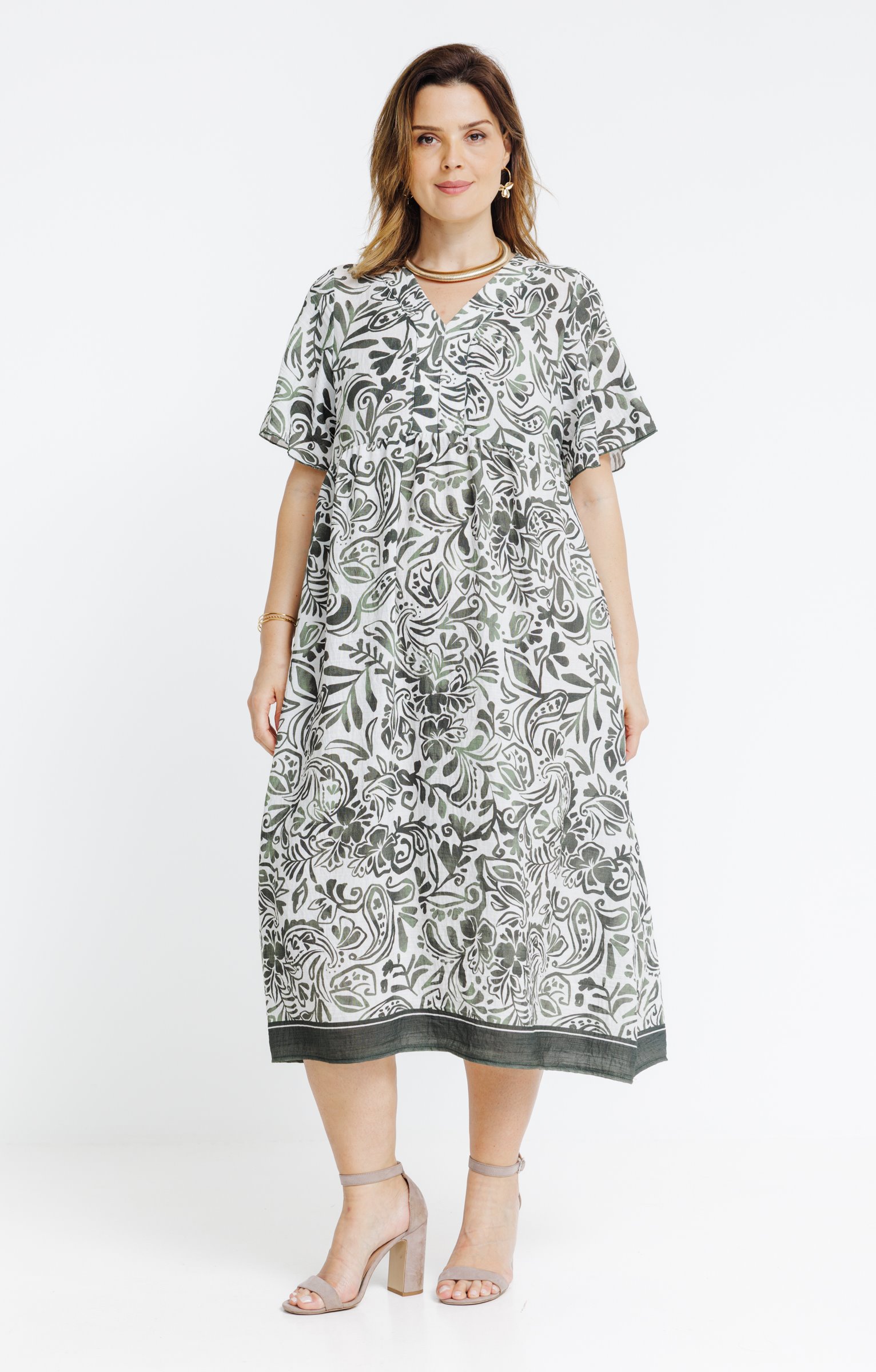 Robe longue grande taille évasée à manches courtes volantées avec col en V. Longueur chevilles. Imprimé floral sur l'ensemble du modèle. Jeu de fronces sous poitrine. Base arrondie avec finition contrastante.