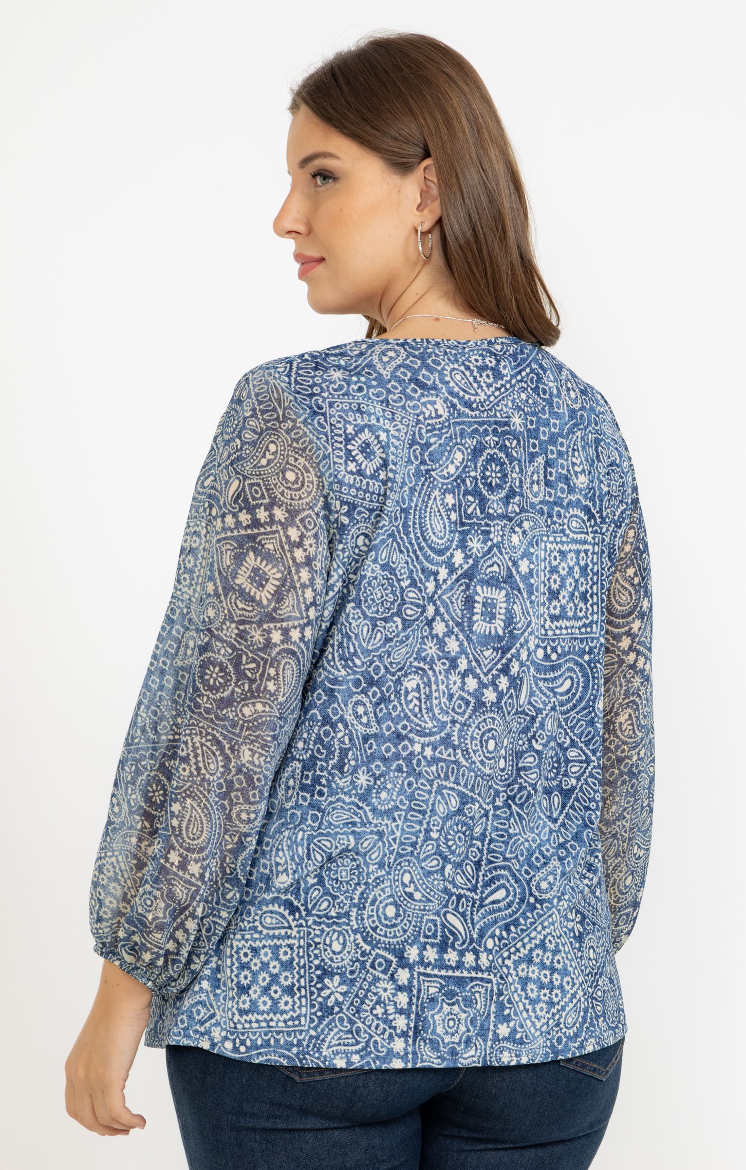 T-shirt imprimé cachemire à manches longues et col rond. Coupe droite. Manches longues avec poignets élastiqués. Col rond avec découpe en V et détails passepoilés unis. Imprimé cachemire. Tissu corps en maille extensible. Manches en voile avec fibres métalliques. Découpe façon plastron avec base à fines fronces au niveau de l'encolure. Base droite.