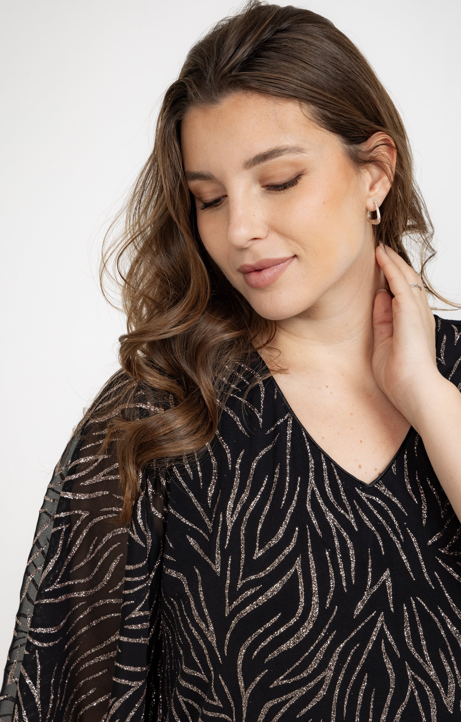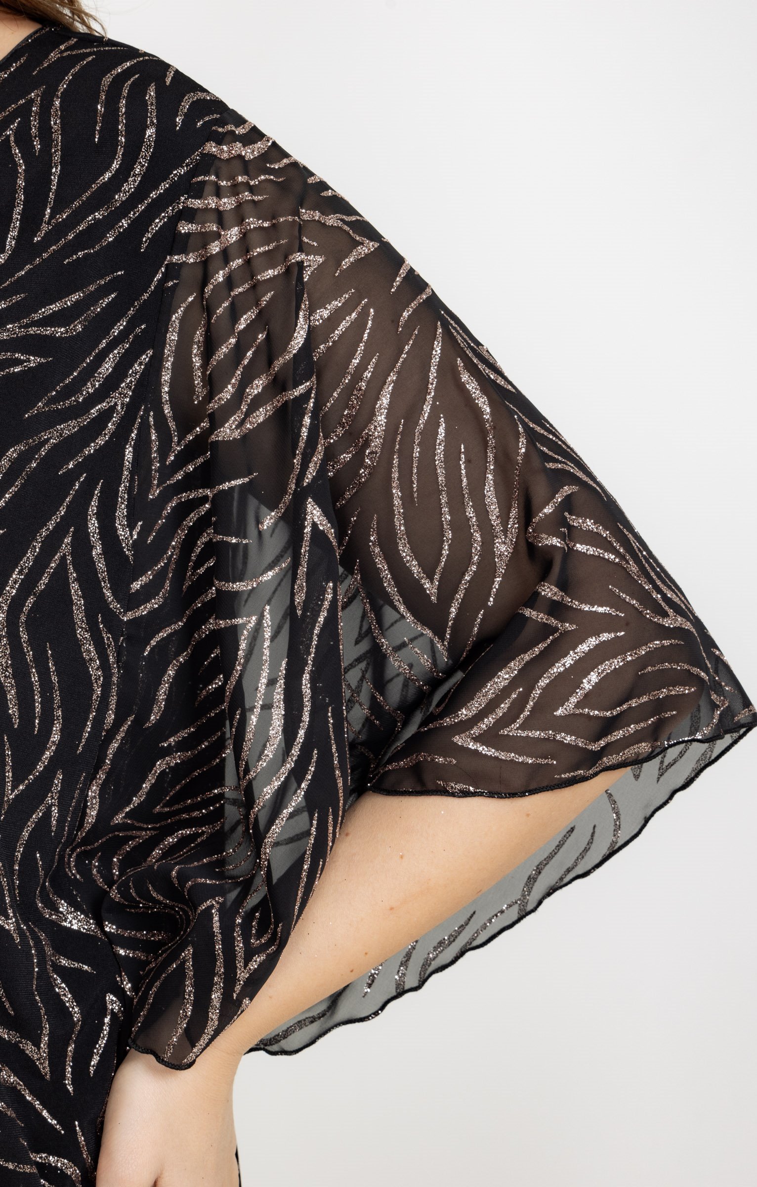 Poncho col V à motifs pailletés. Coupe droite ample. Manches chauve-souris en voile transparent. Col V. Imprimé à motifs graphiques métallisés sur fond uni sur l'ensemble du modèle. Matière extensible. Portez ce poncho avec un pantalon fluide noir, des escarpins et des bijoux dorés pour rayonner lors des fêtes.