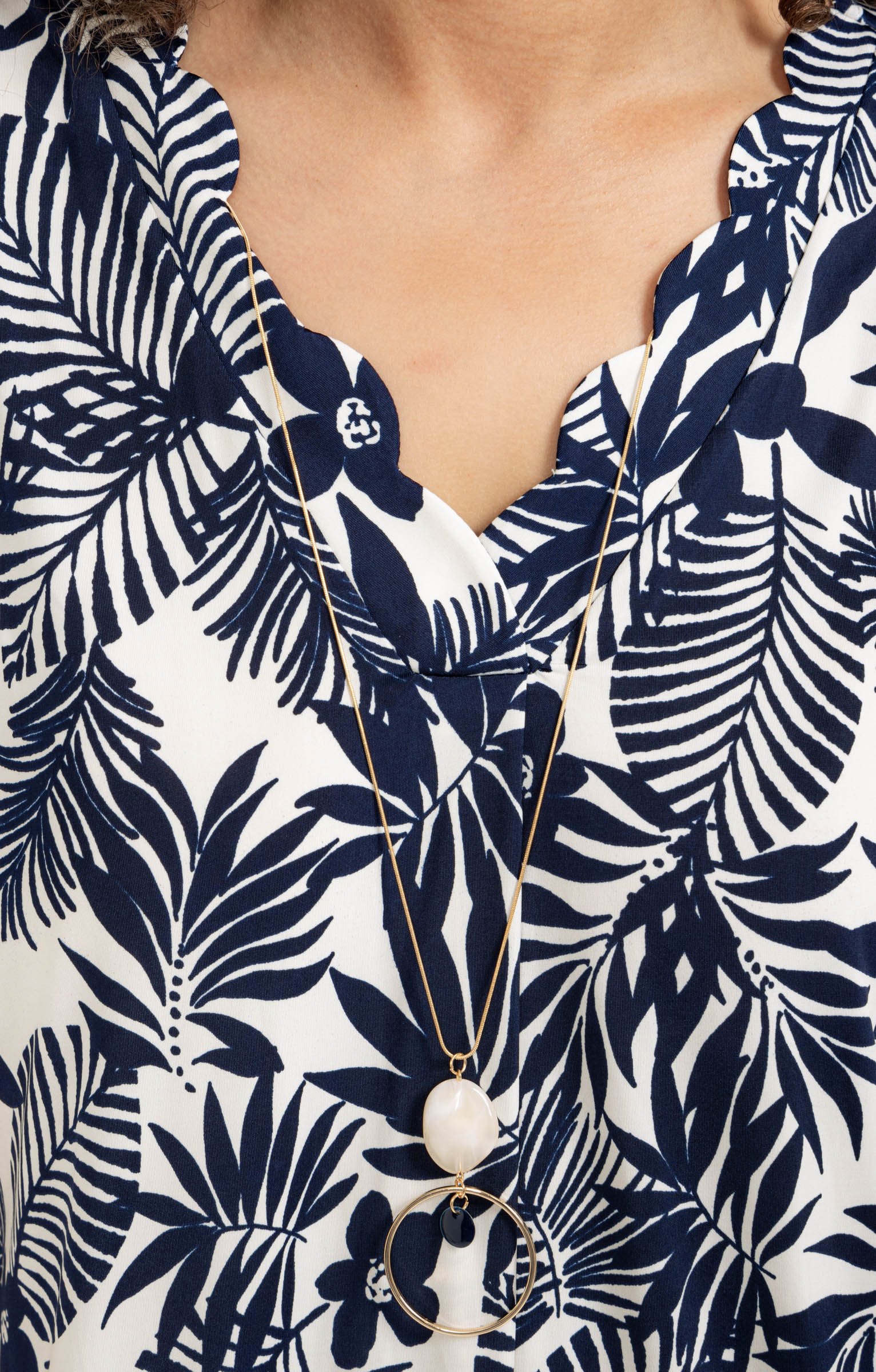 Tee-shirt imprimé à manches courtes avec col en V festonné. Collier intégrant pouvant être retiré. Coupe droite. Imprimé à motifs de feuilles sur l'ensemble. Manches courtes en tissu léger. Finition des bords arrondie.