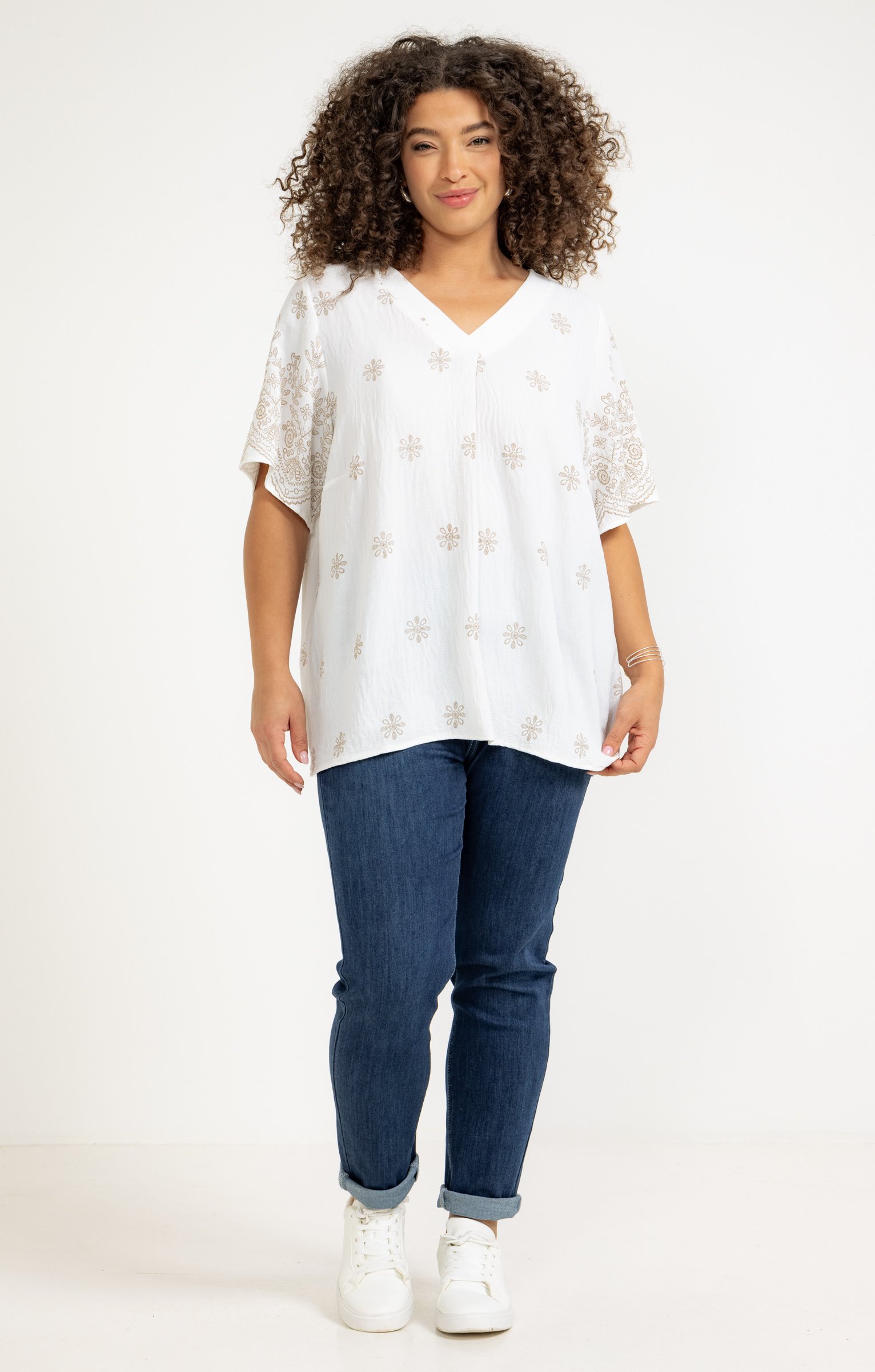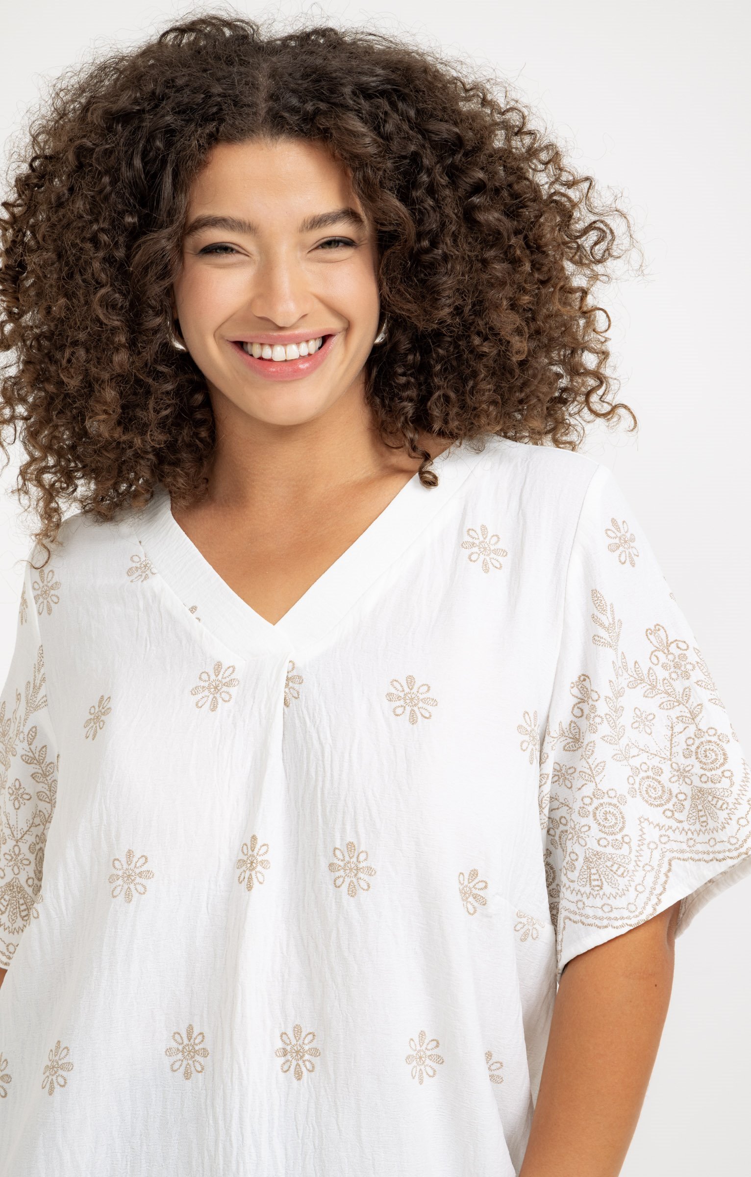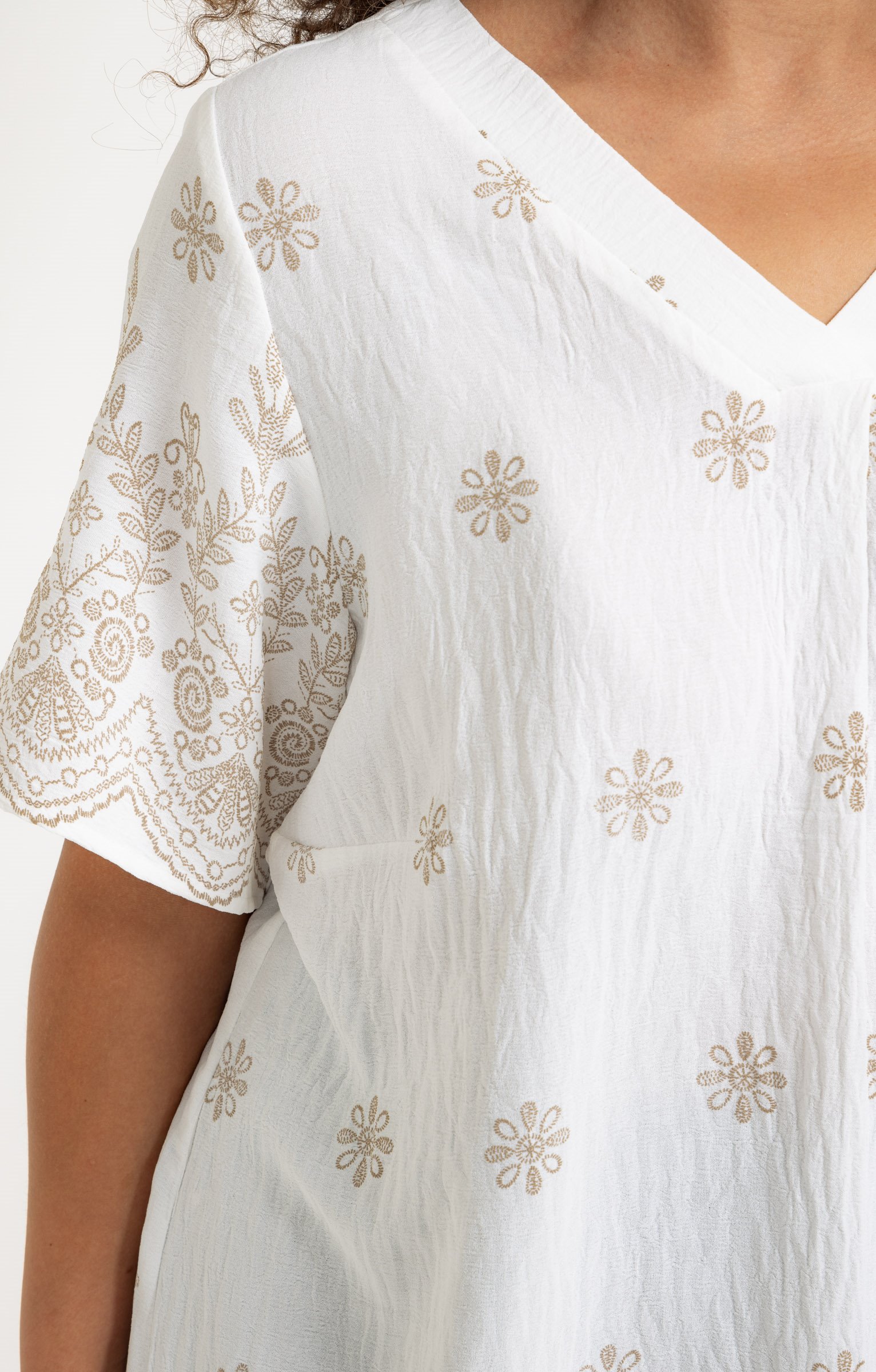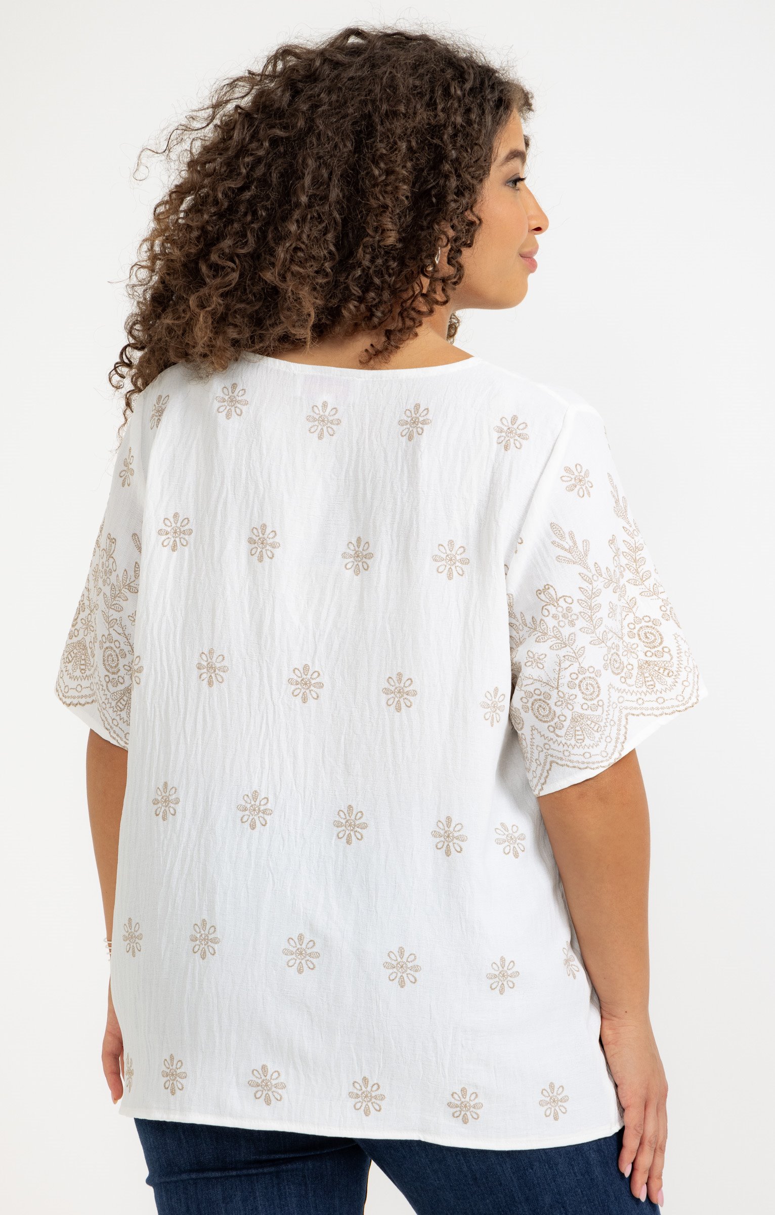 T-shirt à manches courtes avec col en V. Coupe droite. Broderies florales sur l'ensemble, avec des motifs en relief sur les manches. Plis sur le devant. Longueur standard. Finition des bords arrondie.