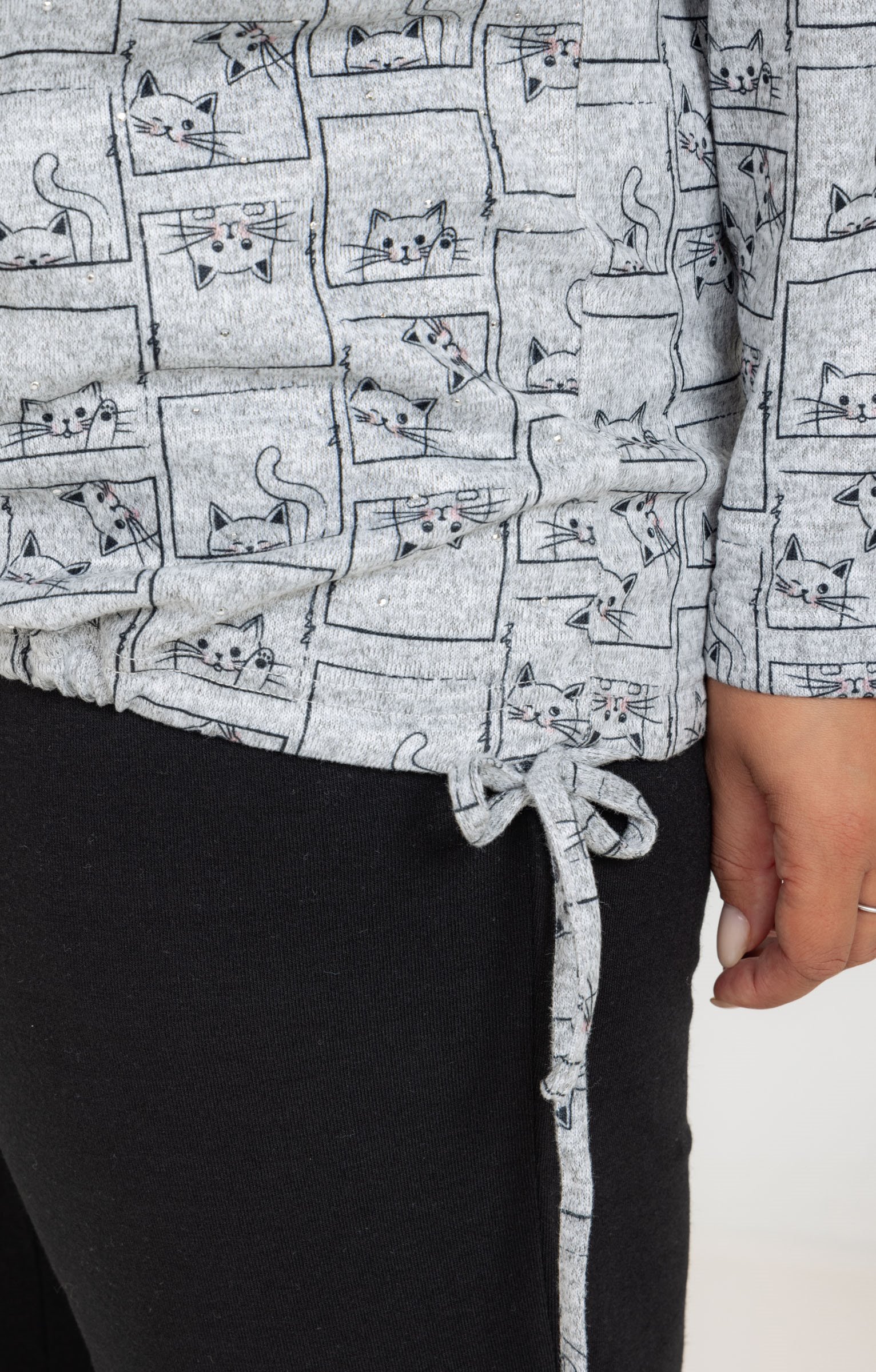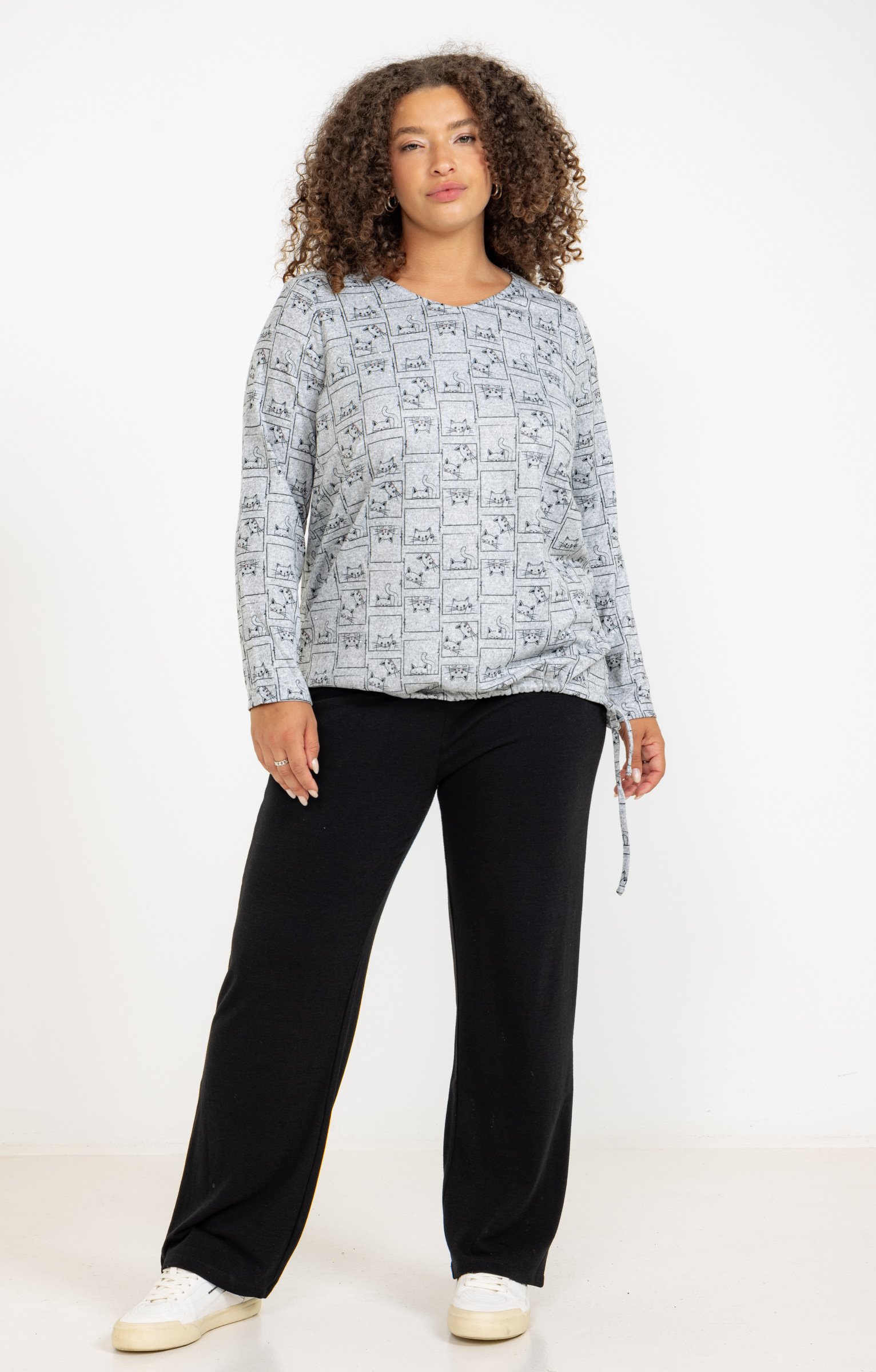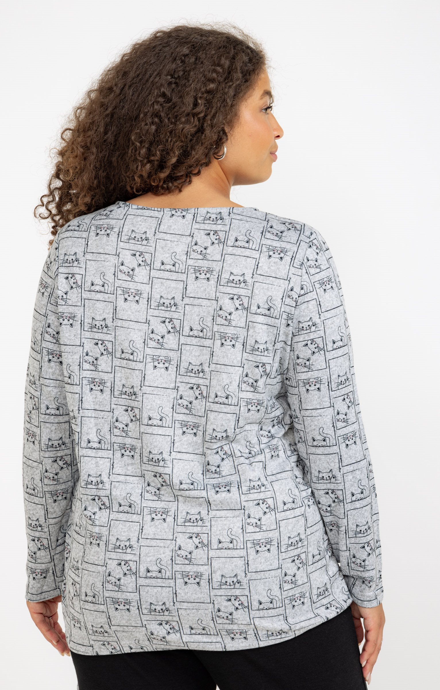 T-shirt en maille imprimé chats à manches longues et col V. Coupe droite. Manches longues. Col V. Imprimé chats sur toute la surface. Dessins chats encadrés effet patchwork en motifs. Tissu en maille extensible. Surpiqûres ton sur ton en bordure du col, des poignets et de la base. Base droite.
