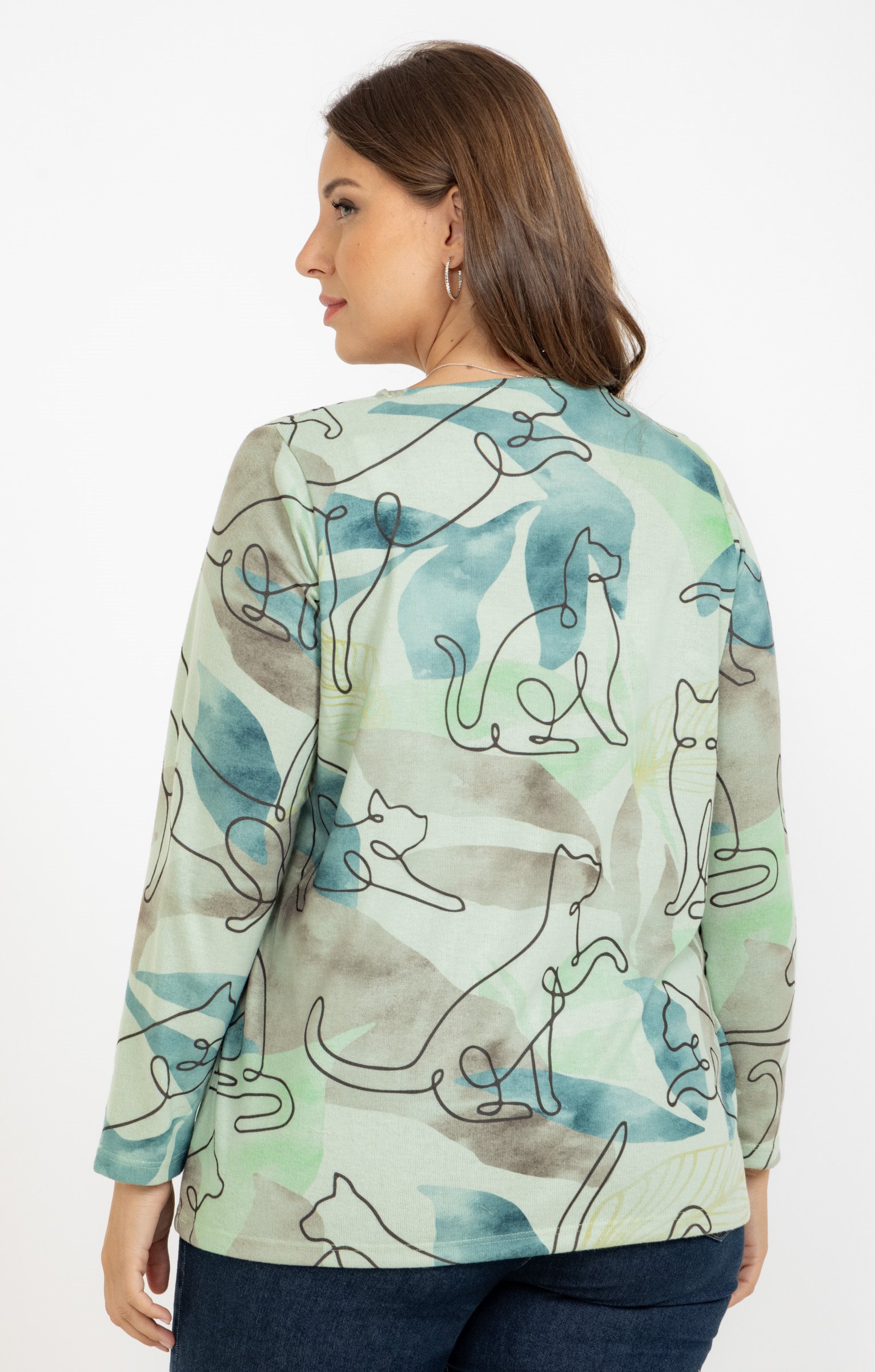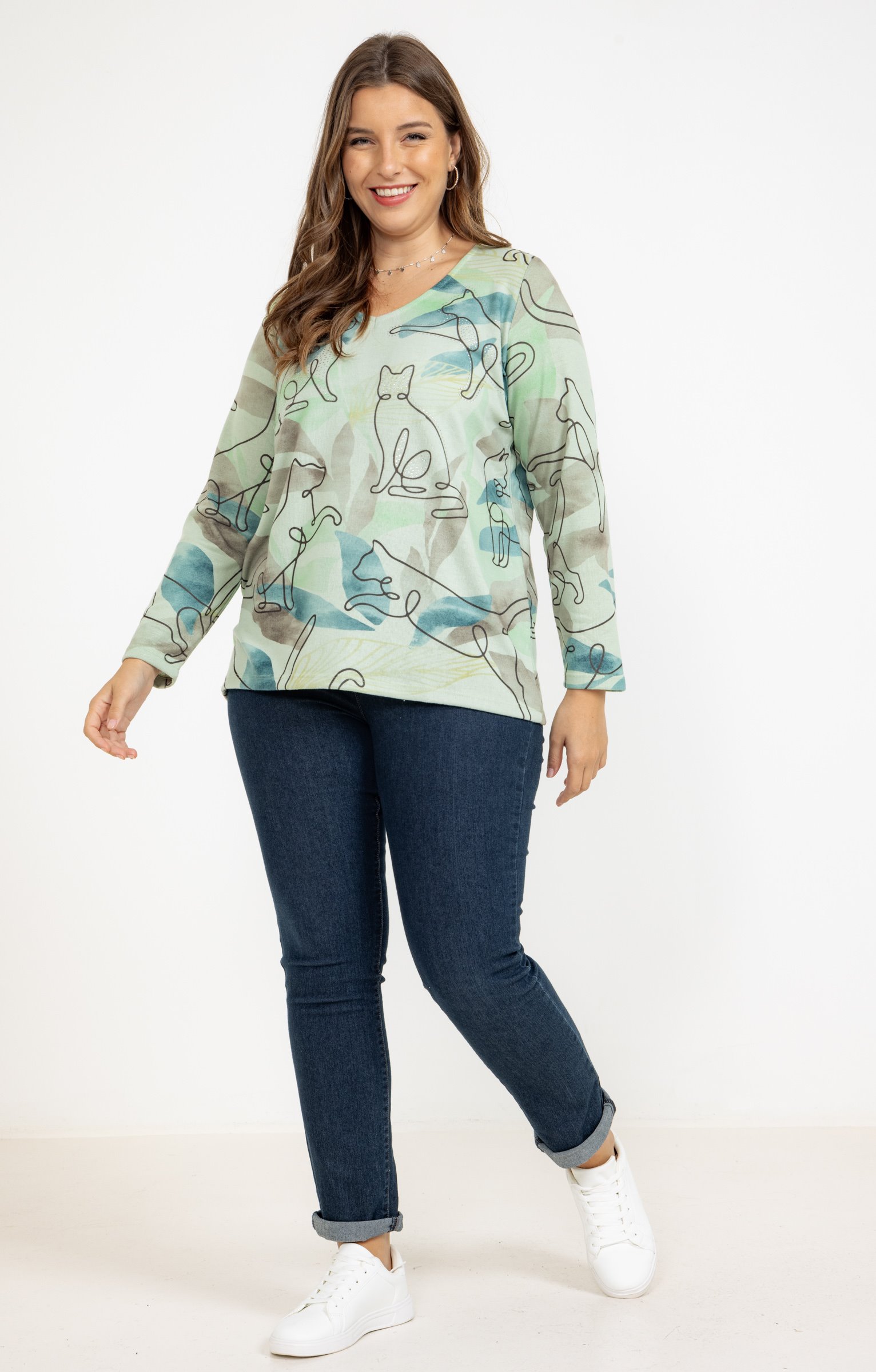 T-shirt en maille chaude imprimé chats avec détails strass à manches longues et col V. Coupe droite. Manches longues. Col V. Imprimé chats. Motifs façon dessin de contour sur fond abstrait effet aquarelle. Détails strass devant. Tissu en maille chaude. Matière extensible. Fines surpiqûres discrètes en finition du modèle. Base droite. Composition contenant du polyester recyclé.