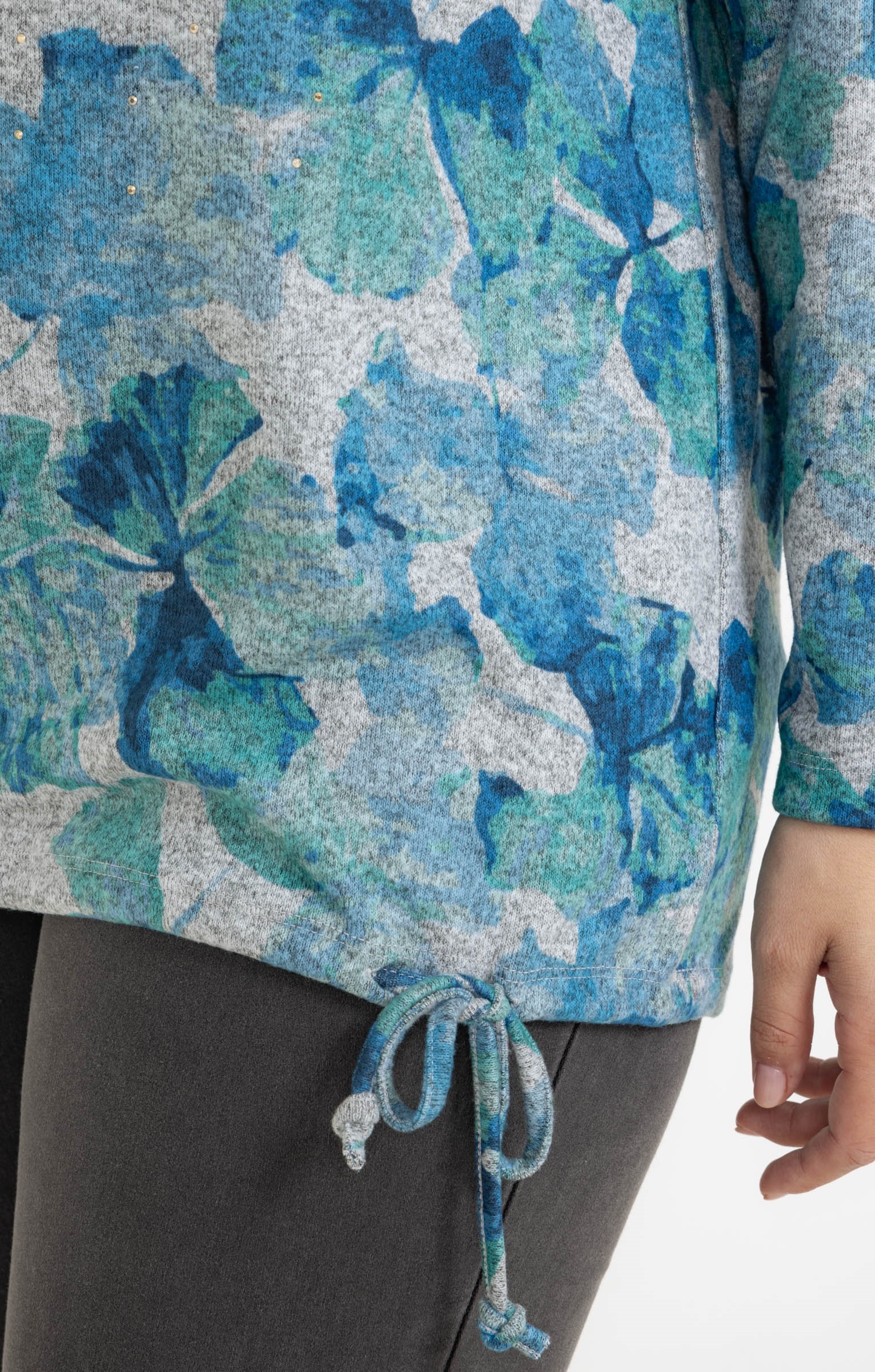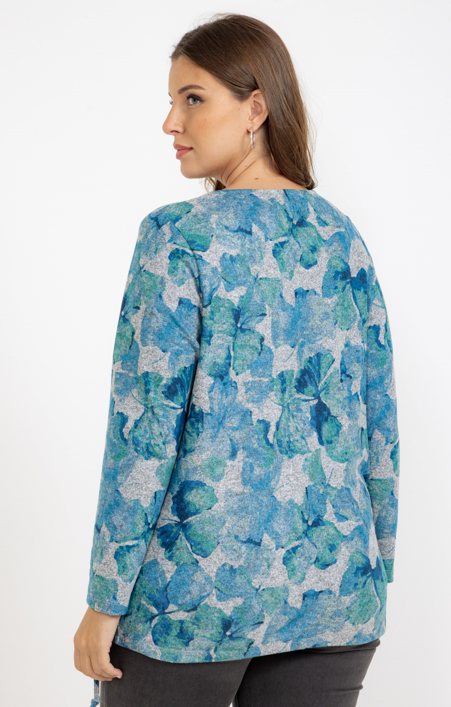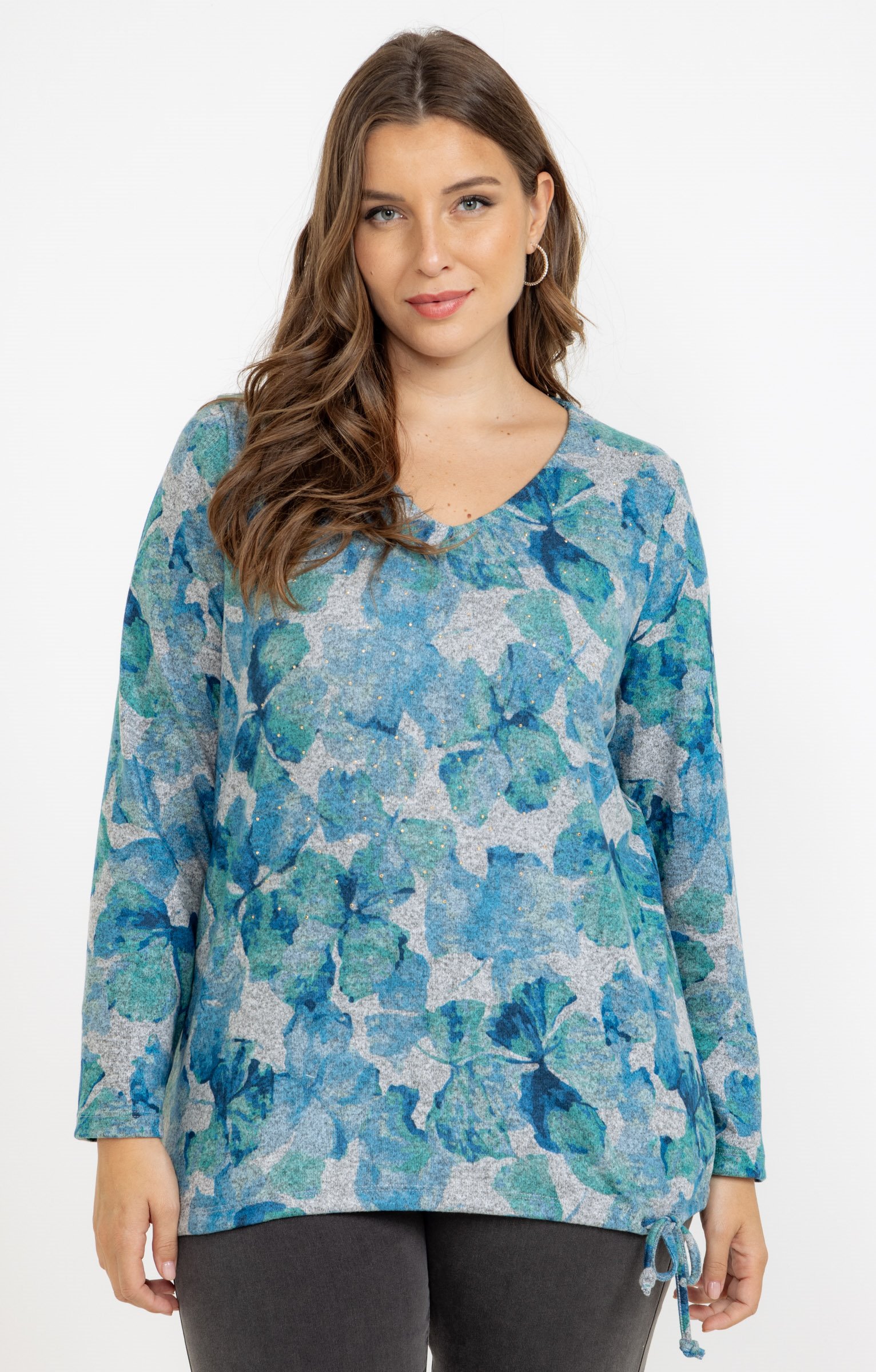 T-shirt avec liens à nouer imprimé feuillage et strass. Coupe droite. Manches longues fuselées. Col V. Imprimé feuillage. Motifs effet aquarelle avec strass devant. Tissu en maille aspect chiné. Matière extensible. Base droite ajustable avec liens coulissants à nouer sur le côté. Composition en polyester recyclé majoritaire.