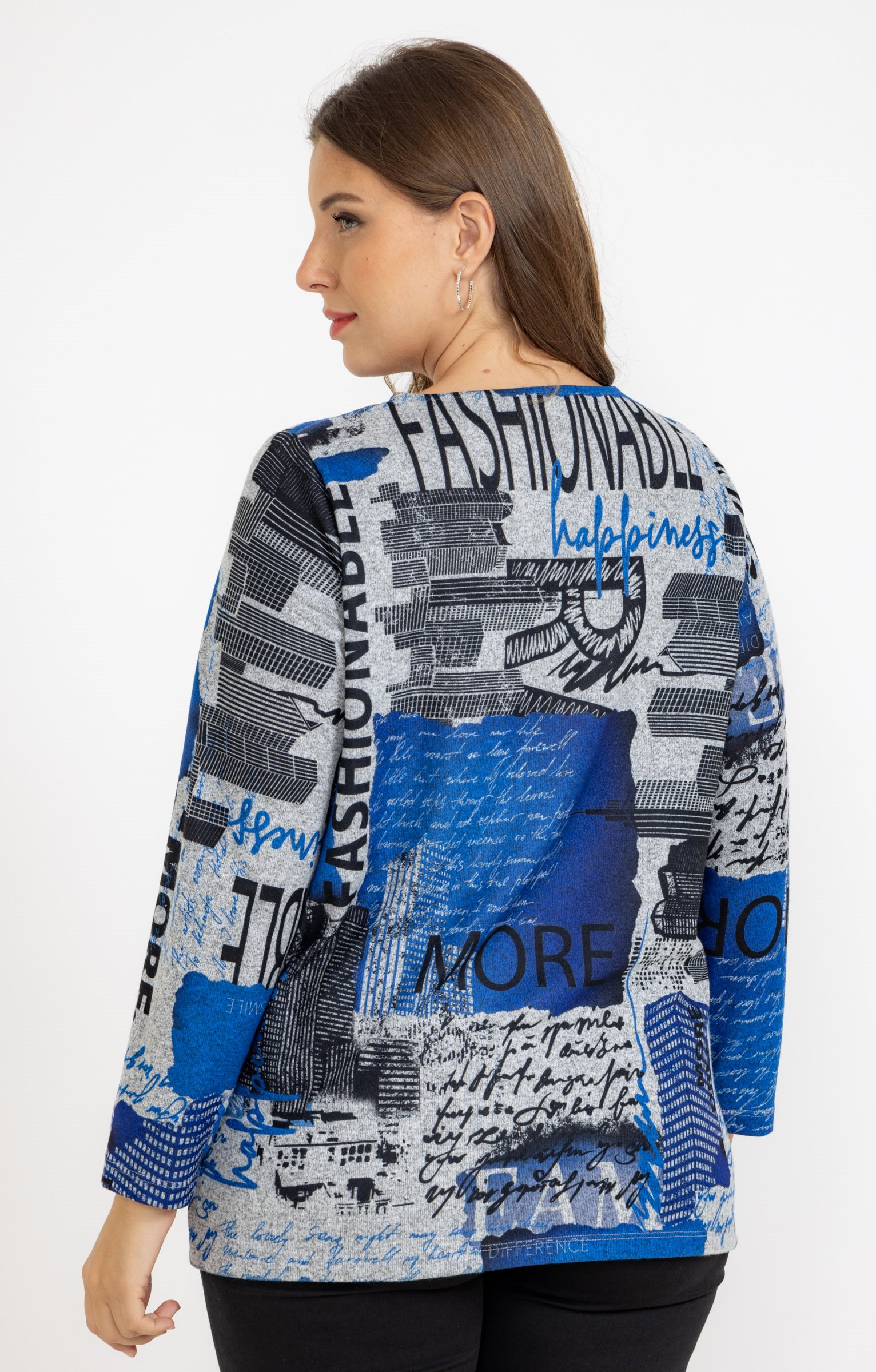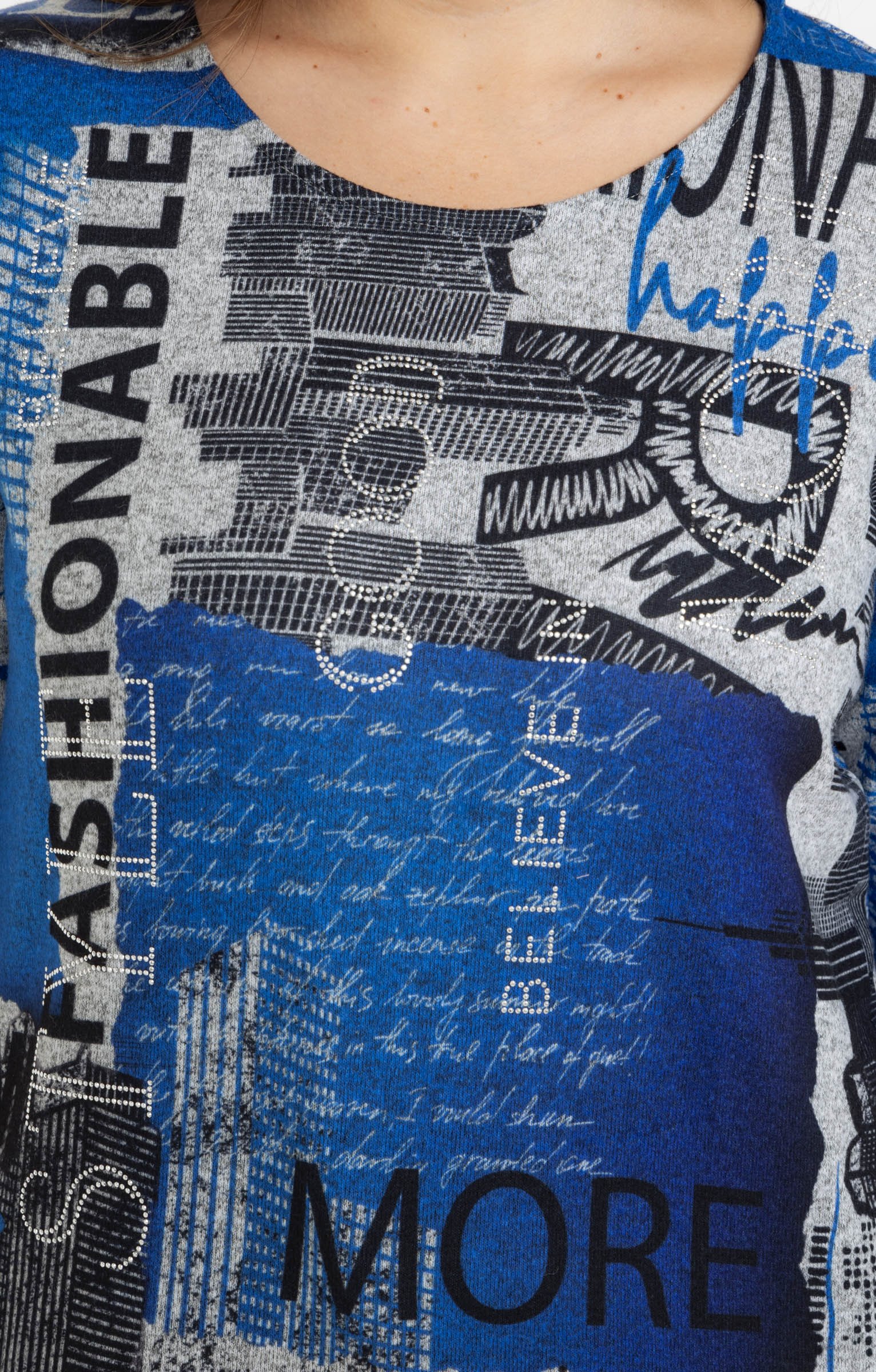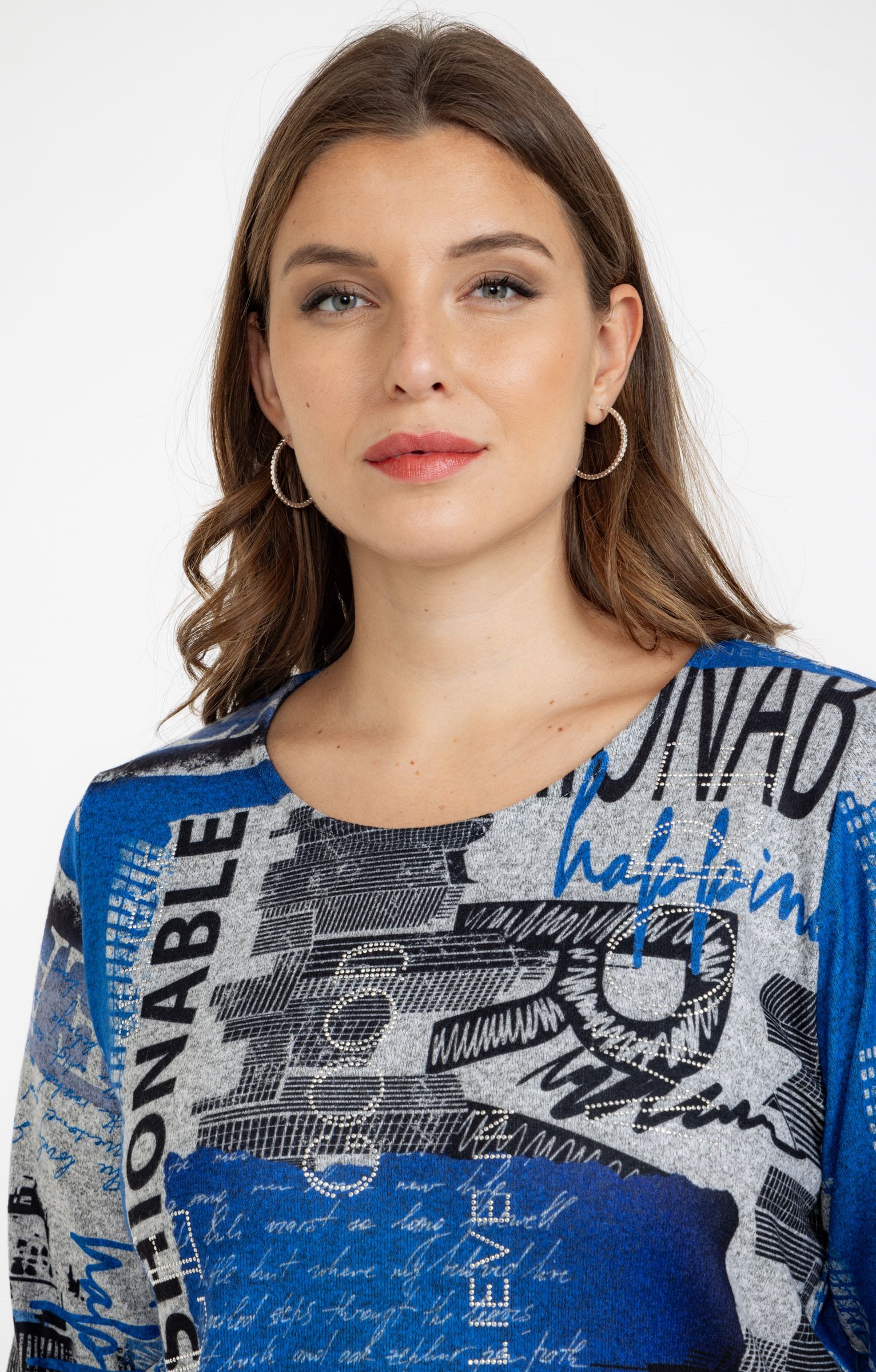 T-shirt en maille chaude imprimé patchwork à manches longues et col rond. Coupe droite. Manches longues. Col rond. Imprimé patchwork. Mix lettrage et motifs graphiques sur toute la surface du modèle avec détails strass devant. Tissu en maille chaude aspect chiné. Matière extensible. Fines surpiqûres discrètes en finition. Base droite. Composition contenant du polyester recyclé.