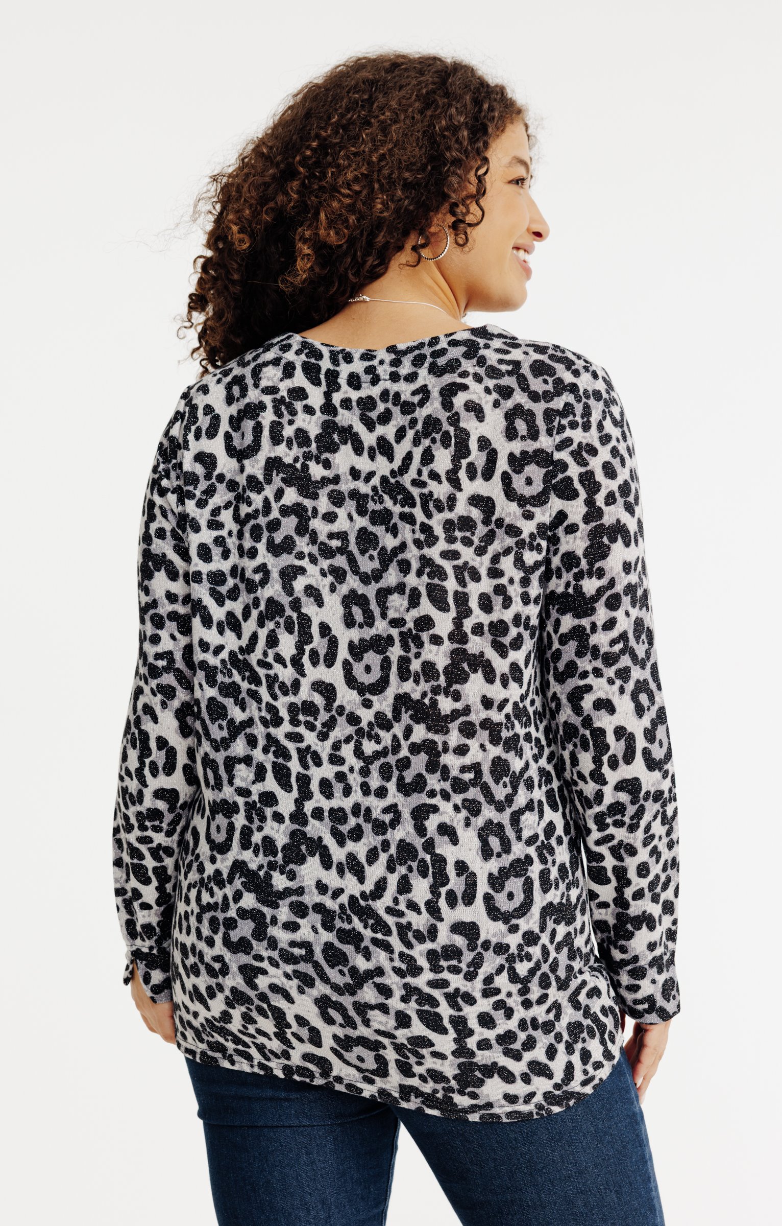 T-shirt à manches longues fendues et col fantaisie imprimé léopard métallisé. Coupe droite. Manches longues montées sur des emmanchures droites. Col rond avec petite découpe V centrée. Tons multicolores. Motif léopard imprimé avec détails métallisés. Maille jersey. Poignets fendus. Base droite. Finition ourlée.