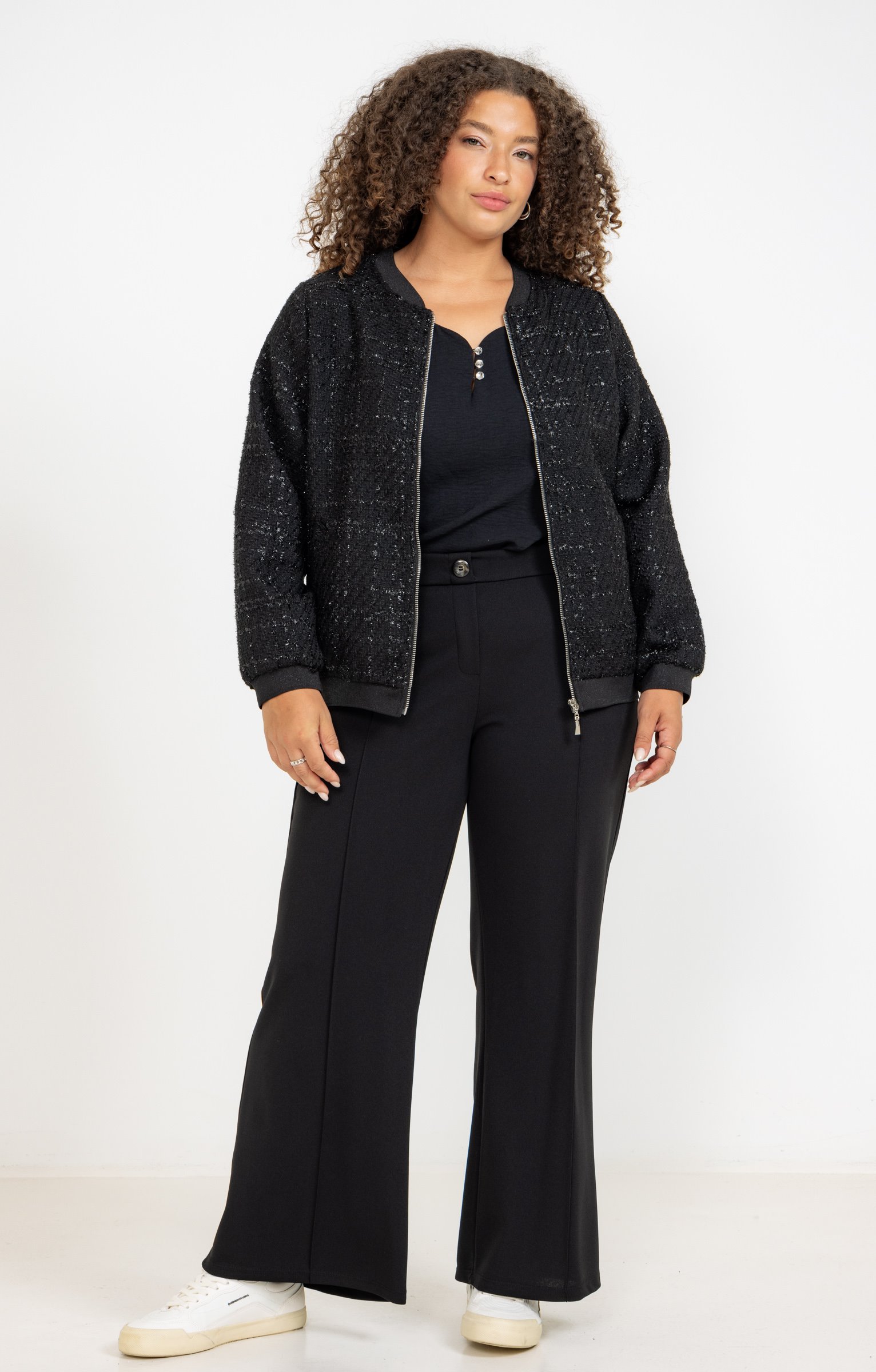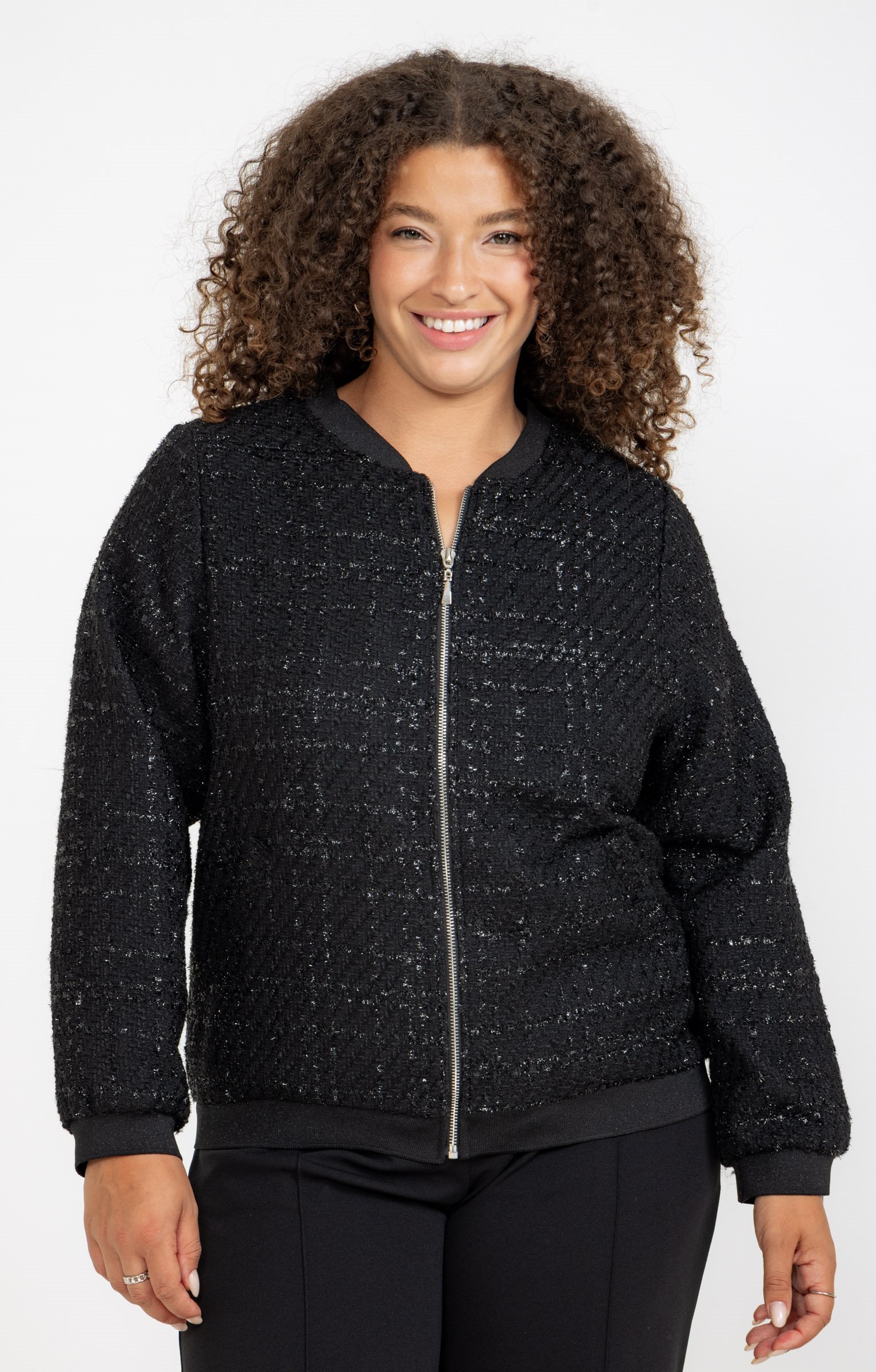 Craquez pour cette veste bomber moderne. Veste courte zippée. Coupe droite. Manches longues à emmanchures droites. Col rond avec petit bord. Fermeture zippée sur le devant. Matière texturée et carreaux façon tweed en maille métallisée. Finition en bords-côtes à la base et aux poignets.