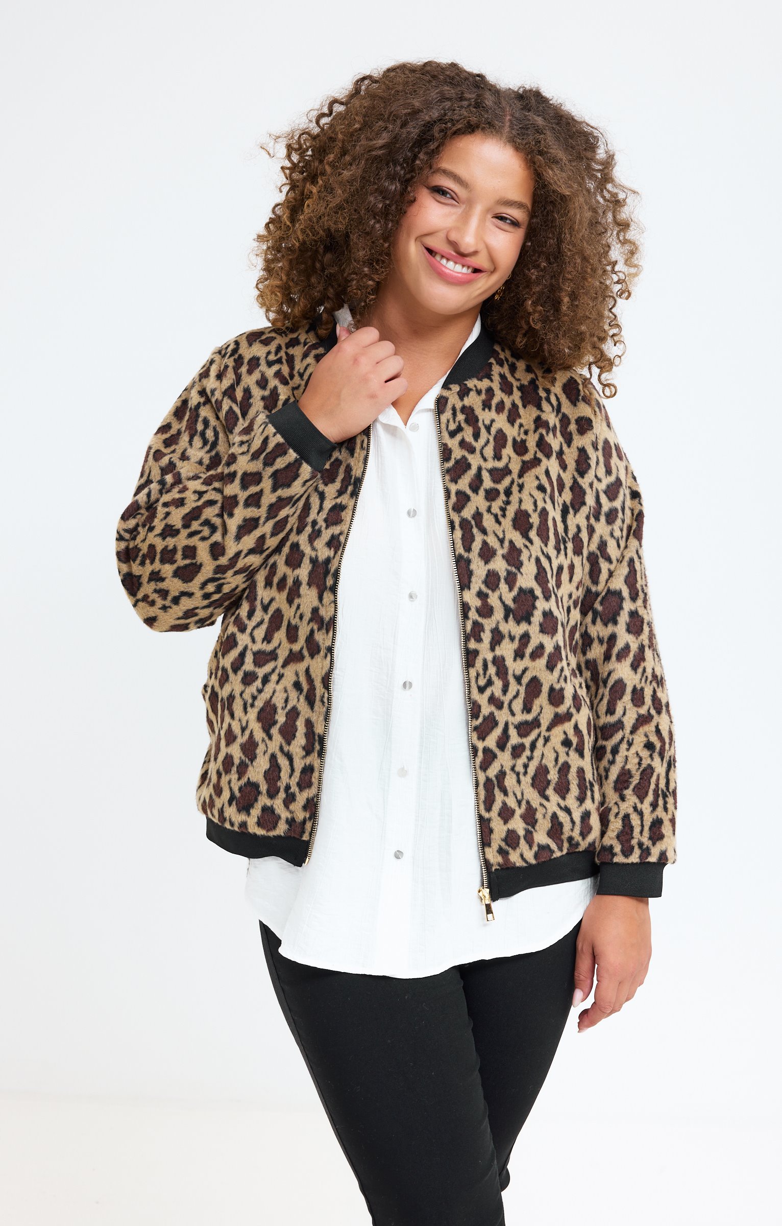 Veste bomber imprimé léopard. Coupe droite. Manches longues. Col rond avec petit bord montant contrastant. Fermeture zippée sur le devant. Imprimé à motif animalier sur l'ensemble du modèle. Matière fourrée douce et chaude. Finitions bords-côtes à la base et aux poignets. Composition contenant de la laine.