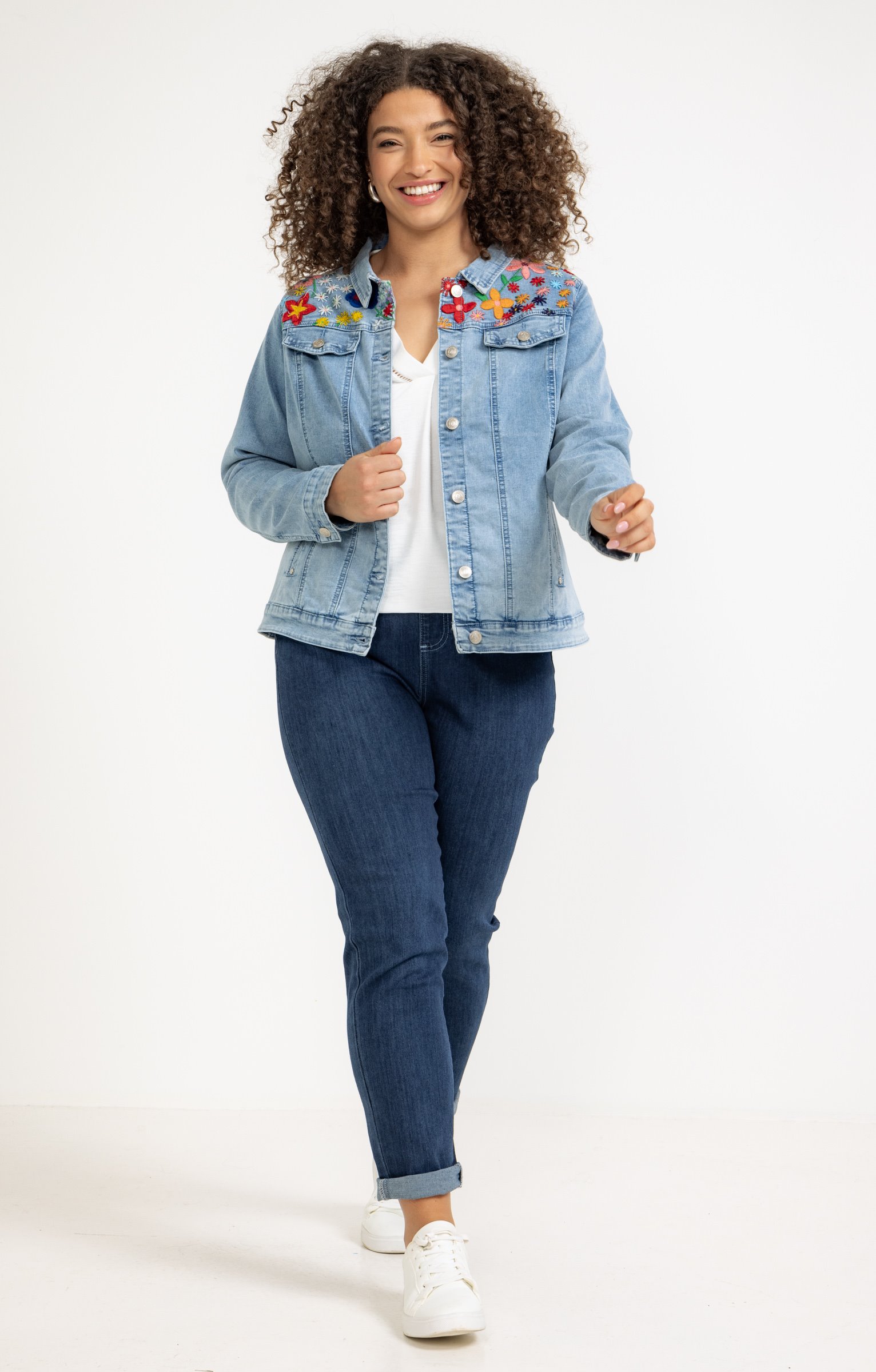 Veste en denim à manches longues avec col chemise. Coupe droite. Fermeture par boutons sur le devant. Détails de broderie colorée en forme de fleurs sur les épaules. Deux poches poitrine à rabat et deux poches latérales ornées de clous en forme de fleurs. Longueur courte. Finitions soignées avec surpiqûres.