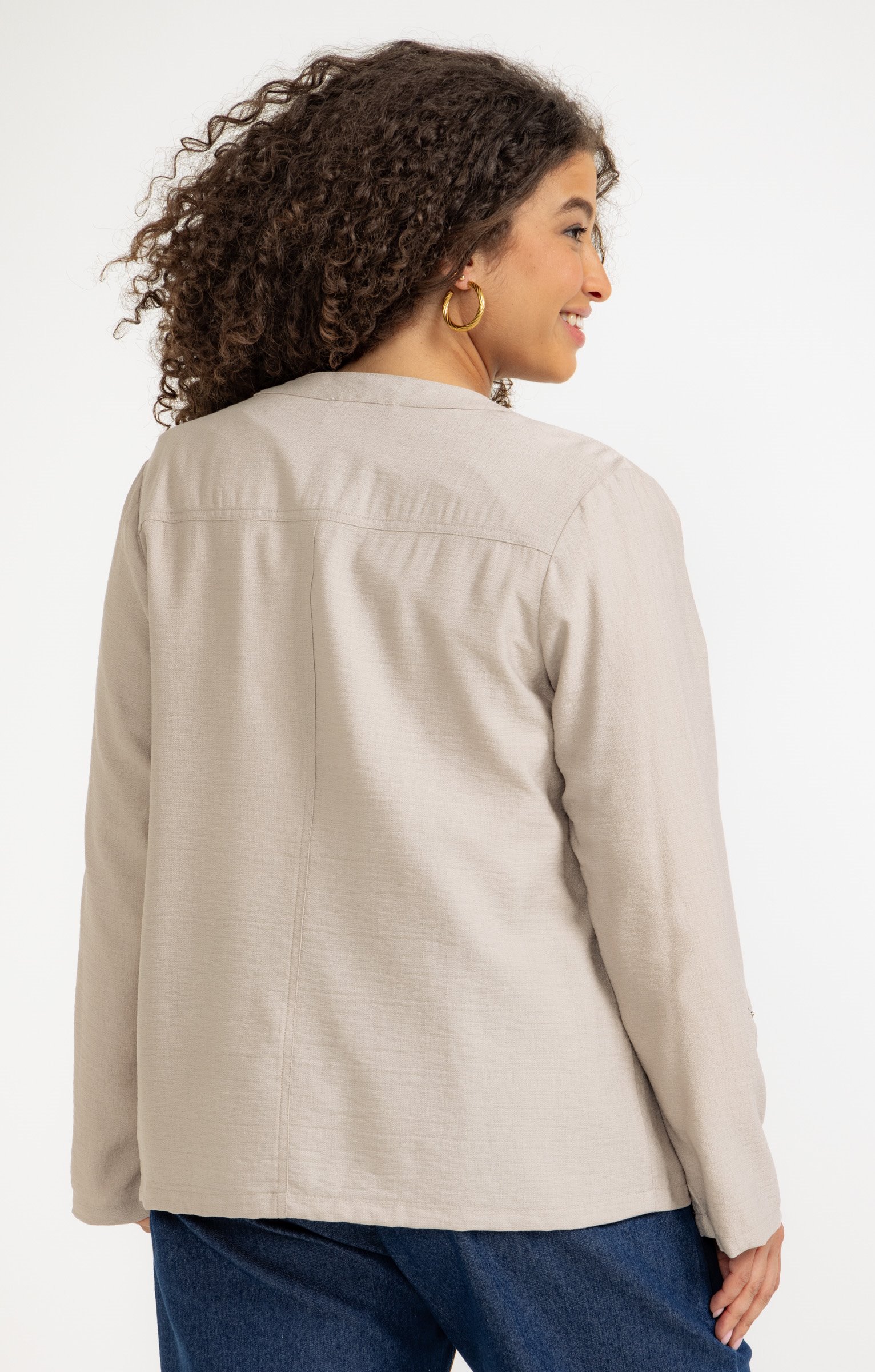 Veste zippée à manches longues. Coupe droite avec col rond. 2 poches plaquées à l'avant ornées de clous. Manches ajustables par un bouton. Longueur mi-longue. Tissu uni avec texture légèrement texturée.